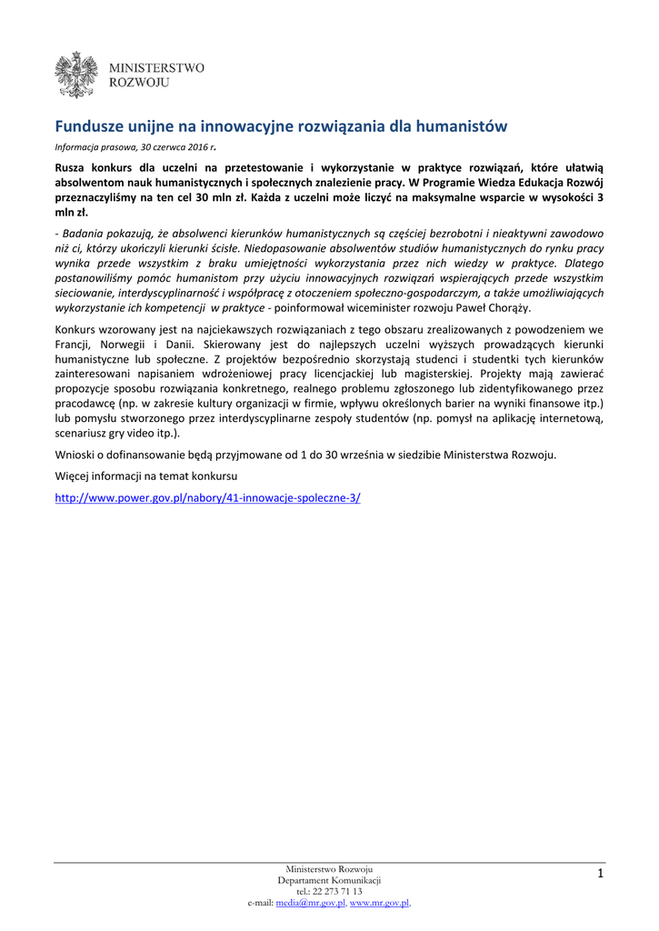 Fundusze unijne na innowacyjne rozwiązania dla humanistów Informacja prasowa, 30 czerwca 2016 r. Rusza konkurs dla uczelni na przetestowanie i wykorzystanie w praktyce rozwiązań, które ułatwią absolwentom nauk humanistycznych i społecznych znalezienie pracy. W Programie Wiedza Edukacja Rozwój przeznaczyliśmy na ten cel 30 mln zł. Każda z uczelni może liczyć na maksymalne wsparcie w wysokości 3 mln zł. - Badania pokazują, że absolwenci kierunków humanistycznych są częściej bezrobotni i nieaktywni zawodowo niż ci, którzy ukończyli kierunki ścisłe. Niedopasowanie absolwentów studiów humanistycznych do rynku pracy wynika przede wszystkim z braku umiejętności wykorzystania przez nich wiedzy w praktyce. Dlatego postanowiliśmy pomóc humanistom przy użyciu innowacyjnych rozwiązań wspierających przede wszystkim sieciowanie, interdyscyplinarność i współpracę z otoczeniem społeczno-gospodarczym, a także umożliwiających wykorzystanie ich kompetencji w praktyce - poinformował wiceminister rozwoju Paweł Chorąży. Konkurs wzorowany jest na najciekawszych rozwiązaniach z tego obszaru zrealizowanych z powodzeniem we Francji, Norwegii i Danii. Skierowany jest do najlepszych uczelni wyższych prowadzących kierunki humanistyczne lub społeczne. Z projektów bezpośrednio skorzystają studenci i studentki tych kierunków zainteresowani napisaniem wdrożeniowej pracy licencjackiej lub magisterskiej. Projekty mają zawierać propozycje sposobu rozwiązania konkretnego, realnego problemu zgłoszonego lub zidentyfikowanego przez pracodawcę (np. w zakresie kultury organizacji w firmie, wpływu określonych barier na wyniki finansowe itp.) lub pomysłu stworzonego przez interdyscyplinarne zespoły studentów (np. pomysł na aplikację internetową, scenariusz gry video itp.). Wnioski o dofinansowanie będą przyjmowane od 1 do 30 września w siedzibie Ministerstwa Rozwoju. Więcej informacji na temat konkursu http://www.power.gov.pl/nabory/41-innowacje-spoleczne-3/ Ministerstwo Rozwoju Departament Komunikacji tel.: 22 273 71 13 e-mail: [email protected], www.mr.gov.pl, 1