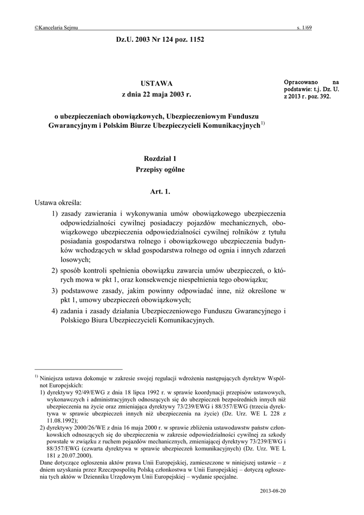 ©Kancelaria Sejmu s. 1/69 Dz.U. 2003 Nr 124 poz. 1152 Opr acowano na podstawie: t.j. Dz. U. z 2013 r . poz. 392. USTAWA z dnia 22 maja 2003 r. o ubezpieczeniach obowiązkowych, Ubezpieczeniowym Funduszu Gwarancyjnym i Polskim Biurze Ubezpieczycieli Komunikacyjnych 1) Rozdział 1 Przepisy ogólne Art. 1. Ustawa określa: 1) zasady zawierania i wykonywania umów obowiązkowego ubezpieczenia odpowiedzialności cywilnej posiadaczy pojazdów mechanicznych, obowiązkowego ubezpieczenia odpowiedzialności cywilnej rolników z tytułu posiadania gospodarstwa rolnego i obowiązkowego ubezpieczenia budynków wchodzących w skład gospodarstwa rolnego od ognia i innych zdarzeń losowych; 2) sposób kontroli spełnienia obowiązku zawarcia umów ubezpieczeń, o których mowa w pkt 1, oraz konsekwencje niespełnienia tego obowiązku; 3) podstawowe zasady, jakim powinny odpowiadać inne, niż określone w pkt 1, umowy ubezpieczeń obowiązkowych; 4) zadania i zasady działania Ubezpieczeniowego Funduszu Gwarancyjnego i Polskiego Biura Ubezpieczycieli Komunikacyjnych. 1) Niniejsza ustawa dokonuje w zakresie swojej regulacji wdrożenia następujących dyrektyw Wspólnot Europejskich: 1) dyrektywy 92/49/EWG z dnia 18 lipca 1992 r. w sprawie koordynacji przepisów ustawowych, wykonawczych i administracyjnych odnoszących się do ubezpieczeń bezpośrednich innych niż ubezpieczenia na życie oraz zmieniająca dyrektywy 73/239/EWG i 88/357/EWG (trzecia dyrektywa w sprawie ubezpieczeń innych niż ubezpieczenia na życie) (Dz. Urz. WE L 228 z 11.08.1992); 2) dyrektywy 2000/26/WE z dnia 16 maja 2000 r. w sprawie zbliżenia ustawodawstw państw członkowskich odnoszących się do ubezpieczenia w zakresie odpowiedzialności cywilnej za szkody powstałe w związku z ruchem pojazdów mechanicznych, zmieniającej dyrektywy 73/239/EWG i 88/357/EWG (czwarta dyrektywa w sprawie ubezpieczeń komunikacyjnych) (Dz. Urz. WE L 181 z 20.07.2000). Dane dotyczące ogłoszenia aktów prawa Unii Europejskiej, zamieszczone w niniejszej ustawie – z dniem uzyskania przez Rzeczpospolitą Polską członkostwa w Unii Europejskiej – dotyczą ogłoszenia tych aktów w Dzienniku Urzędowym Unii Europejskiej – wydanie specjalne. 2013-08-20 ©Kancelaria Sejmu s. 2/69 Art. 2. 1. Określenia użyte w ustawie oznaczają: 1) biuro narodowe – organizację zakładów ubezpieczeń na terytorium danego państwa, które prowadzą działalność ubezpieczeniową w zakresie ubezpieczenia odpowiedzialności cywilnej posiadaczy pojazdów mechanicznych; 2) budynek wchodzący w skład gospodarstwa rolnego – obiekt budowlany o powierzchni powyżej 20 m2 określony w art. 3 pkt 2 ustawy z dnia 7 lipca 1994 r. – Prawo budowlane (Dz. U. z 2010 r. Nr 243, poz. 1623, z późn. zm.2)), będący w posiadaniu rolnika; 3) centralna ewidencja pojazdów – centralną ewidencję pojazdów określoną w art. 80a–80e ustawy z dnia 20 czerwca 1997 r. – Prawo o ruchu drogowym (Dz. U. z 2012 r. poz. 1137 i 1448); 4) gospodarstwo rolne – obszar użytków rolnych, gruntów pod stawami oraz sklasyfikowanych jako użytki rolne gruntów pod zabudowaniami, przekraczający łącznie powierzchnię 1,0 ha, jeżeli podlega on w całości lub części opodatkowaniu podatkiem rolnym, a także obszar takich użytków i gruntów, niezależnie od jego powierzchni, jeżeli jest prowadzona na nim produkcja rolna, stanowiąca dział specjalny w rozumieniu przepisów o podatku dochodowym od osób fizycznych; 5) komisja do rozpatrywania roszczeń – komisję do rozpatrywania roszczeń z tytułu szkód wyrządzonych przez wojska obce, powołaną przez Ministra Obrony Narodowej na podstawie ustawy z dnia 23 września 1999 r. o zasadach pobytu wojsk obcych na terytorium Rzeczypospolitej Polskiej oraz zasadach ich przemieszczania się przez to terytorium (Dz. U. Nr 93, poz. 1063, z późn. zm.3)); 6) organ nadzoru – Komisję Nadzoru Finansowego, o której mowa w ustawie z dnia 21 lipca 2006 r. o nadzorze nad rynkiem finansowym (Dz. U. z 2012 r. poz. 1149, z późn. zm. 4)); 7) organ odszkodowawczy – organ odpowiedzialny za zaspokajanie roszczeń poszkodowanych z tytułu umów ubezpieczenia obowiązkowego, o którym mowa w art. 4 pkt 1, wynikających ze zdarzeń, które zaistniały na terytorium państwa członkowskiego Unii Europejskiej innego niż miejsce zamieszkania poszkodowanego oraz na terytorium państw trzecich, i powstałych w związku z ruchem pojazdów mechanicznych ubezpieczonych i zarejestrowanych w państwie członkowskim Unii Europejskiej; 8) ośrodek informacji – ośrodek gromadzący informacje o umowach obowiązkowego ubezpieczenia odpowiedzialności cywilnej posiadaczy pojazdów mechanicznych oraz informacje o reprezentantach do spraw roszczeń ustanowionych przez zakłady ubezpieczeń; 2) 3) 4) Zmiany tekstu jednolitego wymienionej ustawy zostały ogłoszone w Dz. U. z 2011 r. Nr 32, poz. 159, Nr 45, poz. 235, Nr 94, poz. 551, Nr 135, poz. 789, Nr 142, poz. 829, Nr 185, poz. 1092 i Nr 232, poz. 1377 oraz z 2012 r. poz. 472, 951 i 1256. Zmiany wymienionej ustawy zostały ogłoszone w Dz. U. z 2003 r. Nr 60, poz. 536 i Nr 210, poz. 2036, z 2004 r. Nr 172, poz. 1805, z 2010 r. Nr 122, poz. 825 oraz z 2011 r. Nr 112, poz. 654. Zmiany tekstu jednolitego wymienionej ustawy zostały ogłoszone w Dz. U. z 2012 r. poz. 1166 i 1385 oraz z 2013 r. poz. 70. 2013-08-20 ©Kancelaria Sejmu s. 3/69 9) państwo trzecie – państwo niebędące państwem członkowskim Unii Europejskiej, którego biuro narodowe jest Członkiem Systemu Zielonej Karty; 10) pojazd mechaniczny: a) pojazd samochodowy, ciągnik rolniczy, motorower i przyczepę określone w przepisach ustawy – Prawo o ruchu drogowym, b) pojazd wolnobieżny w rozumieniu przepisów ustawy – Prawo o ruchu drogowym, z wyłączeniem pojazdów wolnobieżnych będących w posiadaniu rolników posiadających gospodarstwo rolne i użytkowanych w związku z posiadaniem tego gospodarstwa; 11) pojazd historyczny 