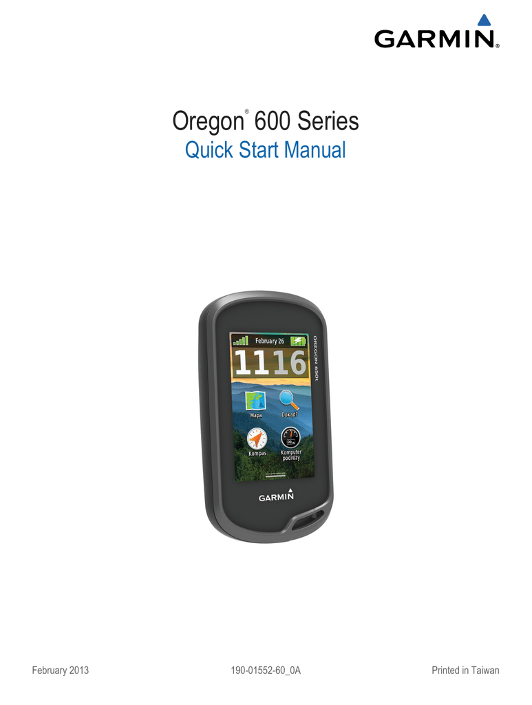 Oregon 600 Series ® Quick Start Manual February 2013 190-01552-60_0A Printed in Taiwan Wstęp OSTRZEŻENIE Należy zapoznać się z zamieszczonym w opakowaniu produktu przewodnikiem Ważne informacje dotyczące bezpieczeństwa i produktu zawierającym ostrzeżenia i wiele istotnych wskazówek. Instalacja baterii NiMH Urządzenie zasilane jest opcjonalną baterią NiMH (tylko modele 650 i 650t) lub dwiema bateriami typu AA (strona 2). 1 Obróć spłaszczone kółko w lewo i pociągnij, aby zdjąć pokrywkę. 2 Wyjmij baterię À z opakowania produktu. Rozpoczęcie pracy z urządzeniem Przy pierwszym użyciu urządzenia wykonaj poniższe czynności w celu skonfigurowania urządzenia i zapoznania się z jego podstawowymi funkcjami. 1 Zainstaluj baterie (strona 2). 2 Włącz urządzenie (strona 3). 3 Zarejestruj urządzenie (strona 5). 4 Odbierz sygnały satelitarne (strona 3). 5 Wybierz , aby wyświetlić stronę stanu (strona 4). 6 Oznacz punkt (strona 3). 7 Rozpocznij nawigację do celu podróży (strona 4). Ogólne informacje o urządzeniu 3 Włóż baterię zgodnie z oznaczeniem biegunów. 4 Delikatnie dociśnij baterię, aby wskoczyła na miejsce. 5 Załóż pokrywkę baterii i obróć spłaszczone kółko w prawo. Ładowanie baterii UWAGA Aby zapobiec korozji, należy całkowicie osuszyć port mini-USB, antenę komunikatów pogodowych i obszary wokół nich przed rozpoczęciem ładowania lub podłączeniem do komputera. Przed podłączeniem prostego złącza kabla USB do urządzenia może być konieczne zdjęcie akcesoriów z opcjonalnego uchwytu. UWAGA: Bateria nie będzie się ładować, jeśli temperatura otoczenia będzie poza zakresem od 0°C do 50°C (od 32°F do 122°F). Baterię można ładować ze standardowego gniazdka elektrycznego lub portu USB w komputerze. 1 Wyciągnij antenę komunikatów pogodowych À z portu miniUSB Á. À Á Â Ã Ä Å Obiektyw aparatu (tylko 650 i 650t) Klawisz zasilania Spłaszczone kółko pokrywki komory Klawisz użytkownika (strona 5) Gniazdo kart microSD™ (pod pokrywką komory baterii) Port mini-USB (pod anteną komunikatów pogodowych) Informacje o baterii OSTRZEŻENIE Zakres temperatur określony dla urządzenia może wykraczać poza dopuszczalny zakres działania niektórych baterii. Baterie alkaliczne mogą wybuchać w wysokiej temperaturze. Nie należy używać ostro zakończonych przedmiotów do wyjmowania baterii. PRZESTROGA Zużytą baterię nienadającą się do dalszego użytku należy przekazać do lokalnego punktu utylizacji i powtórnego przetwarzania odpadów. UWAGA Baterie alkaliczne tracą znaczącą ilość swojej pojemności w miarę spadku temperatury. Dlatego w przypadku korzystania z urządzenia w niskiej temperaturze należy używać baterii litowych. 2 2 Włóż mniejszą wtyczkę kabla USB do portu mini-USB. 3 Podłącz wtyk USB kabla do zasilacza sieciowego lub do portu USB komputera. 4 Podłącz zasilacz sieciowy do zwykłego gniazdka elektrycznego. Po podłączeniu do źródła zasilania urządzenie włączy się. 5 Całkowicie naładuj baterię. Instalowanie baterii typu AA Zamiast opcjonalnej baterii NiMH (strona 2) można użyć dwóch baterii alkalicznych, NiMH lub litowych. Taka możliwość przydaje się w trasie, gdy ładowanie baterii NiMH nie jest możliwe. W celu uzyskania optymalnej wydajności należy używać baterii NiMH lub litowych. UWAGA: Nie zaleca się stosowania standardowych baterii alkalicznych do zasilania modeli Oregon 650 podczas korzystania z funkcji aparatu fotograficznego. 1 Obróć spłaszczone kółko w lewo i pociągnij, aby zdjąć • Przeciągnij lub przesuń palcem w poprzek ekranu, aby przesunąć lub przewinąć ekran. • Zsuń ze sobą dwa palce, aby zmniejszyć obraz. • Rozsuń dwa palce, aby powiększyć obraz. • Każdy wybór ekranu dotykowego powinien stanowić odrębną czynność. • Wybierz , aby zapisać zmiany i zamknąć stronę. • Wybierz , aby zamknąć stronę i powrócić do poprzedniej strony. • Wybierz , aby powrócić do poprzedniej strony. • Przytrzymaj , aby powrócić do menu głównego. • Wybierz , aby zobaczyć elementy menu określone dla wyświetlanej strony. 3 4 5 6 Punkty pokrywkę. 2 Włóż dwie baterie typu AA zgodnie z oznaczeniem biegunów. Załóż pokrywkę baterii i obróć spłaszczone kółko w prawo. Przytrzymaj . Wybierz kolejno Ustawienia > System > Typ baterii AA. Wybierz Alkaliczne, Litowe lub Bateria NiMH. Włączanie urządzenia Przytrzymaj . Odbieranie sygnałów z satelity i rejestrowanie śladu Aby skorzystać z funkcji nawigacji GPS, takiej jak rejestrowanie śladu, należy najpierw odebrać sygnały z satelity. Urządzenie może wymagać czystego widoku nieba w celu odebrania sygnałów z satelitów. Więcej informacji na temat systemu GPS można znaleźć na stronie www.garmin.com/aboutGPS . 1 Przytrzymaj . 2 Zaczekaj, aż urządzenie zlokalizuje satelity. Gdy słupki zmienią kolor na zielony, oznacza to, że urządzenie odebrało sygnały z satelity. Godzina i data są ustawiane automatycznie w oparciu o pozycję GPS. 3 Przejdź się, aby zarejestrować ślad (strona 3). 4 Wybierz opcję: • Wybierz Mapa, aby zobaczyć ślad na mapie. • Wybierz Kompas, aby zobaczyć kompas i pola danych, które można dostosować. • Wybierz Komputer podróży, aby zobaczyć aktualną prędkość, dystans i inne pomocne statystyki. Menu główne Punkty są pozycjami zapisanymi przez użytkownika w urządzeniu. Tworzenie punktu Można zapisać aktualną pozycję jako punkt. 1 Wybierz klawisz użytkownika. Domyślnie klawisz użytkownika oznacza punkt. 2 W razie potrzeby wybierz pole, aby wprowadzić zmiany dla punktu. 3 Wybierz Zapisz. Menu Dokąd? Menu Dokąd? można użyć do wyszukania celu podróży. Nie wszystkie kategorie menu Dokąd? są dostępne na wszystkich obszarach i mapach. Wyszukiwanie miejsca wg nazwy 1 Wybierz kolejno Dokąd? > Punkty > 2 Wpisz nazwę lub jej część. 3 Wybierz . > Szukaj wg liter. Wyszukiwan
