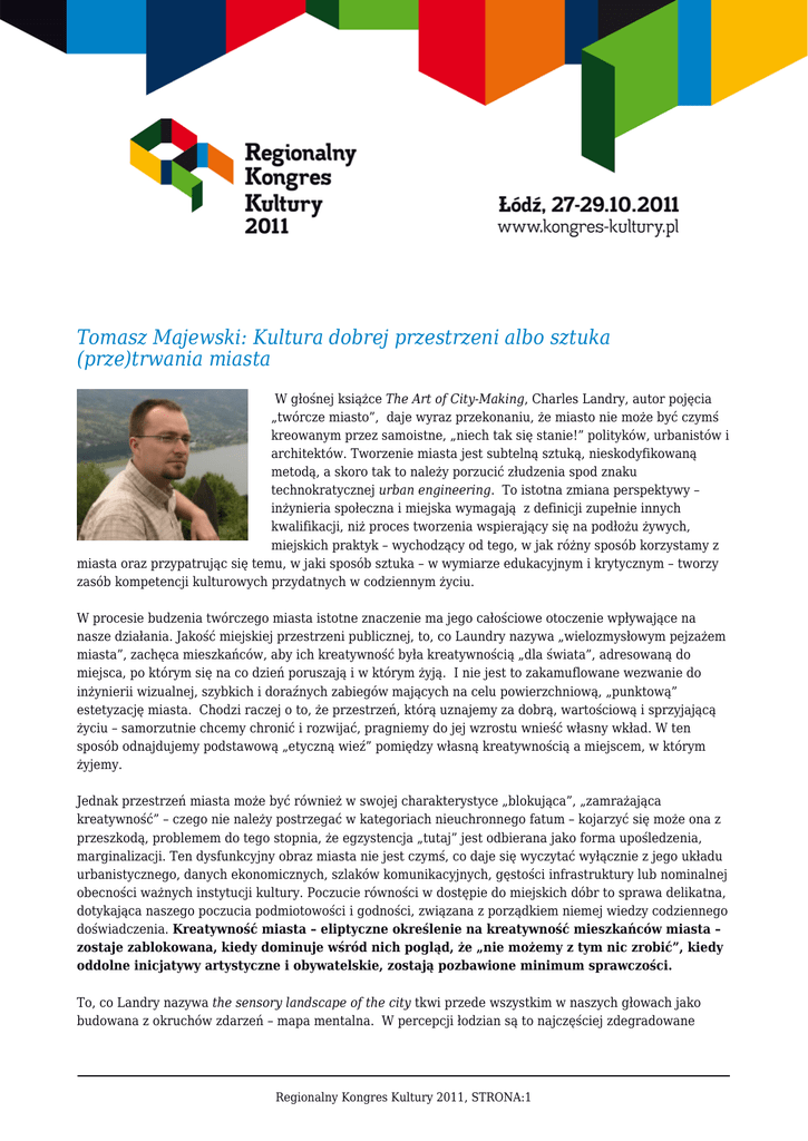 Tomasz Majewski: Kultura dobrej przestrzeni albo sztuka (prze)trwania miasta W głośnej książce The Art of City-Making, Charles Landry, autor pojęcia „twórcze miasto”, daje wyraz przekonaniu, że miasto nie może być czymś kreowanym przez samoistne, „niech tak się stanie!” polityków, urbanistów i architektów. Tworzenie miasta jest subtelną sztuką, nieskodyfikowaną metodą, a skoro tak to należy porzucić złudzenia spod znaku technokratycznej urban engineering. To istotna zmiana perspektywy – inżynieria społeczna i miejska wymagają z definicji zupełnie innych kwalifikacji, niż proces tworzenia wspierający się na podłożu żywych, miejskich praktyk – wychodzący od tego, w jak różny sposób korzystamy z miasta oraz przypatrując się temu, w jaki sposób sztuka – w wymiarze edukacyjnym i krytycznym – tworzy zasób kompetencji kulturowych przydatnych w codziennym życiu. W procesie budzenia twórczego miasta istotne znaczenie ma jego całościowe otoczenie wpływające na nasze działania. Jakość miejskiej przestrzeni publicznej, to, co Laundry nazywa „wielozmysłowym pejzażem miasta”, zachęca mieszkańców, aby ich kreatywność była kreatywnością „dla świata”, adresowaną do miejsca, po którym się na co dzień poruszają i w którym żyją. I nie jest to zakamuflowane wezwanie do inżynierii wizualnej, szybkich i doraźnych zabiegów mających na celu powierzchniową, „punktową” estetyzację miasta. Chodzi raczej o to, że przestrzeń, którą uznajemy za dobrą, wartościową i sprzyjającą życiu – samorzutnie chcemy chronić i rozwijać, pragniemy do jej wzrostu wnieść własny wkład. W ten sposób odnajdujemy podstawową „etyczną wieź” pomiędzy własną kreatywnością a miejscem, w którym żyjemy. Jednak przestrzeń miasta może być również w swojej charakterystyce „blokująca”, „zamrażająca kreatywność” – czego nie należy postrzegać w kategoriach nieuchronnego fatum – kojarzyć się może ona z przeszkodą, problemem do tego stopnia, że egzystencja „tutaj” jest odbierana jako forma upośledzenia, marginalizacji. Ten dysfunkcyjny obraz miasta nie jest czymś, co daje się wyczytać wyłącznie z jego układu urbanistycznego, danych ekonomicznych, szlaków komunikacyjnych, gęstości infrastruktury lub nominalnej obecności ważnych instytucji kultury. Poczucie równości w dostępie do miejskich dóbr to sprawa delikatna, dotykająca naszego poczucia podmiotowości i godności, związana z porządkiem niemej wiedzy codziennego doświadczenia. Kreatywność miasta – eliptyczne określenie na kreatywność mieszkańców miasta – zostaje zablokowana, kiedy dominuje wśród nich pogląd, że „nie możemy z tym nic zrobić”, kiedy oddolne inicjatywy artystyczne i obywatelskie, zostają pozbawione minimum sprawczości. To, co Landry nazywa the sensory landscape of the city tkwi przede wszystkim w naszych głowach jako budowana z okruchów zdarzeń – mapa mentalna. W percepcji łodzian są to najczęściej zdegradowane Regionalny Kongres Kultury 2011, STRONA:1 przestrzenie, które w nużący sposób trzeba omijać, w których – jak się wydaje – nie sposób się zadomowić, uznać ich za swoje aby je twórczo zmieniać, które trzeba nauczyć się „ignorować”, aby przetrwać. Krzywe chodniki, z których unosi się charakterystyczny zapach moczu i psich fekaliów, ulice pozbawione zieleni, pierzeje pełne kamienic nie remontowanych od dekad, czekające, ot tak, na wyburzenie – akt nazywany sarkastycznie w wielu miejscach kraju „łódzką szkołą renowacji”; brud strzępiących się ogłoszeń, rozjeżdżonych, łysych trawników. Upadłe centrum miasta otoczone jest wianuszkiem w miarę komfortowych osiedli zamkniętych, wielkopłytowych blokowisk z PRL oraz mieszczańskich suburbiów. Te wyobrażenia stanowią potencjalną mapę – podstawę codziennych działań (i zaniechań) wielu łodzian. To oczywiście tylko przypuszczenie, bardzo chciałbym, żeby było mylne. Nie przeprowadzono bowiem jak dotąd badań z zakresu mentalnej organizacji informacji przestrzennej w różnych grupach wiekowych, ekonomicznych i społecznych, z uwzględnieniem takich zmiennych jak kapitał kulturowy, poziom wykształcenia. Badania te przeprowadzić wszakżeby należało – zbierając opisy ustne, fotografie, dane frekwencyjne na temat ulubionych miejsc rozrywki, gastronomii i instytucji kultury – nanosząc je na topograficzny schemat miasta. Może warto zobaczyć dlaczego tak wielu mieszkańców widzi to miasto jako „nie-swoje” i swoją kreatywnością obdarza finalnie inne miasta? Może dowiemy się kim jest już w tej chwili adresat nowego centrum Łodzi, i czy wirtualny, słabo zdefiniowany zespół instytucji sztuki, które maja tam powstać, znajdzie się na przecięciu się szlaków obecnych poszukiwań łodzian? Tak się złożyło, że lektura Laundry’ego i jego koncepcja „twórczego miasta” zmusiła mnie do zastanowienia się na tym, dlaczego w ostatnio opublikowanej Diagnozie Społecznej zadowolenie z miejsca zamieszkania zadeklarowało tylko 5 % łodzian, co czynni z Łodzi ewenement wśród dużych polskich miast. Etyczna wieź zadzierzgnięta pomiędzy twórczością i własnym miejscem nie rozwija się – jak wiadomo – tam, gdzie miejsce to uznajemy za „nie nadające się do dobrego życia”. Jeżeli ktoś szuka zalążków prawdziwie „twórczej Łodzi”, niech przemyśli zatem ostatni projekt Muzeum Sztuki – „Ekologie miejskie”. Edukacyjny i krytyczny potencjał sztuki w mieście oraz sztuki dla miasta wyrasta tu z próby przywrócenia mieszkańcom Starego Polesia skrawka „dobrej przestrzeni”: rekultywacji zieleni na skwerze przy Wólczańskiej, zlokalizowanym w miejscu dawnej synagogi. Instytucja sztuki i organizacje społeczne dokonały przez tydzień czegoś, do czego nie była przez lata zdolna zarażona poczuciem niemożności 