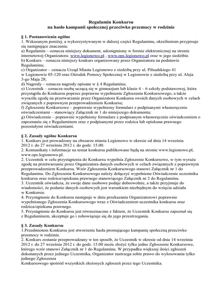 Regulamin Konkursu na hasło kampanii społecznej przeciwko przemocy w rodzinie § 1. Postanowienia ogólne 1. Wskazanym poniżej, a wykorzystywanym w dalszej części Regulaminu, określeniom przypisuje się następujące znaczenia: a) Regulamin – oznacza niniejszy dokument, udostępniony w formie elektronicznej na stronie internetowej Organizatora: www.legionowo.pl , www.ops.legionowo.pl oraz w jego siedzibie. b) Konkurs – oznacza niniejszy konkurs organizowany przez Organizatora na podstawie Regulaminu; c) Organizator – oznacza Urząd Miasta Legionowo z siedzibą przy ul. Piłsudskiego 41 w Legionowie 05-120 oraz Ośrodek Pomocy Społecznej w Legionowie z siedzibą przy ul. Aleja 3-go Maja 28; d) Nagrody – oznacza nagrody opisane w § 4 Regulaminu; e) Uczestnik – oznacza osobę uczącą się w gimnazjum lub klasie 4 – 6 szkoły podstawowej, która przystąpiła do Konkursu poprzez poprawne wypełnienie Zgłoszenia Konkursowego, a także wyraziła zgodę na przetwarzanie przez Organizatora Konkursu swoich danych osobowych w celach związanych z poprawnym przeprowadzeniem Konkursu; f) Zgłoszenie Konkursowe – poprawnie wypełniony formularz z podpisanymi własnoręcznie oświadczeniami – stanowiący Załącznik nr 1 do niniejszego dokumentu; g) Oświadczenie – poprawnie wypełniony formularz z podpisanym własnoręcznie oświadczeniem o zapoznaniu się z Regulaminem oraz z podpisanymi przez rodzica lub opiekuna prawnego pozostałymi oświadczeniami. § 2. Zasady ogólne Konkursu 1. Konkurs jest prowadzony na obszarze miasta Legionowo w okresie od dnia 14 września 2012 r. do 27 września 2012 r. do godz. 15.00. 2. Komunikaty i informacje na temat konkursu publikowane będą na stronie www.legionowo.pl, www.ops.legionowo.pl. 2. Uczestnik w celu przystąpienia do Konkursu wypełnia Zgłoszenie Konkursowe, w tym wyraża zgodę na przetwarzanie przez Organizatora danych osobowych w celach związanych z poprawnym przeprowadzeniem Konkursu. Wzór Zgłoszenia Konkursowego stanowi Załącznik nr 1 do Regulaminu. Do Zgłoszenia Konkursowego należy dołączyć wypełnione Oświadczenie uczestnika konkursu oraz rodzica/opiekuna prawnego stanowiącego Załącznik nr 2 do Regulaminu. 3. Uczestnik oświadcza, że swoje dane osobowe podaje dobrowolnie, a także przyjmuje do wiadomości, że podanie danych osobowych jest warunkiem niezbędnym do wzięcia udziału w Konkursie. 4. Przystąpienie do Konkursu następuje w dniu przekazania Organizatorowi poprawnie wypełnionego Zgłoszenia Konkursowego wraz z Oświadczeniem uczestnika konkursu oraz rodzica/opiekuna prawnego. 5. Przystąpienie do Konkursu jest równoznaczne z faktem, że Uczestnik Konkursu zapoznał się z Regulaminem, akceptuje go i zobowiązuje się do jego przestrzegania. § 3. Zasady Konkursu 1.Przedmiotem Konkursu jest stworzenie hasła promującego kampanię społeczną przeciwko przemocy w rodzinie. 2. Konkurs zostanie przeprowadzany w ten sposób, że Uczestnik w okresie od dnia 14 września 2012 r. do 27 września 2012 r. do godz. 15.00 może złożyć tylko jedno Zgłoszenie Konkursowe, którego wzór stanowi Załącznik nr 1 do Regulaminu. W przypadku większej ilości zgłoszeń dokonanych przez jednego Uczestnika, Organizator zastrzega sobie prawo do wylosowania tylko jednego Zgłoszenia Konkursowego spośród wszystkich złożonych zgłoszeń przez tego Uczestnika. 3. Wypełnione Zgłoszenie Konkursowe wraz z Oświadczeniem należy złożyć w siedzibie Straży Miejskiej w Legionowie ul. Jagiellońska 26b lub w Ośrodku Pomocy Społecznej w Legionowie z siedzibą w Legionowie ul. Aleja 3-go Maja 28 lub poprzez wysłanie Zgłoszenia Konkursowego wraz z Oświadczeniem na adres e-mailowy: [email protected]. 4. Komisja Konkursowa powołana przez Organizatora do dnia 30 września 2012 r. dokona wyboru, spośród prawidłowo wypełnionych i złożonych Zgłoszeń Konkursowych wraz z Oświadczeniem. 5. Ogłoszenie wyników Konkursu zostanie dokonane przez Organizatora w dniu 30 września 2012r. podczas pikniku rodzinnego na terenie placu rekreacyjnego przy ul. Królowej Jadwigi. 6. Dodatkowe informacje na temat Konkursu Uczestnicy mogą uzyskać u Organizatora Konkursu pod numerem telefonu (22) 784 94 04. §4. Nagrody 1. Autorzy dziesięciu najlepszych haseł otrzymają nagrodę rzeczową w postaci upominków promocyjnych. 2. Autor najlepszego hasła zostanie nagrodzony tabletem. 3. Odbiór nagród odbędzie się 30 września 2012 r. podczas pikniku rodzinnego na terenie placu rekreacyjnego przy ul. Królowej Jadwigi. 4. Odbiór nagrody rzeczowej za zwycięskie hasło zostanie potwierdzony pisemnym protokołem odbioru. Wzór protokołu odbioru stanowi Załącznik nr 3 do Regulaminu. 5. Autor zwycięskiego hasła promującego kampanię społeczną przeciwko przemocy w rodzinie nie ma prawa zastrzegania szczególnych cech Nagrody. 6. W razie rezygnacji z Nagrody autorowi najlepszego hasła nie przysługuje żadna rekompensata. Nagroda nie podlega również zamianie na inną nagrodę, świadczenie pieniężne lub inne świadczenie. 7. Autorowi najlepszego hasła przysługuje jedynie Nagroda określona w Regulaminie. § 5 Komisja Konkursowa 1. Prawidłowy przebieg Konkursu zapewnia specjalna komisja („Komisja Konkursowa”). 2. Komisję Konkursową powołuje Organizator, przy uwzględnieniu konieczności zapewnienia bezstronności oraz przejrzystości Konkursu. Członkowie Komisji Konkursowej wyłonią spośród swego grona przewodniczącego. Na każdego członka Komisji Konkursowej przypada jeden głos. 3. W ramach swoich kompetencji Komisja Konkursowa: a) wyłoni autorów najlepszych haseł promujących kampanię przeciwko przemocy w rodzinie, b) będzie czuwać nad prawidłowym przebiegiem Konkursu, c) będzie rozstrzygała wątpliwości pojawiające się w związku z Konkursem, d) będzie interpretowała Regulamin. 4. Posiedzenie Komisji Konkursowej wymaga sporządzenia pisemnego protokołu, który następnie zost