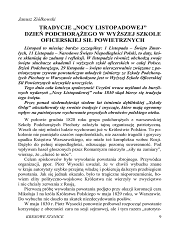 Janusz Ziółkowski TRADYCJE „NOCY LISTOPADOWEJ” DZIEŃ PODCHORĄŻEGO W WYŻSZEJ SZKOLE OFICERSKIEJ SIŁ POWIETRZNYCH Listopad to miesiąc bardzo szczególny: 1 Listopada – Święto Zmarłych, 11 Listopada – Narodowe Święto Niepodległości Polski, to daty, które skłaniają do zadumy i refleksji. W listopadzie również obchodzą swoje święto słuchacze akademii i wyższych szkół oficerskich w całej Polsce. Dzień Podchorążego, 29 listopada – święto nierozerwalnie związane z patriotycznym zrywem powstańczym młodych żołnierzy ze Szkoły Podchorążych Piechoty w Warszawie obchodzone jest w Wyższej Szkole Oficerskiej Sił Powietrznych niezwykle uroczyście. Tego dnia cała lotnicza społeczność Uczelni wraca myślami do burzliwych wydarzeń „Nocy Listopadowej” roku 1830 skąd bierze się tradycja tego święta. Przez ponad siedemdziesiąt siedem lat istnienia dęblińskiej „Szkoły Orląt” ukształtowały się swoiste tradycje i zwyczaje, które mają ogromny wpływ na patriotyczne wychowanie przyszłych obrońców polskiego nieba. W połowie grudnia 1828 roku grupa podchorążych z warszawskiej Szkoły Podchorążych Piechoty założyła tajną organizację patriotyczną. Weszli do niej młodzi ludzie wychowani już w Królestwie Polskim. To pokolenie nie pamiętało czasów napoleońskich, nie zaznało tragedii i goryczy upadku Księstwa Warszawskiego, nie miało też kompleksu wobec Rosji. Dążyło do pełnej niepodległości, odrzucając pozorną suwerenność. Pod wpływem haseł głoszonych przez Romantyzm mierzyło „siły na zamiary”, wierząc, że „chcieć to móc”. Celem spiskowców było wywołanie powstania zbrojnego. Przywódca organizacji, ppor. Piotr Wysocki uważał, że w chwili wybuchu znane w kraju autorytety szybko przejmą władzę i pokierują dalszym przebiegiem powstania. Jak się jednak okazało, było to tragiczne nieporozumienie, bowiem elity polityczno-wojskowe Królestwa nie wierzyły w zwycięstwo i nie chciały zerwania z Rosją. Pierwszą próbę wywołania powstania podjęto przy okazji koronacji cara Mikołaja I na króla Królestwa Polskiego w maju 1829 roku, w Warszawie. Do wybuchu nie doszło na skutek niezdecydowania posłów. W maju 1830 r. Piotr Wysocki ponownie próbował rozpocząć powstanie korzystając z obecności cara na sesji sejmowej, ale i tym razem „autoryteKRESOWE STANICE 9 ty” nie dopuściły do wybuchu powstania. Zrażony tym przywódca spisku zajął się rozbudową konspiracji. Wczesnym latem 1830 r przystąpił do niej ppor. Józef Zaliwski z l pułku piechoty liniowej. Przyczynił się on do zdynamizowania ruchu. Zacieśniono współpracę z cywilami, wśród których wybijał się dziennikarz Maurycy Mochnacki. Nawiązano także kontakty z młodymi oficerami spoza Szkoły Podchorążych. W listopadzie 1830 r policja carska wpadła na trop spisku i rozpoczęły się pierwsze aresztowania. Wieczorem 19 listopada 1830 roku odbyło się zebranie przywódców konspiracji, na którym postanowiono, że decyzję o wybuchu powstania należy uzależnić od wyniku rozmów z cieszącym się olbrzymim szacunkiem i autorytetem wśród młodzieży, historykiem Joachimem Lelewelem. Do spotkania doszło dwa dni później. Uczony wypowiadał się aluzyjnie, co spiskowcy uznali za zachętę do działania. Miał obiecać pomoc przy tworzeniu rządu. Jedynie Mochnacki postulował by sami konspiratorzy wyłonili rząd jeszcze przed rozpoczęciem akcji, opracowali ...ppor. Piotr Wysocki uważał, że program i długofalowy plan działań. w chwili wybuchu znane w kraju Jednak te postulaty zostały odrzucone. autorytety szybko przejmą właLiczono na znanych polityków, takich dzę i pokierują dalszym przebiegiem powstania... jak książę Adam Czartoryski czy generał Józef Chłopicki. Garnizon warszawski liczył ok. 10 tys. żołnierzy polskich i 6,5 tys. rosyjskich. Plan spiskowców przewidywał: - napad grupy złożonej z cywilów na Belweder i zabicie Wielkiego Księcia Konstantego; - rozbrojenie garnizonu rosyjskiego; - opanowanie Arsenału i uzbrojenie ludu Warszawy. Ponieważ oddziały biorące udział w spisku nie posiadały ostrej amunicji, od jej zdobycia uzależniono termin wybuchu powstania. Ostatnie przygotowania w dniu 29 listopada nie zwróciły uwagi ani policji, ani wyższych oficerów. Sygnałem do rozpoczęcia działań przez spiskowców miał być pożar browaru na Solcu (sygnał dla rejonu południowego) i pożar na ulicy Dzi10 KRESOWE STANICE kiej (dla śródmieścia i rejonu północnego). Decydujące znaczenie miało zabicie księcia Konstantego. Jego śmierć uniemożliwiłaby ugodę z carem Mikołajem, polscy politycy i wojskowi musieliby się w tej sytuacji jasno opowiedzieć za powstaniem lub przeciw niemu. Sytuację sprzysiężonych ułatwiło pełnienie wart tego dnia przez 4. pułk piechoty, w którym było sporo członków Związku. Około godziny 17 podchorąży Wiktor Tylski zabrał się nieudolnie do podpalenia browaru. Kilkakrotnie ogień gasł (padał drobny deszcz). W końcu ogień zauważył strażnik z wieży ratuszowej i zaalarmował komendę placu. Pożar ugaszono tak szybko, że nie był on widoczny w punktach gdzie miał stanowić sygnał alarmowy. ...Piotr Wysocki zaalarmował Szkołę Podchorążych Piechoty i z siedziby szkoły, z Łazienek poprowadził ją do miasta... Około godziny 18 dwie kompanie 5. pułku liniowego wyszły na ulicę. Grupa atakująca Belweder, zamiast planowanych 50 członków liczyła jedynie kilkunastu, w większości cywilów niezbyt obeznanych z bronią. Dowodzeni przez Seweryna Goszczyńskiego wtargnęli do Belwederu, ale nie zabili Wielkiego Księcia Konstantego, który zdołał się ukryć. Piotr Wysocki zaalarmował Szkołę Podchorążych Piechoty i z siedziby szkoły, z Łazienek poprowadził ją do miasta, staczając po drodze potyczki z Rosjanami. Jednak spora część polskich oddziałów pozostała wierna Księciu Kons