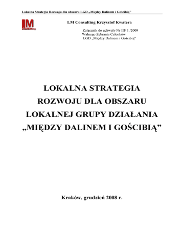 Lokalna Strategia Rozwoju dla obszaru LGD „Między Dalinem i Gościbią” LM Consulting Krzysztof Kwatera Załącznik do uchwały Nr III/ 1 /2009 Walnego Zebrania Członków LGD „Między Dalinem i Gościbią” LOKALNA STRATEGIA ROZWOJU DLA OBSZARU LOKALNEJ GRUPY DZIAŁANIA „MIĘDZY DALINEM I GOŚCIBIĄ” Kraków, grudzień 2008 r. Lokalna Strategia Rozwoju dla obszaru LGD „Między Dalinem i Gościbią” Spis treści SPIS TREŚCI.............................................................................................................................................. 2 1. CHARAKTERYSTYKA LGD JAKO JEDNOSTKI ODPOWIEDZIALNEJ ZA REALIZACJĘ LSR .................. 3 2. OPIS OBSZARU OBJĘTEGO LSR WRAZ Z UZASADNIENIEM JEGO WEWNĘTRZNEJ SPÓJNOŚCI ... 12 3. ANALIZA SWOT DLA OBSZARU OBJĘTEGO LSR, WNIOSKI WYNIKAJĄCE Z PRZEPROWADZONEJ ANALIZY. ............................................................................................................................................... 26 4. OKREŚLENIE CELÓW OGÓLNYCH I SZCZEGÓŁOWYCH LSR ORAZ WSKAZANIE PLANOWANYCH PRZEDSIĘWZIĘĆ SŁUśĄCYCH OSIĄGNIĘCIU POSZCZEGÓLNYCH CELÓW SZCZEGÓŁOWYCH W RAMACH, KTÓRYCH BĘDĄ REALIZOWANE OPERACJE, ZWANYCH DALEJ „PRZEDSIĘWZIĘCIAMI” 29 5. SZCZEGÓŁOWY OPIS PLANOWANYCH PRZEDSIĘWZIĘĆ ............................................................... 33 6. OKREŚLENIE MISJI LGD .................................................................................................................... 37 7. WYKAZANIE SPÓJNOŚCI SPECYFIKI OBSZARU Z CELAMI LSR....................................................... 40 8. UZASADNIENIE PODEJŚCIA ZINTEGROWANEGO DLA PRZEDSIĘWZIĘĆ PLANOWANYCH W RAMACH LSR ........................................................................................................................................ 41 9. UZASADNIENIE PODEJŚCIA INNOWACYJNEGO DLA PRZEDSIĘWZIĘĆ PLANOWANYCH W RAMACH LSR ........................................................................................................................................ 43 9. OKREŚLENIE PROCEDURY OCENY ZGODNOŚCI OPERACJI Z LSR, PROCEDURY WYBORU OPERACJI PRZEZ LGD, PROCEDURY ODWOŁANIA OD ROZSTRZYGNIĘĆ ORGANU DECYZYJNEGO W SPRAWIE WYBORU OPERACJI W RAMACH DZIAŁANIA, O KTÓRYM MOWA W ART. 5 UST. 1 PKT 21 USTAWY Z DNIA 7 MARCA 2007 R. O WSPIERANIU ROZWOJU OBSZARÓW WIEJSKICH Z UDZIAŁEM ŚRODKÓW EUROPEJSKIEGO FUNDUSZU ROLNEGO NA RZECZ ROZWOJU OBSZARÓW WIEJSKICH, KRYTERIÓW, NA PODSTAWIE KTÓRYCH JEST OCENIANA ZGODNOŚĆ OPERACJI Z LSR, ORAZ KRYTERIÓW WYBORU OPERACJI, A TAKśE PROCEDURY ZMIANY TYCH KRYTERIÓW.... 44 KARTA OCENY ZGODNOŚCI OPERACJI Z LSR .............................................................................. 48 10. OKREŚLENIE BUDśETU LSR DLA KAśDEGO ROKU JEJ REALIZACJI ........................................ 51 11. OPIS PROCESU PRZYGOTOWANIA I KONSULTOWANIA LSR ................................................ 54 12. OPIS PROCESU WDRAśANIA I AKTUALIZACJI LSR................................................................. 56 13. ZASADY I SPOSÓB DOKONYWANIA OCENY (EWALUACJI) WŁASNEJ .............................. 58 14. OKREŚLENIE POWIĄZAŃ LSR Z INNYMI DOKUMENTAMI PLANISTYCZNYMI ZWIĄZANYMI Z OBSZAREM OBJĘTYM LSR..................................................................................................................... 59 15. WSKAZANIE PLANOWANYCH DZIAŁAŃ, PRZEDSIĘWZIĘĆ LUB OPERACJI REALIZOWANYCH PRZEZ LGD W RAMACH INNYCH PROGRAMÓW WDRAśANYCH NA OBSZARZE OBJĘTYM LSR..... 64 16. PRZEWIDYWANY WPŁYW REALIZACJI LSR NA ROZWÓJ REGIONU I OBSZARÓW WIEJSKICH.. 65 17. INFORMACJA O DOŁĄCZANYCH ZAŁĄCZNIKACH .................................................................... 66 18. SPIS TABEL ....................................................................................................................................... 66 19. SPIS RYSUNKÓW ............................................................................................................................. 67 2 Lokalna Strategia Rozwoju dla obszaru LGD „Między Dalinem i Gościbią” 1. Charakterystyka LGD jako jednostki odpowiedzialnej za realizację LSR 1) nazwa i status prawny LGD oraz data wpisu do Krajowego Rejestru Sądowego i numer w tym rejestrze; Nazwa: Stowarzyszenie Lokalna Grupa Działania "Między Dalinem i Gościbią" Status prawny: stowarzyszenie z uwzględnieniem zapisów art. 15 ustawy z 7 marca 2007 r. o wspieraniu rozwoju obszarów wiejskich z udziałem środków Europejskiego Funduszu Rolnego na rzecz Rozwoju Obszarów Wiejskich Data wpisu w KRS: 1 września 2008 r. Numer KRS: 0000312740 2) opis procesu budowania partnerstwa; Społeczności obu gmin – Myślenice i Sułkowice podjęły starania o udział w Programie Leader jeszcze na etapie Działania 2.7 Sektorowego Programu Operacyjnego „Restrukturyzacja i modernizacja sektora Ŝywnościowego i rozwój obszarów wiejskich” – „PilotaŜowy Program Leader+”. Gminę Sułkowice obejmowała LGD „Gościniec 4 śywiołów”, która uczestniczyła w Schemacie I PPL+. LGD ta nie mogła wziąć udziału w Schemacie II PPL+, ze względu na zbyt duŜą gęstość zaludnienia. Społeczność gminy Myślenice przystąpiła wraz ze społecznościami innych gmin do budowania LGD „Turystyczna Podkowa”, ale musiała się wycofać, Ŝe względu na zbyt duŜą gęstość zaludnienia – umoŜliwiło to LGD „Turystyczna Podkowa” udział w Schemacie II PPL+. Obecna LGD jest wynikiem współpracy Burmistrzów Sułkowic i Myślenic w zakresie utworzenia Lokalnej Grupy Działania na terenie obu gmin. Inicjatywa ta została potwierdzona decyzjami podjętymi przez organy uchwałodawcze. W dniu 29 kwietnia 2008r. Rada Miejska w Sułkowicach podjęła uchwałę w sprawie wyraŜenia zgody na współpracę partnerską z Gminą Myślenice w zakresie realizacji działań Osi 4 „Leader” Programu Rozwoju Obszarów Wiejskich n