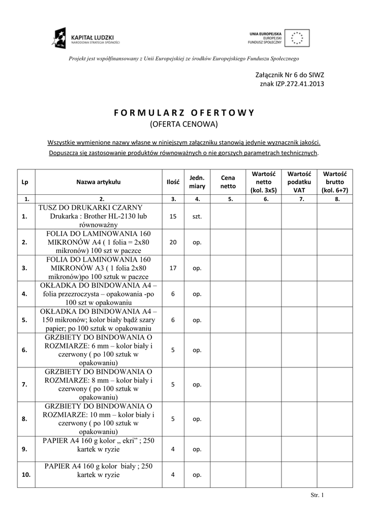 Projekt jest współfinansowany z Unii Europejskiej ze środków Europejskiego Funduszu Społecznego Załącznik Nr 6 do SIWZ znak IZP.272.41.2013 FORMULARZ OFERTOWY (OFERTA CENOWA) Wszystkie wymienione nazwy własne w niniejszym załączniku stanowią jedynie wyznacznik jakości. Dopuszcza się zastosowanie produktów równoważnych o nie gorszych parametrach technicznych. Lp 1. Nazwa artykułu 2. 9. TUSZ DO DRUKARKI CZARNY Drukarka : Brother HL-2130 lub równoważny FOLIA DO LAMINOWANIA 160 MIKRONÓW A4 ( 1 folia = 2x80 mikronów) 100 szt w paczce FOLIA DO LAMINOWANIA 160 MIKRONÓW A3 ( 1 folia 2x80 mikronów)po 100 sztuk w paczce OKŁADKA DO BINDOWANIA A4 – folia przezroczysta – opakowania -po 100 szt w opakowaniu OKŁADKA DO BINDOWANIA A4 – 150 mikronów; kolor biały bądź szary papier; po 100 sztuk w opakowaniu GRZBIETY DO BINDOWANIA O ROZMIARZE: 6 mm – kolor biały i czerwony ( po 100 sztuk w opakowaniu) GRZBIETY DO BINDOWANIA O ROZMIARZE: 8 mm – kolor biały i czerwony ( po 100 sztuk w opakowaniu) GRZBIETY DO BINDOWANIA O ROZMIARZE: 10 mm – kolor biały i czerwony ( po 100 sztuk w opakowaniu) PAPIER A4 160 g kolor ,, ekri” ; 250 kartek w ryzie 10. PAPIER A4 160 g kolor biały ; 250 kartek w ryzie 1. 2. 3. 4. 5. 6. 7. 8. Ilość Jedn. miary 3. 4. 15 szt. 20 op. 17 op. 6 op. 6 op. 5 op. 5 op. 5 op. 4 op. 4 op. Cena netto 5. Wartość netto (kol. 3x5) 6. Wartość podatku VAT Wartość brutto (kol. 6+7) 7. 8. Str. 1 Projekt jest współfinansowany z Unii Europejskiej ze środków Europejskiego Funduszu Społecznego 11. 12. 13. 14. 15. 16. 17. 18. 19. 20. 21. 22. 23. 24. 25. 26. 27. 28. PAPIER A3 280g kolor biały ; 125 kartek w ryzie PAPIER A3 80 g kolor biały ; 500 kartek w ryzie PAPIER SAMOPRZYLEPNY A4 – KOLOR BIAŁY ; po 100 sztuk w paczce PAPIER SAMOPRZYLEPNY A4 – KOLOR neon/fluor kreska ; po 20 sztuk w paczce PAPIER WIZYTÓWKOWY A4 – faktura tłoczenia typu ,,len” kolor biały PAPIER WIZYTÓWKOWY A4 – faktura tłoczenia typu ,,len” kolor ,, ekri” KOSZULKI A4 KRYSTALICZNE; po 100 sztuk w paczce SAMOPRZYLEPNE ZAKŁADKI INDEKSUJĄCE POST –IT25X43mm różowe PŁYTY DVD + KOPERTY Z OKIENKIEM po 10 szt. w paczce SAMOPRZYLEPNE ZAKŁADKI INDEKSUJĄCE POST –IT25X43mm żółte SKOROSZYT DO WPINANIA DO SEGREGATORA A4 SAMOPRZYLEPNE ZAKŁADKI INDEKSUJĄCE POST –IT25X43mm niebieskie KOŁONOTATNIK BEAUTY A4 W KRATKĘ 90 KARTEK PAPIER OPTIK PAPER O GRAMATURZE 90g/m² TAŚMA tesaFilm eco&clear ( 19 mmx10m na podajniku ) lub równoważny TAŚMA BIUROWA NA PODAJNIKU 12mmx10m KLEJ W SZTYFCIE 35g SAMOPRZYLEPNE ZAKŁADKI INDEKSUJĄCE POST-IT DO ARCHIWIZACJI PROSTE DO SZUFLAD KLEJ W TAŚMIE NA NOŚNIKU Z FOLII PET ODPORNEJ NA ZERWANIE ( 8,4mmx14m permanent 4 op. 4 op. 20 Op. 20 Op. 10 op. 10 op. 15 op. 10 op. 15 szt. 10 Op. 200 szt. 10 Op. 20 szt. 25 szt. 30 szt. 25 szt. 8 Op. 25 szt. Str. 2 Projekt jest współfinansowany z Unii Europejskiej ze środków Europejskiego Funduszu Społecznego 29. 30. 31. 32. z wymiennym wkładem ) KOŁONOTATNIKI KEYNOTES INTERNATIONAL GŁADKIE 30 KARTEK A5 SPINACZE W PUDEŁKU MAGNETYCZNYM KOLOROWE / 100SZTUK/OPAKOWANIE 26mm PINEZKI KOLOROWE – OPAKOWANIE 60szt. KOMPLET 4 MARKERÓW+ GĄBKA DO TABLIC SUCHOŚCIERALNYCH 20 szt. 14 Op. 25 Op. 15 kpl. Łączna kwota (brutto) W przypadku oferowania produktów równoważnych/zamiennych w kol. 2 (nazwa artykułu) należy podać nazwę oferowanego produktu. Oświadczam, iż w/w zamienniki tuszy i tonerów są fabrycznie nowe, nieużywane i oryginalnie wyprodukowane przez wskazanych producentów. Ponadto w/w materiały nie powodują ograniczeń funkcji i możliwości sprzętu oraz jakości wydruku wyspecjalizowanych w warunkach technicznych producenta sprzętu. ………………………………………....……..… miejscowość, data ………………………………………..… podpis Str. 3