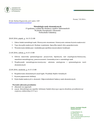 Poznań, 7.03.2016 r. Dr hab. Barbara Pogonowska, prof. nadzw. UEP [email protected] Metodologia nauk ekonomicznych 15-godzinny wykład dla słuchaczy studiów doktoranckich Wydziału Zarządzania i Ekonomii Politechniki Gdańskiej 20.05.2016, piątek, g. 16:15-21:00 1. Zakres badań metodologii nauk. Historycznie niezmienne i historycznie zmienne kryteria naukowości 2. Typy dyscyplin naukowych. Rodzaje wyjaśniania. Specyfika materii sfery gospodarowania 3. Wnioskowania dedukcyjne i niededukcyjne (problem niezawodności konkluzji) 21.05.2016, sobota, g. 8:15-13:00 4. Główne stanowiska epistemologiczne: pozytywizm, hipotetyzm, nurt socjologiczno-historyczny, anarchizm metodologiczny, ponowoczesność i konstruktywizm w metodologii nauk 5. Współczynnik metodologiczno-teoretyczny: założenia ontologiczne i epistemologiczne teorii ekonomicznych 22.05.2016, niedziela, g. 8:15-13:00 6. Respektowanie elementarnych zasad logiki. Przykłady błędów formalnych 7. Kryteria poprawności definicji 8. Etyka badań naukowych w ekonomii. Odpowiedzialność badaczy nauk ekonomicznych. Warunki zaliczenia przedmiotu: obecność na zajęciach esej pt. Metodologiczne aspekty/ dylematy badań dotyczące ujęcia dziedziny przedmiotowej rozprawy doktorskiej (3-5 ss.). Katedra Socjologii i Filozofii Wydział Ekonomii al. Niepodległości 10, 61-875 Poznań tel. +48 061 854 38 85 email: [email protected] www.ue.poznan.pl