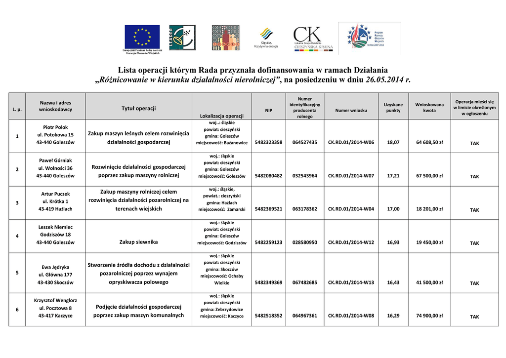 Lista operacji którym Rada przyznała dofinansowania w ramach Działania „Różnicowanie w kierunku działalności nierolniczej”, na posiedzeniu w dniu 26.05.2014 r. L. p. Nazwa i adres wnioskodawcy Tytuł operacji NIP Lokalizacja operacji 1 2 3 4 5 6 Numer identyfikacyjny producenta rolnego Numer wniosku Uzyskane punkty Wnioskowana kwota Operacja mieści się w limicie określonym w ogłoszeniu Zakup maszyn leśnych celem rozwinięcia działalności gospodarczej woj..: śląskie powiat: cieszyński gmina: Goleszów miejscowość: Bażanowice 5482323358 064527435 CK.RD.01/2014-W06 18,07 64 608,50 zł TAK Paweł Górniak ul. Wolności 36 43-440 Goleszów Rozwinięcie działalności gospodarczej poprzez zakup maszyny rolniczej woj.: śląskie powiat: cieszyński gmina: Goleszów miejscowość: Goleszów 5482080482 032543964 CK.RD.01/2014-W07 17,21 67 500,00 zł TAK Artur Puczek ul. Krótka 1 43-419 Hażlach Zakup maszyny rolniczej celem rozwinięcia działalności pozarolniczej na terenach wiejskich woj.: śląskie, powiat.: cieszyński gmina: Hażlach miejscowość: Zamarski 5482369521 063178362 CK.RD.01/2014-W04 17,00 18 201,00 zł TAK Zakup siewnika woj.: śląskie powiat: cieszyński gmina: Goleszów miejscowość: Godziszów 5482259123 028580950 CK.RD.01/2014-W12 16,93 19 450,00 zł TAK Stworzenie źródła dochodu z działalności pozarolniczej poprzez wynajem opryskiwacza polowego woj.: śląskie powiat: cieszyński gmina: Skoczów miejscowość: Ochaby Wielkie 5482349369 067482685 CK.RD.01/2014-W13 16,43 41 500,00 zł TAK Podjęcie działalności gospodarczej poprzez zakup maszyn komunalnych woj.: śląskie powiat: cieszyński gmina: Zebrzydowice miejscowość: Kaczyce 5482518352 064967361 CK.RD.01/2014-W08 16,29 74 900,00 zł TAK Piotr Polok ul. Potokowa 15 43-440 Goleszów Leszek Niemiec Godziszów 18 43-440 Goleszów Ewa Jędryka ul. Główna 177 43-430 Skoczów Krzysztof Wenglorz ul. Pocztowa 8 43-417 Kaczyce 7 8 9 10 Adam Kabiesz ul. Graniczna 8 43-418 Pogwizdów Zainwestowanie w majątek trwały poprzez zakup ciągnika rolniczego celem rozwinięcia działalności gospodarczej. woj.: śląskie, powiat.: cieszyński gmina: Hażlach miejscowość: Brzezówka 5482371877 060272575 CK.RD.01/2014-W01 16,21 74 500,00 zł TAK Małgorzata Musioł ul. Graniczna 15 43-400 Cieszyn, Puńców Rozwinięcie działalności pozarolniczej poprzez wynajem i dzierżawę maszyny celem zainwestowania w majątek trwały woj.: śląskie powiat: cieszyński gmina: Goleszów miejscowość: Puńców 5481185902 032198731 CK.RD.01/2014-W11 16,07 22 400,00 zł TAK Jerzy Glajcar ul. Kojkowicka 3 43-400 Cieszyn, Puńców Rozwinięcie działalności pozarolniczej poprzez wynajem i dzierżawę maszyny rolniczej woj.: śląskie powiat: cieszyński gmina: Goleszów miejscowość: Puńców 5482217886 063180592 CK.RD.01/2014-W09 15,86 74 900,00 zł TAK Czystość i ekologia woj..: śląskie powiat: cieszyński gmina: Dębowiec miejscowość: Iskrzyczyn 5481219110 021439292 CK.RD.01/2014-W10 15,86 25 000,00 zł TAK Ewa Chwastek ul. Wiejska 1 43-426 Dębowiec