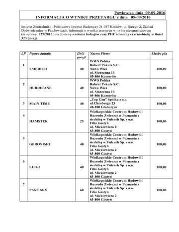Pawłowice, dnia 09-09-2016 INFORMACJA O WYNIKU PRZETARGU z dnia 05-09-2016 Instytut Zootechniki - Państwowy Instytut Badawczy 31-047 Kraków, ul. Sarego 2, Zakład Doświadczalny w Pawłowicach, informuje o wyniku przetargu w trybie nieograniczonym (nr sprawy: 227/2016 ) na dostawę nasienia buhajów rasy PHF odmiany czarno-białej w ilości 325 porcji. LP Nazwa buhaja Ilość porcji 1 EMERICH 40 HURRICANE 40 MAIN TIME 40 HAMSTER 25 GERONIMO 40 LUIGI 40 PART SEX 60 2 3 4 5 6 7 Nazwa Firmy WWS Polska Robert Pakuła S.C. Nowa Wieś ul. Słoneczna 10 05-806 Komorów WWS Polska Robert Pakuła S.C. Nowa Wieś ul. Słoneczna 10 05-806 Komorów „Top Gen” Spółka z o.o. ul.Chrobrego 23 48-100 Głubczyce Wielkopolskie Centrum Hodowli i Rozrodu Zwierząt w Poznaniu z siedzibą w Tulcach Sp. z o.o. Filia Gostyń ul. Mickiewicza 2 63-800 Gostyń Wielkopolskie Centrum Hodowli i Rozrodu Zwierząt w Poznaniu z siedzibą w Tulcach Sp. z o.o. Filia Gostyń ul. Mickiewicza 2 63-800 Gostyń Wielkopolskie Centrum Hodowli i Rozrodu Zwierząt w Poznaniu z siedzibą w Tulcach Sp. z o.o. Filia Gostyń ul. Mickiewicza 2 63-800 Gostyń Wielkopolskie Centrum Hodowli i Rozrodu Zwierząt w Poznaniu z siedzibą w Tulcach Sp. z o.o. Filia Gostyń ul. Mickiewicza 2 63-800 Gostyń Liczba pkt 100,00 100,00 100,00 100,00 100,00 100,00 100,00 8 ALTASABRE 40 Alta Polska Sp.z o.o. ul. Katarzynów 3 99-400 Łowicz W wyniku przetargu wybrano ofertę nr 1,2,3,4,5,6,7,8. 100,00