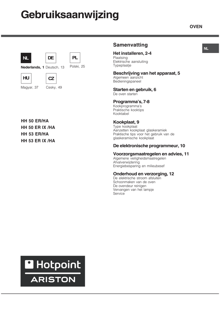 Gebruiksaanwijzing OVEN Samenvatting NL DE Nederlands, 1 Deutsch, 13 HU Magyar, 37 CZ Cesky, 49 PL Polski, 25 Het installeren, 2-4 Plaatsing Elektrische aansluiting Typeplaatje Beschrijving van het apparaat, 5 Algemeen aanzicht Bedieningspaneel Starten en gebruik, 6 De oven starten Programmas, 7-8 Kookprogrammas Praktische kooktips Kooktabel HH 50 ER/HA HH 50 ER IX /HA HH 53 ER/HA HH 53 ER IX /HA Kookplaat, 9 Type kookplaat Aanzetten kookplaat glaskeramiek Praktische tips voor het gebruik van de glaskeramische kookplaat De elektronische programmeur, 10 Voorzorgsmaatregelen en advies, 11 Algemene veiligheidsmaatregelen Afvalverwijdering Energiebesparing en milieubesef Onderhoud en verzorging, 12 De elektrische stroom afsluiten Schoonmaken van de oven De ovendeur reinigen Vervangen van het lampje Service NL Het installeren Bewaar dit boekje zorgvuldig voor eventuele verdere raadpleging. Wanneer u het product weggeeft, verkoopt, of wanneer u verhuist, dient u dit boekje bij de oven te bewaren zodat alle nodige informatie voorhanden blijft. Lees de gebruiksaanwijzingen zorgvuldig door: er staat belangrijke informatie in over installatie, gebruik en veiligheid. Ventilatie Om een goede ventilatie te kunnen garanderen is het noodzakelijk de achterkant van het meubel te verwijderen. Het verdient de voorkeur de oven op twee houten balken te plaatsen, of eventueel op een enkele plank die een opening heeft van tenminste 45 x 560 mm (zie afbeeldingen). Plaatsing Het verpakkingsmateriaal is niet bestemd voor kinderen en dient daarom te worden weggegooid volgens de geldende normen (zie Voorzorgsmaatregelen en advies). De installatie moet worden uitgevoerd door een bevoegde installateur en volgens de instructies van de fabrikant. Een verkeerde installatie kan schade berokkenen aan personen, dieren of dingen. Inbouw Voor een goede werking van het apparaat moet het keukenmeubel de juiste kenmerken hebben: 560 mm . 45 m m. Centreren en bevestigen Om het apparaat aan het keukenkastje te bevestigen: open de ovendeur en schroef de 4 houtschroeven in de 4 gaten in de zijrand. de zijkanten van de kastjes die aan de oven grenzen moeten hittebestendig zijn; in het bijzonder moet, in geval van meubels met fineer, de lijm bestand zijn tegen temperaturen van 100°C; voor het inbouwen van de oven, zowelonder het aanrecht (zie figuur) alsin stapelbouw, dient het meubel de volgende afmetingen te hebben: 580 39 500 +4 0 -0 Alle beschermende onderdelen moeten zodanig worden bevestigd dat ze niet kunnen worden verwijderd zonder gereedschap te gebruiken. 560 +4 -0 48 in m in m 45 572 23 7 54 575-585 min 555 15 595 558 min 54 53 NL 595 Nadat het apparaat is ingebouwd, mag er geen contact meer mogelijk zijn met de elektrische onderdelen. Het energieverbruik dat staat aangegeven op het typeplaatje is gebaseerd op dit soort installatie. 2 Elektrische aansluiting NL 400V 3N~H05RR-F 5x2.5 CEI-UNEL 35363 N L1 L2 L3 1 3 5 De keuken moet aan het elektrische net worden aangesloten. Deze functioneert met de wisselstroom, de spanning en de frequentie die aangegeven staan op het typeplaatje (zie volgende pagina). De kookplaat wordt aan het fornuis verbonden met een speciale aansluiting. Het klemmenbord is ingesteld voor een verbinding op 400 V driefasenstroom (zie afbeeldingen onder). INBOUWPLAAT 2 4 Slechts op enkele modellen aanwezig P N BLAUW WIT ROOD GEEL L1 GROEN L2 L3 INBOUWFORNUIS Nadat u de kookplaat heeft aangesloten, dient u de metalen bescherming weer op zijn plaats te doen. Als de kookplaat wordt verwijderd moet u de rode dop, die oorspronkelijk op de rode connector zat, weer op zijn plaats doen. Monteren voedingskabel Als de elektrische installatie andere eigenschappen heeft (zie afbeeldingen onder), dient u de elektrische verbinding tot stand te brengen door middel van de verbindings-U-bouten in doos P. 230V ~H05RR-F 3x4 CEI-UNEL 35363 N 1 3 2 4 400V 2N~H05RR-F 4x4 CEI-UNEL 35363 L1 L2 1 3 2 4 3. Verwijder de schroeven van de en contacten L-Nbevestig de draden onder de koppen van de schroeven met inachtneming van de kleuren: Blauw (N) Bruin (L) Geel-Groen ( ). N 5 2. Draai de schroef van de kabelklem los en verwijder hem met behulp van een schroevendraaier (zie afbeelding). 5 1. Licht de lipjes aan de zijkant van het deksel van het klemmenbord op met een schroevendraaier: trek het deksel van het klemmenbord open (zie afb.). L 3. Maak de voedingskabel vast aan de speciale kabelklem. 4. Maak het deksel van het klemmenbord dicht. 3 NL Het aansluiten van de voedingskabel aan het net Gebruik voor de voedingskabel een stekker die genormaliseerd is voor de lading aangegeven op het typeplaatje(zie hiernaast). Wanneer het apparaat rechtstreeks op het net wordt aangesloten moet men tussen het apparaat en het net een meerpolige schakelaar aanbrengen met een afstand tussen de contacten van minstens 3mm, aangepast aan het elektrische vermogen en voldoend aan de geldende normen (de aarding mag niet worden onderbroken door de schakelaar). De voedingskabel moet zodanig geplaatst worden dat hij nergens een temperatuur bereikt die 50°C hoger is dan de kamertemperatuur. De installateur is verantwoordelijk voor de correcte elektrische verbinding en het in acht nemen van de geldende veiligheidsnormen. Vóór het aansluiten moet u controleren dat: het stopcontact geaard is en voldoet aan de geldende normen; het stopcontact in staat is het maximale vermogen van het apparaat te verdragen, zoals aangegeven op het typeplaatje (zie onder); de spanning zich bevindt tussen de waarden die staan aangegeven op het typeplaatje (zie onder); het stopcontact en de stekker overeenkomen. Als dat niet zo is, dient u ofwel de stekker ofwel het stopcontact te vervangen; gebruik geen verlengsnoeren of dubbelstekkers. Wanneer het apparaat geïnstalleerd is, moeten de snoer en het stopcontact makkelijk te bereiken zijn. De kabel mag niet worden gebogen of samengedrukt. TYPEPLAATJE Afmetingen breedte 43,5 cm. hoogte 32 cm. diepte 41,5 cm. Inhoud liter 58 Elektrisc