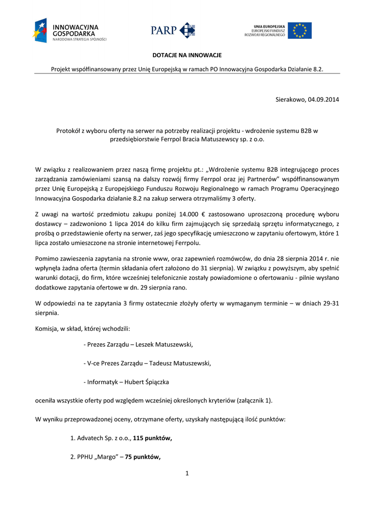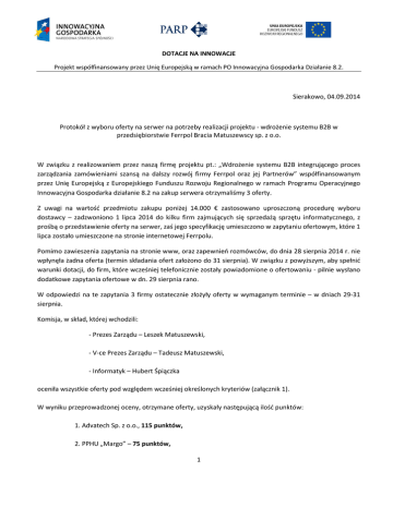 DOTACJE NA INNOWACJE Projekt współfinansowany przez Unię Europejską w ramach PO Innowacyjna Gospodarka Działanie 8.2. Sierakowo, 04.09.2014 Protokół z wyboru oferty na serwer na potrzeby realizacji projektu - wdrożenie systemu B2B w przedsiębiorstwie Ferrpol Bracia Matuszewscy sp. z o.o. W związku z realizowaniem przez naszą firmę projektu pt.: „Wdrożenie systemu B2B integrującego proces zarządzania zamówieniami szansą na dalszy rozwój firmy Ferrpol oraz jej Partnerów” współfinansowanym przez Unię Europejską z Europejskiego Funduszu Rozwoju Regionalnego w ramach Programu Operacyjnego Innowacyjna Gospodarka działanie 8.2 na zakup serwera otrzymaliśmy 3 oferty. Z uwagi na wartość przedmiotu zakupu poniżej 14.000 € zastosowano uproszczoną procedurę wyboru dostawcy – zadzwoniono 1 lipca 2014 do kilku firm zajmujących się sprzedażą sprzętu informatycznego, z prośbą o przedstawienie oferty na serwer, zaś jego specyfikację umieszczono w zapytaniu ofertowym, które 1 lipca zostało umieszczone na stronie internetowej Ferrpolu. Pomimo zawieszenia zapytania na stronie www, oraz zapewnień rozmówców, do dnia 28 sierpnia 2014 r. nie wpłynęła żadna oferta (termin składania ofert założono do 31 sierpnia). W związku z powyższym, aby spełnić warunki dotacji, do firm, które wcześniej telefonicznie zostały powiadomione o ofertowaniu - pilnie wysłano dodatkowe zapytania ofertowe w dn. 29 sierpnia rano. W odpowiedzi na te zapytania 3 firmy ostatecznie złożyły oferty w wymaganym terminie – w dniach 29-31 sierpnia. Komisja, w skład, której wchodzili: - Prezes Zarządu – Leszek Matuszewski, - V-ce Prezes Zarządu – Tadeusz Matuszewski, - Informatyk – Hubert Śpiączka oceniła wszystkie oferty pod względem wcześniej określonych kryteriów (załącznik 1). W wyniku przeprowadzonej oceny, otrzymane oferty, uzyskały następującą ilość punktów: 1. Advatech Sp. z o.o., 115 punktów, 2. PPHU „Margo” – 75 punktów, 1 DOTACJE NA INNOWACJE Projekt współfinansowany przez Unię Europejską w ramach PO Innowacyjna Gospodarka Działanie 8.2. 3. KOMPUTRONIK S.A. – 25 punktów. (Arkusz z poszczególnymi ocenami ofert znajduje się w załączniku nr 2). W związku z powyższym komisja podjęła decyzje o zakupie, na potrzeby realizacji projektu pt. „Wdrożenie systemu B2B integrującego proces zarządzania zamówieniami szansą na dalszy rozwój firmy Ferrpol oraz jej Partnerów” współfinansowanym przez Unię Europejską z Europejskiego Funduszu Rozwoju Regionalnego w ramach Programu Operacyjnego Innowacyjna Gospodarka działanie 8.2, serwera z firmy Advatech Sp. z o.o. Podpisy członków komisji: - Prezes Zarządu – Leszek Matuszewski, - V-ce Prezes Zarządu – Tadeusz Matuszewski, - Informatyk – Hubert Śpiączka 2