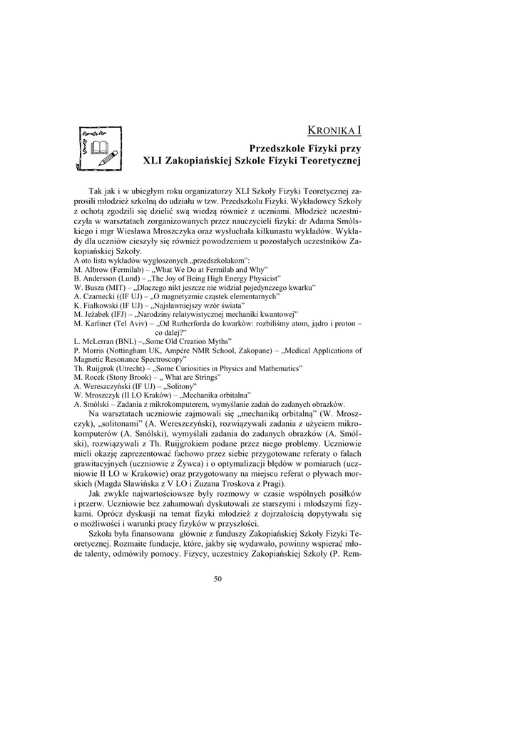 KRONIKA I Przedszkole Fizyki przy XLI Zakopiańskiej Szkole Fizyki Teoretycznej Tak jak i w ubiegłym roku organizatorzy XLI Szkoły Fizyki Teoretycznej zaprosili młodzież szkolną do udziału w tzw. Przedszkolu Fizyki. Wykładowcy Szkoły z ochotą zgodzili się dzielić swą wiedzą również z uczniami. Młodzież uczestniczyła w warsztatach zorganizowanych przez nauczycieli fizyki: dr Adama Smólskiego i mgr Wiesława Mroszczyka oraz wysłuchała kilkunastu wykładów. Wykłady dla uczniów cieszyły się również powodzeniem u pozostałych uczestników Zakopiańskiej Szkoły. A oto lista wykładów wygłoszonych „przedszkolakom”: M. Albrow (Fermilab) – „What We Do at Fermilab and Why” B. Andersson (Lund) – „The Joy of Being High Energy Physicist” W. Busza (MIT) – „Dlaczego nikt jeszcze nie widział pojedynczego kwarku” A. Czarnecki ((IF UJ) – „O magnetyzmie cząstek elementarnych” K. Fiałkowski (IF UJ) – „Najsławniejszy wzór świata” M. Jeżabek (IFJ) – „Narodziny relatywistycznej mechaniki kwantowej” M. Karliner (Tel Aviv) – „Od Rutherforda do kwarków: rozbiliśmy atom, jądro i proton – co dalej?” L. McLerran (BNL) –„Some Old Creation Myths” P. Morris (Nottingham UK, Ampère NMR School, Zakopane) – „Medical Applications of Magnetic Resonance Spectroscopy” Th. Ruijgrok (Utrecht) – „Some Curiosities in Physics and Mathematics” M. Rocek (Stony Brook) – „ What are Strings” A. Wereszczyński (IF UJ) – „Solitony” W. Mroszczyk (II LO Kraków) – „Mechanika orbitalna” A. Smólski – Zadania z mikrokomputerem, wymyślanie zadań do zadanych obrazków. Na warsztatach uczniowie zajmowali się „mechaniką orbitalną” (W. Mroszczyk), „solitonami” (A. Wereszczyński), rozwiązywali zadania z użyciem mikrokomputerów (A. Smólski), wymyślali zadania do zadanych obrazków (A. Smólski), rozwiązywali z Th. Ruijgrokiem podane przez niego problemy. Uczniowie mieli okazję zaprezentować fachowo przez siebie przygotowane referaty o falach grawitacyjnych (uczniowie z Żywca) i o optymalizacji błędów w pomiarach (uczniowie II LO w Krakowie) oraz przygotowany na miejscu referat o pływach morskich (Magda Sławińska z V LO i Zuzana Troskova z Pragi). Jak zwykle najwartościowsze były rozmowy w czasie wspólnych posiłków i przerw. Uczniowie bez zahamowań dyskutowali ze starszymi i młodszymi fizykami. Oprócz dyskusji na temat fizyki młodzież z dojrzałością dopytywała się o możliwości i warunki pracy fizyków w przyszłości. Szkoła była finansowana głównie z funduszy Zakopiańskiej Szkoły Fizyki Teoretycznej. Rozmaite fundacje, które, jakby się wydawało, powinny wspierać młode talenty, odmówiły pomocy. Fizycy, uczestnicy Zakopiańskiej Szkoły (P. Rem50 biesa, W. Busza, L. McLerran, Th. Ruijgrok) dofinansowali uczniom noclegi w domu UJ „Lonka”. W Szkole wzięło udział 24 uczniów, w tym dwie uczennice i trzech uczniów – laureatów Konkursu Fizyki organizowanego przez Akademię Pedagogiczną w Krakowie. I tak poza Krakusami z naszego uniwersyteckiego V LO byli uczniowie z II i I LO, trójka najmłodszych uczestników pierwszoklasistów z Bochni, trójka z Żywca, trójka z Komorowa, uczeń z Katowic, no i Zuzana z Pragi. Profesor Andrzej Białas, inicjator i organizator szkół zakopiańskich, przygarnia pod swoje skrzydła kolejne generacje młodych fizyków. Jego wychowankowie, tegoroczni organizatorzy Szkoły Zakopiańskiej: prof. dr M. Nowak i dr M. Sadzikowski dołożyli starań by Przedszkole miało doskonałe warunki. Na autorce notatki (Z.G-M) spoczywała jedynie merytoryczna opieka nad Przedszkolem. (Z.G-M) Fizyka oczami uczennicy Przedszkole Fizyki organizowane dla uczniów szkół średnich obejmowało wykłady z fizyki wysokich energii, teorii cząstek i warsztaty, na których rozwiązywaliśmy „szkolne” problemy fizyczne. W rozważaniach nad zjawiskami fizycznymi nie można zignorować nasuwającego się natarczywie pytania: „czym jest fizyka?” Odpowiedzi na to pytanie nie znajduje się w wykładach przedstawiających drobiazgowo odkrycia poczynione w tej dziedzinie wiedzy, w tłumaczeniu metod badań i ich ograniczeń, w zweryfikowanych i tworzonych współcześnie teoriach. By nie stracić z oczu celu tej nauki – odkrywania prawdy o świecie materialnym – należy zadawać pytania o relacje między przyrodą, czy ściślej: zjawiskami, jakie obserwujemy, a teorią, która ma je opisywać. Nic dziwnego zatem, że Przedszkole stało się blisko tygodniową rozmową na temat filozofii fizyki. Myślę, że termin „rozmowa”, choć nietypowy jak na serię wykładów, a zatem naukową konferencję jest uzasadniony jednością tematu, miejsca i audytorium. Tym bardziej, że to ostatnie rzadko ograniczało się do biernego słuchania; przytaczaliśmy wypowiedzi poprzednich wykładowców (jeżeli oczywiście nie byli obecni na sali i sami nie podejmowali polemiki), prezentowaliśmy własne spostrzeżenia czy wątpliwości, zaznaczając nieśmiało swój udział w dyskusji i tym samym zbliżając rozważania do dialogu. Po takim uogólnieniu pojęcia rozmowy przyjrzyjmy się treści rozważań. Jak już wspomniałam, dotyczyły one filozofii fizyki. Naturalnym staje się pytanie o samych fizyków: jak oni widzą przyrodę, jak pracują, jaki jest ich wkład w kształtowanie wyobrażeń o świecie, etc. Można, podobnie jak żartobliwie stwierdził prowadzący wykład „The Joy of Being Physicist” Larry McLerran uważać, że „fizyk teoretyk nie musi być wcale człowiekiem odpowiedzialnym”. To osoba o wyobraźni i dociekliwości dziecka, które oglądając świat zdumiewa się każdym zachodzącym w nim zjawiskiem. Podobne spostrzeżenie znajdujemy u Newtona. Porównuje on siebie do chłopca ba51 wiącego się kamykami nad brzegiem ogromnego, niezbadanego oceanu. Marzeniem chłopca jest poznać ów bezmiar wód i dlatego wpatruje się weń p
