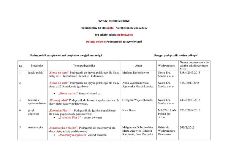 WYKAZ PODRĘCZNIKÓW Przeznaczony do klas piątej na rok szkolny 2016/2017 Typ szkoły: szkoła podstawowa Dotacja celowa: Podręczniki i zeszyty ćwiczeń Podręczniki i zeszyty ćwiczeń bezpłatne z wyjątkiem religii Lp. 1. Tytuł podręcznika Przedmiot język polski 2. Uwaga: podręczniki można odkupić Autor Wydawnictwo Numer dopuszczenia do użytku szkolnego przez MEN 338/4/2013/2015 „Słowa na start!” Podręcznik do języka polskiego dla klasy piątej cz. 1. Kształcenie literackie i kulturowe. Marlena Derlukiewicz Nowa Era. Spółka z o. o „Słowa na start!” Podręcznik do języka polskiego dla klasy piątej cz.2. Kształcenie językowe Anna Wojciechowska, Agnieszka Marcinkiewicz Nowa Era. Spółka z o. o 338/32013/2015 „Słowa na start” Zeszyt ćwiczeń cz. 3. historia i społeczeństwo „Wczoraj i dziś” Podręcznik do historii i społeczeństwa dla klasy piątej szkoły podstawowej. Grzegorz Wojciechowski Nowa Era. Spółka z o. o 443/2/2013/2015 4. język angielski „Evolution Plus 1” – Podręcznik do języka angielskiego dla klasy piątej szkoły podstawowej. „Evolution Plus 1” – zeszyt ćwiczeń Nick Beare MACMILLAN Polska Sp. z o.o. 675/2/2014/2015 5. matematyka „Matematyka z plusem”. Podręcznik do matematyki dla klasy piątej szkoły podstawowej. „Matematyka z plusem” Zeszyt ćwiczeń Małgorzata Dobrowolska, Marta Jucewicz , Marcin Karpiński, Piotr Zarzycki Gdańskie Wydawnictwo Oświatowe 340/2/2013 6. przyroda „Tajemnice przyrody”. Podręcznik do przyrody dla klasy piątej szkoły podstawowej. „Tajemnice przyrody” Zeszyt ćwiczeń Maria MarkoWorławska, Feliks, Joanna Szlajfer, Monika Stawarz Nowa Era. Spółka z o. o 399/2/2013/2015 7. muzyka „Lekcja muzyki”. Podręcznik do muzyki dla klasy piątej szkoły podstawowej. MonikaGromek, Grażyna Kilbach Nowa Era. Spółka z o. o 589/2/2013/2015 8. plastyka „Do dzieła!”. Podręcznik do plastyki dla klasy piątej szkoły podstawowej. Jadwiga Lukas, Krystyna Onak Nowa Era. Spółka z o. o 326/2/2011/2015 9. zajęcia komputerowe „Lubię to!”. Podręcznik do zajęć komputerowych dla klasy piątej szkoły podstawowej. Michał Kęska Nowa Era. Spółka z o. o 729/2/2016 10. zajęcia techniczne „Jak to działa?”. Podręcznik do zajęć technicznych dla klasy piątej szkoły podstawowej. Lech Łabecki, Marta Łabecka Nowa Era. Spółka z o. o 295/2/2010/2015
