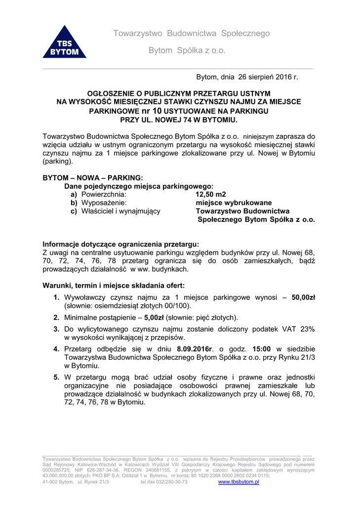 Towarzystwo Budownictwa Społecznego Bytom Spółka z o.o. _________________________________________________________________________________ Bytom, dnia 26 sierpień 2016 r. OGŁOSZENIE O PUBLICZNYM PRZETARGU USTNYM NA WYSOKOŚĆ MIESIĘCZNEJ STAWKI CZYNSZU NAJMU ZA MIEJSCE PARKINGOWE nr 10 USYTUOWANE NA PARKINGU PRZY UL. NOWEJ 74 W BYTOMIU. Towarzystwo Budownictwa Społecznego Bytom Spółka z o.o. niniejszym zaprasza do wzięcia udziału w ustnym ograniczonym przetargu na wysokość miesięcznej stawki czynszu najmu za 1 miejsce parkingowe zlokalizowane przy ul. Nowej w Bytomiu (parking). BYTOM – NOWA – PARKING: Dane pojedynczego miejsca parkingowego: a) Powierzchnia: 12,50 m2 b) Wyposażenie: miejsce wybrukowane c) Właściciel i wynajmujący Towarzystwo Budownictwa Społecznego Bytom Spółka z o.o. Informacje dotyczące ograniczenia przetargu: Z uwagi na centralne usytuowanie parkingu względem budynków przy ul. Nowej 68, 70, 72, 74, 76, 78 przetarg ogranicza się do osób zamieszkałych, bądź prowadzących działalność w ww. budynkach. Warunki, termin i miejsce składania ofert: 1. Wywoławczy czynsz najmu za 1 miejsce parkingowe wynosi – 50,00zł (słownie: osiemdziesiąt złotych 00/100). 2. Minimalne postąpienie – 5,00zł (słownie: pięć złotych). 3. Do wylicytowanego czynszu najmu zostanie doliczony podatek VAT 23% w wysokości wynikającej z przepisów. 4. Przetarg odbędzie się w dniu 8.09.2016r. o godz. 15:00 w siedzibie Towarzystwa Budownictwa Społecznego Bytom Spółka z o.o. przy Rynku 21/3 w Bytomiu. 5. W przetargu mogą brać udział osoby fizyczne i prawne oraz jednostki organizacyjne nie posiadające osobowości prawnej zamieszkałe lub prowadzące działalność w budynkach zlokalizowanych przy ul. Nowej 68, 70, 72, 74, 76, 78 w Bytomiu. ______________________________________________________________________________________ ___ Towarzystwo Budownictwa Społecznego Bytom Spółka z o.o. wpisana do Rejestru Przedsiębiorców prowadzonego przez Sąd Rejonowy Katowice-Wschód w Katowicach Wydział VIII Gospodarczy Krajowego Rejestru Sądowego pod numerem 0000285725; NIP 626-287-34-36, REGON 240681155, z pokrytym w całości kapitałem zakładowym wynoszącym 43.060.000,00 złotych; PKO BP S.A. Oddział 1 w Bytomiu, nr konta: 80 1020 2368 0000 2602 0234 0115; 41-902 Bytom, ul. Rynek 21/3 tel./fax 032/280-30-73 www.tbsbytom.pl Towarzystwo Budownictwa Społecznego Bytom Spółka z o.o. _________________________________________________________________________________ 6. Oferenci są zobowiązani przedłożyć: a) oświadczenie, że oferent zapoznał się z warunkami przetargu i przyjmuje je bez zastrzeżeń; b) oświadczenie oferenta o wyrażeniu zgody na przetwarzanie danych osobowych w zakresie niezbędnym do przeprowadzenia przetargu; c) kserokopię dokumentów z których wynikać będzie fakt zamieszkania oferenta, lub prowadzenie przez oferenta działalności gospodarczej w budynku przy ul. Nowej 68, 70, 72, 74, 76, 78 w Bytomiu. 7. Uczestnik, który przetarg wygrał w terminie do 5 dni roboczych od daty przetargu (przed zawarciem umowy najmu) zobowiązany będzie do wpłacenia kaucji w wysokości sześciomiesięcznego wylicytowanego czynszu brutto. 8. Umowa najmu zostanie zawarta w terminie do 5 dni roboczych od daty wpłacenia przez uczestnika, który przetarg wygrał kaucji o której mowa w pkt. 7 ogłoszenia. 9. Wynajmującemu przysługuje prawo odwołania przetargu bez podania przyczyny. 10. W niniejszym przetargu obowiązuje Regulamin wynajmu lokali użytkowych i garaży pozostających w zasobach Towarzystwa Budownictwa Społecznego Bytom Sp. z o.o. 2
