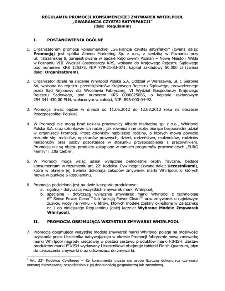 REGULAMIN PROMOCJI KONSUMENCKIEJ ZMYWAREK WHIRLPOOL „GWARANCJA CZYSTEJ SATYSFAKCJI” (dalej: Regulamin) I. POSTANOWIENIA OGÓLNE 1. Organizatorem promocji konsumenckiej „Gwarancja czystej satysfakcji” (zwana dalej: Promocją) jest spółka Albedo Marketing Sp. z o.o., z siedzibą w Poznaniu przy ul. Tatrzańskiej 8, zarejestrowana w Sądzie Rejonowym Poznań – Nowe Miasto i Wilda w Poznaniu VIII Wydział Gospodarczy KRS, wpisana do Krajowego Rejestru Sądowego pod numerem KRS 125373, NIP 779-21-83-071, kapitał zakładowy 50.000 zł (zwana dalej: Organizatorem). 2. Organizator działa na zlecenie Whirlpool Polska S.A. Oddział w Warszawie, ul. 1 Sierpnia 6A, wpisana do rejestru przedsiębiorców Krajowego Rejestru Sądowego, prowadzonego przez Sąd Rejonowy dla Wrocławia Fabrycznej, VI Wydział Gospodarczy Krajowego Rejestru Sądowego, pod numerem KRS 0000025866, o kapitale zakładowym 294.341.430,00 PLN, wpłaconym w całości, NIP: 896-000-04-92. 3. Promocja trwać będzie w dniach od 11.06.2012 do 12.08.2012 roku na obszarze Rzeczpospolitej Polskiej. 4. W Promocji nie mogą brać udziału pracownicy Albedo Marketing sp. z o.o., Whirlpool Polska S.A. oraz członkowie ich rodzin, jak również inne osoby biorące bezpośredni udział w organizacji Promocji. Przez członków najbliższej rodziny, o których mowa powyżej rozumie się: rodziców, opiekunów prawnych, dzieci, rodzeństwo, małżonków, rodziców małżonków oraz osoby pozostające w stosunku przysposobienia z pracownikiem. Promocją nie są objęte produkty zakupione w ramach programów pracowniczych „EURO Family” i „Dla Ciebie”. 5. W Promocji mogą wziąć udział wyłącznie pełnoletnie osoby fizyczne, będące konsumentami w rozumieniu art. 221 Kodeksu Cywilnego1 (zwane dalej: Uczestnikami), które w okresie jej trwania dokonają zakupów zmywarek marki Whirlpool, o których mowa w punkcie 6 Regulaminu. 6. Promocja podzielona jest na dwie kategorie produktowe: a. ogólną - dotyczącą wszystkich zmywarek marki Whirlpool; b. specjalną - dotyczącą wyłącznie zmywarek marki Whirlpool z technologią 6th Sense Power CleanTM lub funkcją Power CleanTM oraz zmywarek o najniższym zużyciu wody na rynku - 6 litrów, których modele zostały określone w Załączniku nr 1 do niniejszego Regulaminu (dalej łącznie: Wybrane Modele Zmywarek Whirlpool). II. PROMOCJA OBEJMUJĄCA WSZYSTKIE ZMYWARKI WHIRLPOOL 7. Promocja obejmująca wszystkie modele zmywarek marki Whirlpool polega na możliwości uzyskania przez Uczestnika nabywającego w okresie Promocji fabrycznie nową zmywarkę marki Whirlpool nagrody rzeczowej w postaci zestawu produktów marki FINISH. Zestaw produktów marki FINISH wydawany Uczestnikowi obejmuje tabletki Finish Quantum, płyn do czyszczenia zmywarki oraz odświeżacz do zmywarki. 1 Art. 22¹ Kodeksu Cywilnego – Za konsumenta uważa się osobę fizyczną dokonującą czynności prawnej niezwiązanej bezpośrednio z jej działalnością gospodarczą lub zawodową. 8. Zestaw produktów marki FINISH wydawany jest każdemu nabywcy zmywarki Whirlpool, o którym mowa w pkt 7 Regulaminu, w punkcie sprzedaży biorącym udział w Promocji, w którym dokonuje on zakupu. Jeżeli Uczestnik dokonuje zakupu za pośrednictwem Internetu, powinien otrzymać produkty marki FINISH wraz z dostawą zmywarki na adres dostawy, o ile dany sklep Internetowy bierze udział w promocji. III. PROMOCJA OBEJMUJĄCA WYBRANE MODELE ZMYWAREK WHIRLPOOL 9. Uczestnik nabywający w okresie Promocji Wybrany Model Zmywarki Whirlpool, o którym mowa w pkt 6 b. niniejszego Regulaminu, nabywa wszelkie uprawnienia, o których mowa w rozdziale II niniejszego regulaminu, a ponadto przysługuje mu prawo do: a. otrzymania dodatkowego prezentu rzeczowego w postaci naczynia żaroodpornego Sagaform; b. zwrotu zakupionej zmywarki w terminie do 30 dni od daty zakupu oraz otrzymania zwrotu ceny jej nabycia. 10. W celu otrzymania dodatkowego prezentu, o którym mowa w pkt 9 a. oraz zarejestrowania się w bazie danych osób testujących wybrany model zmywarki Whirlpool, nabywca takiej zmywarki obowiązany jest prawidłowo wypełnić kupon promocyjny otrzymany przy zakupie wraz z ulotką dotyczącą zmywarki, lub dostępny na stronie promocji www.czystasatysfakcja.pl, poprzez podanie następujących danych: a. imię i nazwisko b. adres zamieszkania c. numer telefonu - nieobowiązkowe d. e-mail - nieobowiązkowe e. model zmywarki f. numer seryjny zmywarki g. data zakupu zmywarki h. data wypełnienia kuponu i. adres sklepu, w którym dokonano zakupu. Ponadto Uczestnik obowiązany jest wyrazić zgodę na przetwarzanie jego danych osobowych na potrzeby realizacji niniejszej Promocji. 11. Prawidłowo wypełniony kupon promocyjny Uczestnik powinien przesłać wraz z kserokopią dowodu zakupu na adres: Gwarancja czystej satysfakcji, Albedo Marketing, ul. Tatrzańska 8, 60-413 Poznań lub on-line za pośrednictwem strony: www.czystasatysfakcja.pl (załączając skan dowodu zakupu). 12. Jeden Uczestnik może przesłać tylko jeden kupon promocyjny w trakcie trwania Promocji i uzyskać z tego tytułu tylko jeden prezent – naczynie żaroodporne Sagaform. 13. Naczynie żaroodporne Sagaform zostanie wysłane do Uczestnika w terminie 30 dni od daty otrzymania przez Organizatora prawidłowo wypełnionego kuponu promocyjnego (w formie listowej lub on-line). Organizator zastrzega sobie prawo pozostawienia bez rozpoznania kuponów niepełnych, wypełnionych nieprawidłowo lub w sposób nieczytelny. Przy czym jeżeli Uczestnik na kuponie promocyjnym podał swój numer telefonu lub adres e-mail, Organizator podejmie w takim przypadku stosowne postępowanie uzupełniające braki. 14. Uczestnik, który w okresie trwania Promocji dokona zakupu wybranego modelu zmywarki Whirlpool, o którym mowa w pkt 6 b. niniejszego Regulaminu, ma prawo do zwrotu tej zmywarki bez dodatkowych kosztów, o ile od dnia jej zakupu nie upłynęło więcej niż 30 dni. Dla uniknięcia 