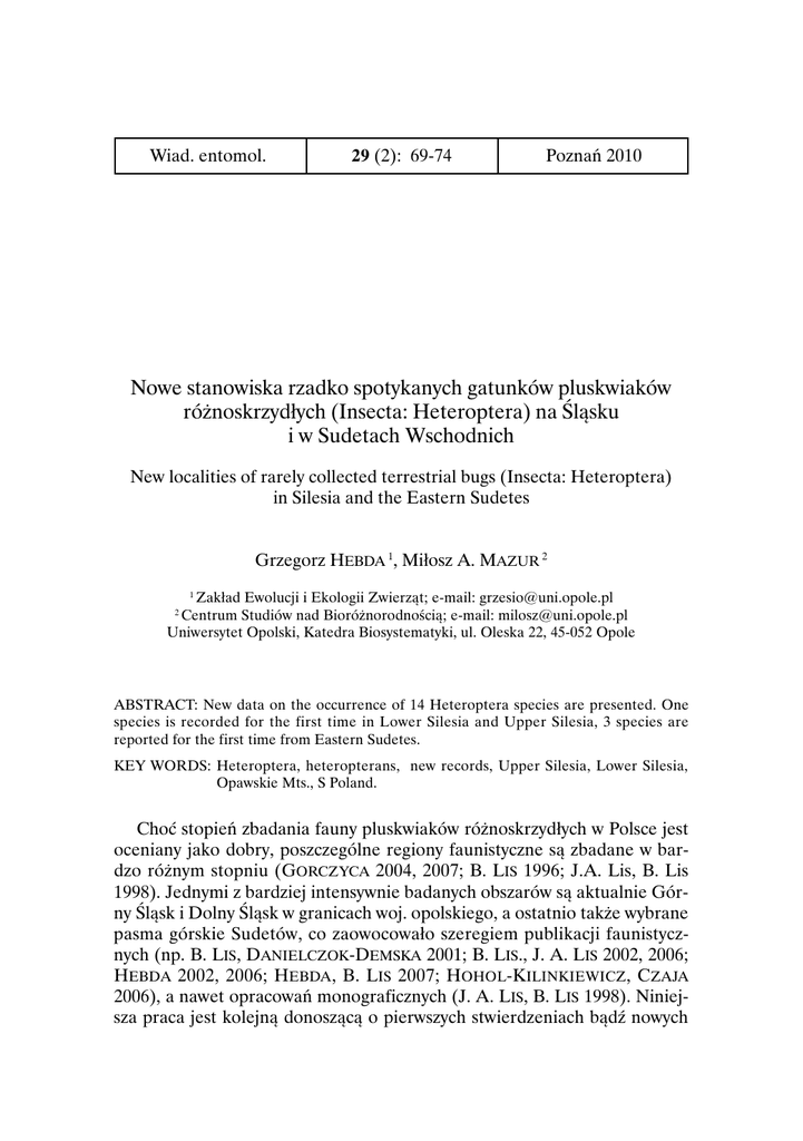 Wiad. entomol. 29 (2): 69-74 Poznań 2010 Nowe stanowiska rzadko spotykanych gatunków pluskwiaków różnoskrzydłych (Insecta: Heteroptera) na Śląsku i w Sudetach Wschodnich New localities of rarely collected terrestrial bugs (Insecta: Heteroptera) in Silesia and the Eastern Sudetes Grzegorz HEBDA 1, Miłosz A. MAZUR 2 1 Zakład Ewolucji i Ekologii Zwierząt; e-mail: [email protected] Centrum Studiów nad Bioróżnorodnością; e-mail: [email protected] Uniwersytet Opolski, Katedra Biosystematyki, ul. Oleska 22, 45-052 Opole 2 ABSTRACT: New data on the occurrence of 14 Heteroptera species are presented. One species is recorded for the first time in Lower Silesia and Upper Silesia, 3 species are reported for the first time from Eastern Sudetes. KEY WORDS: Heteroptera, heteropterans, new records, Upper Silesia, Lower Silesia, Opawskie Mts., S Poland. Choć stopień zbadania fauny pluskwiaków różnoskrzydłych w Polsce jest oceniany jako dobry, poszczególne regiony faunistyczne są zbadane w bardzo różnym stopniu (GORCZYCA 2004, 2007; B. LIS 1996; J.A. Lis, B. Lis 1998). Jednymi z bardziej intensywnie badanych obszarów są aktualnie Górny Śląsk i Dolny Śląsk w granicach woj. opolskiego, a ostatnio także wybrane pasma górskie Sudetów, co zaowocowało szeregiem publikacji faunistycznych (np. B. LIS, DANIELCZOK-DEMSKA 2001; B. LIS., J. A. LIS 2002, 2006; HEBDA 2002, 2006; HEBDA, B. LIS 2007; H OHOL-KILINKIEWICZ, C ZAJA 2006), a nawet opracowań monograficznych (J. A. LIS, B. LIS 1998). Niniejsza praca jest kolejną donoszącą o pierwszych stwierdzeniach bądź nowych 70 G. HEBDA, M A. MAZUR stanowiskach rzadkich na Śląsku i w Sudetach Wschodnich gatunkach pluskwiaków różnoskrzydłych. Okazy dowodowe znajdują się w kolekcji pierwszego autora. MIRIDAE Dryophilocoris flavoquadrimaculatus (DE GEER, 1773) – Dolny Śląsk: Opole, Wyspa Bolko, 9 V 2002 – 1 ex., leg. M. A. MAZUR; Użytek Ekologiczny „Gęsi Staw” ad Popielów, 27 V 2008 – 1 ex., szuwary, leg. M. A. MAZUR; Wierzbie ad Łambinowice, 17 V 2008 – 1 ex., drzewa liściaste, leg. M. A. MAZUR; Żywocie ad Krapkowice, 25 V 2009 – 1 ex., łęg, leg. M. A. MAZUR. Gatunek pospolity w całym kraju, ale nie podawany dotąd z Dolnego Śląska (GORCZYCA 2007). Globiceps sphaegiformis (ROSSI, 1790) – Sudety Wschodnie: Góry Opawskie, Lipy ad Prudnik, 15 VI 2008 – 2 exx., dawny poligon wojskowy, leg. M. A. M AZUR. Gatunek w Polsce stosunkowo rzadko wykazywany, żyje na liściastych gatunkach krzewów i drzew. Z Sudetów Wschodnich dotychczas niepodawany. Harpocera thoracica (FALLÉN,1807) – Dolny Śląsk: Opole, Wyspa Bolko, 9 V 2002 – 2 exx., leg. M. A. MAZUR; Stobrawa ad Brzeg, 9 V 2001 – 1 ex., runo grądu, leg. G. HEBDA; Wielopole ad Popielów, 27 V 2008 – 2 exx., runo grądu, leg. M. A. M AZUR; Wierzbie ad Łambinowice, 17 V 2008 – 1 ex., z drzew liściastych, leg. M. A. MAZUR; Żywocice ad Krapkowice, 25 V 2009 – 1 ex., łęg, leg. M. A. MAZUR, 29 IV 2009 – 1 ex., grąd, leg. M. A. MAZUR. Pospolity w całej Polsce, ale z Dolnego Śląska podawany dotąd jedynie z Malczyc i to z okresu przed II wojną światową (POLENTZ 1943; GORCZYCA 2007). Horistus orientalis (GMELIN, 1790) – Sudety Wschodnie: Góry Opawskie, Lipy ad Prudnik, 15 VI 2008 – 2 exx., poligon, leg. M. A. MAZUR. Gatunek niezbyt częsty w Polsce, podawany jedynie z jej południowo-zachodniej części (ASSMANN 1854; SCHOLZ 1931; B. LIS 2001). Z Sudetów Wschodnich podany wcześniej z Bliszczyc (B. LIS 2001) i z Pielgrzymowa (HEBDA, B. LIS 2007). NOWE STANOWISKA RZADKO SPOTYKANYCH GATUNKÓW PLUSKWIAKÓW [...] 71 TINGIDAE Acalypta marginata (WOLFF, 1804) – Sudety Wschodnie: Góry Opawskie, Lipy ad Prudnik, 2 VI 2009 – 1 ex., poligon, leg. M. A. MAZUR. Z Sudetów dotychczas niewykazywany. Physatocheila costata (FABRICIUS, 1794) – Górny Śląsk: Kały ad Murów, 6 VII 2008 – 1 ex., bór mieszany, leg. M. A. MAZUR; Ładza ad Pokój, 27 IV 2008 – 1 ex., ols, leg. M. A. MAZUR. Wykazywany tylko z jednego stanowiska (Miedary) na Górnym Śląsku (J. A. LIS 1989; B. LIS 1996). Physatocheila smreczynskii CHINA, 1952 – Dolny Śląsk: Kuźnica Dąbrowska ad Pokój, 3 V 2008 – 1 ex., łęg, leg. M. A. MAZUR. – Górny Śląsk: Kędzierzyn Koźle, 29 IV 2002 – 1 ex., leg. M. A. Mazur; Pokój, 26 IV 2007 – 1 ex., grąd, leg. M. A. MAZUR; Zborowskie ad Ciasna, 15 VIII 2009 – 2 exx., bór sosnowy, leg. G. HEBDA. Gatunek podawany z około 20 stanowisk w Polsce, ale ze Śląska (Dolnego i Górnego) podawany dotąd tylko dwukrotnie (B. LIS 1996; CHŁOND i in. 2004–2005; HOHOL-KILINKIEWICZ, CZAJA 2006). Tingis pilosa HUMMEL, 1825 – Dolny Śląsk: Lisie Łąki ad Lubsza, 5 VII 2008 – 1 ex., Molinion, leg. M. A. MAZUR. Z Dolnego Śląska podawany tylko z Górażdży (HOHOL-KILINKIEWICZ, CZAJA 2006) LYGAEIDAE Gastrodes abietum BERGROTH, 1914 – Sudety Wschodnie: Góry Opawskie, Biskupia Kopa, 16 VI 2008 – 1 ex., leg. M. A. MAZUR; Masyw Śnieżnika, Kletno, 25 I 2008 – 2 exx., buczyny, zimujący za korą drzew, leg. G. HEBDA. Z Sudetów podawany tylko z kilku stanowisk w Sudetach Zachodnich (ASSMANN 1854; LANZKE, POLENTZ 1942); z Sudetów Wschodnich dotychczas niepodawany. 72 G. HEBDA, M A. MAZUR Ischnodemus sabuleti (FALLÉN, 1826) – Dolny Śląsk: Lisi Łąki ad Lubsza, 2 V 2007 – 1 ex., łąki, leg. M. A. MAZUR; Użytek ekologiczny „Gęsi Staw” ad Popielów, 27 V 2008 – 1 ex., szuwary, leg. M. A. MAZUR ; Wielopole ad Popielów, 30 V 2004 – 1 ex., grąd, w gnieździe trznadla Emberiza citrinella L., leg. G. HEBDA; 2 V 2008 – 1 ex., grąd, leg. M. A. MAZUR; Wierzbie ad Łambinowice, 26 IV 2008 – 1 ex., Molinion, leg. M. A. MAZUR; Żywocice ad Krapkowice, 25 V 2009 – 6 imagines + 2 larwy, łęgi, 29 IV 2009 – 1 ex., grąd, leg. M. A. MAZUR. Gatunek odławiany w kraju dość rzadko. Niedawno, po 70 latach potwierdzono jego występowanie na Dolnym Śląsku w Suchym Borze (B. LIS, J. A. LIS 2006). Nysi