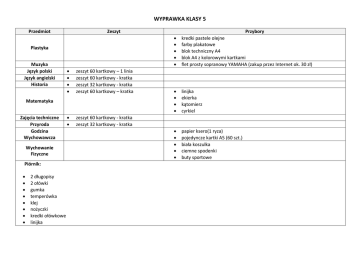WYPRAWKA KLASY 5 Przedmiot Zeszyt Plastyka Muzyka Język polski Język angielski Historia zeszyt 60 kartkowy – 1 linia zeszyt 60 kartkowy - kratka zeszyt 32 kartkowy - kratka zeszyt 60 kartkowy – kratka zeszyt 60 kartkowy - kratka zeszyt 32 kartkowy - kratka Matematyka Zajęcia techniczne Przyroda Godzina Wychowawcza Wychowanie Fizyczne Piórnik: 2 długopisy 2 ołówki gumka temperówka klej nożyczki kredki ołówkowe linijka Przybory kredki pastele olejne farby plakatowe blok techniczny A4 blok A4 z kolorowymi kartkami flet prosty sopranowy YAMAHA (zakup przez Internet ok. 30 zł) linijka ekierka kątomierz cyrkiel papier ksero(1 ryza) pojedyncze kartki A5 (60 szt.) biała koszulka ciemne spodenki buty sportowe