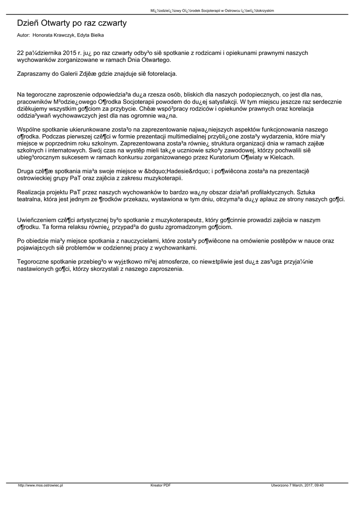 M�odzie�owy O�rodek Socjoterapii w Ostrowcu �wi�tokrzyskim Dzieñ Otwarty po raz czwarty Autor: Honorata Krawczyk, Edyta Bielka 22 pa¼dziernika 2015 r. ju¿ po raz czwarty odby³o siê spotkanie z rodzicami i opiekunami prawnymi naszych wychowanków zorganizowane w ramach Dnia Otwartego. Zapraszamy do Galerii Zdjêæ gdzie znajduje siê fotorelacja. Na tegoroczne zaproszenie odpowiedzia³a du¿a rzesza osób, bliskich dla naszych podopiecznych, co jest dla nas, pracowników M³odzie¿owego O¶rodka Socjoterapii powodem do du¿ej satysfakcji. W tym miejscu jeszcze raz serdecznie dziêkujemy wszystkim go¶ciom za przybycie. Chêæ wspó³pracy rodziców i opiekunów prawnych oraz korelacja oddzia³ywañ wychowawczych jest dla nas ogromnie wa¿na. Wspólne spotkanie ukierunkowane zosta³o na zaprezentowanie najwa¿niejszych aspektów funkcjonowania naszego o¶rodka. Podczas pierwszej czê¶ci w formie prezentacji multimedialnej przybli¿one zosta³y wydarzenia, które mia³y miejsce w poprzednim roku szkolnym. Zaprezentowana zosta³a równie¿ struktura organizacji dnia w ramach zajêæ szkolnych i internatowych. Swój czas na wystêp mieli tak¿e uczniowie szko³y zawodowej, którzy pochwalili siê ubieg³orocznym sukcesem w ramach konkursu zorganizowanego przez Kuratorium O¶wiaty w Kielcach. Druga czê¶æ spotkania mia³a swoje miejsce w „Hadesie” i po¶wiêcona zosta³a na prezentacjê ostrowieckiej grupy PaT oraz zajêcia z zakresu muzykoterapii. Realizacja projektu PaT przez naszych wychowanków to bardzo wa¿ny obszar dzia³añ profilaktycznych. Sztuka teatralna, która jest jednym ze ¶rodków przekazu, wystawiona w tym dniu, otrzyma³a du¿y aplauz ze strony naszych go¶ci. Uwieñczeniem czê¶ci artystycznej by³o spotkanie z muzykoterapeut±, który go¶cinnie prowadzi zajêcia w naszym o¶rodku. Ta forma relaksu równie¿ przypad³a do gustu zgromadzonym go¶ciom. Po obiedzie mia³y miejsce spotkania z nauczycielami, które zosta³y po¶wiêcone na omówienie postêpów w nauce oraz pojawiaj±cych siê problemów w codziennej pracy z wychowankami. Tegoroczne spotkanie przebieg³o w wyj±tkowo mi³ej atmosferze, co niew±tpliwie jest du¿± zas³ug± przyja¼nie nastawionych go¶ci, którzy skorzystali z naszego zaproszenia. http://www.mos.ostrowiec.pl Kreator PDF Utworzono 7 March, 2017, 09:40