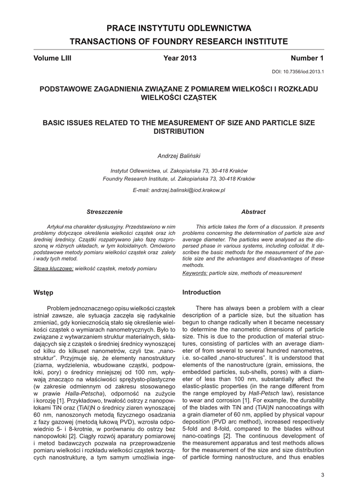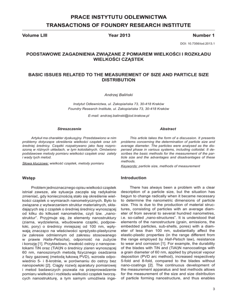 PRACE INSTYTUTU ODLEWNICTWA TRANSACTIONS OF FOUNDRY RESEARCH INSTITUTE Volume LIII Year 2013 Number 1 DOI: 10.7356/iod.2013.1 Podstawowe zagadnienia związane z pomiarem wielkości i rozkładu wielkości cząstek Basic issues related to the measurement of SIZE and particle size distribution Andrzej Baliński Instytut Odlewnictwa, ul. Zakopiańska 73, 30-418 Kraków Foundry Research Institute, ul. Zakopiańska 73, 30-418 Kraków E-mail: [email protected] Streszczenie Abstract Artykuł ma charakter dyskusyjny. Przedstawiono w nim problemy dotyczące określenia wielkości cząstek oraz ich średniej średnicy. Cząstki rozpatrywano jako fazę rozproszoną w różnych układach, w tym koloidalnych. Omówiono podstawowe metody pomiaru wielkości cząstek oraz zalety i wady tych metod. This article takes the form of a discussion. It presents problems concerning the determination of particle size and average diameter. The particles were analysed as the dispersed phase in various systems, including colloidal. It describes the basic methods for the measurement of the particle size and the advantages and disadvantages of these methods. Słowa kluczowe: wielkość cząstek, metody pomiaru Keywords: particle size, methods of measurement Wstęp Introduction Problem jednoznacznego opisu wielkości cząstek istniał zawsze, ale sytuacja zaczęła się radykalnie zmieniać, gdy koniecznością stało się określenie wielkości cząstek o wymiarach nanometrycznych. Było to związane z wytwarzaniem struktur materialnych, składających się z cząstek o średniej średnicy wynoszącej od kilku do kilkuset nanometrów, czyli tzw. „nanostruktur”. Przyjmuje się, że elementy nanostruktury (ziarna, wydzielenia, wbudowane cząstki, podpowłoki, pory) o średnicy mniejszej od 100 nm, wpływają znacząco na właściwości sprężysto-plastyczne (w zakresie odmiennym od zakresu stosowanego w prawie Halla-Petscha), odporność na zużycie i korozję [1]. Przykładowo, trwałość ostrzy z nanopowłokami TiN oraz (TiAl)N o średnicy ziaren wynoszącej 60 nm, nanoszonych metodą fizycznego osadzania z fazy gazowej (metodą łukową PVD), wzrosła odpowiednio 5- i 8-krotnie, w porównaniu do ostrzy bez nanopowłoki [2]. Ciągły rozwój aparatury pomiarowej i metod badawczych pozwala na przeprowadzenie pomiaru wielkości i rozkładu wielkości cząstek tworzących nanostrukturę, a tym samym umożliwia inge- There has always been a problem with a clear description of a particle size, but the situation has begun to change radically when it became necessary to determine the nanometric dimensions of particle size. This is due to the production of material structures, consisting of particles with an average diameter of from several to several hundred nanometres, i.e. so-called „nano-structures”. It is understood that elements of the nanostructure (grain, emissions, the embedded particles, sub-shells, pores) with a diameter of less than 100 nm, substantially affect the elastic-plastic properties (in the range different from the range employed by Hall-Petsch law), resistance to wear and corrosion [1]. For example, the durability of the blades with TiN and (TiAl)N nanocoatings with a grain diameter of 60 nm, applied by physical vapour deposition (PVD arc method), increased respectively 5-fold and 8-fold, compared to the blades without nano-coatings [2]. The continuous development of the measurement apparatus and test methods allows for the measurement of the size and size distribution of particle forming nanostructure, and thus enables 3 A. Baliński: Podstawowe zagadnienia związane z pomiarem wielkości i rozkładu wielkości cząstek rencję we właściwości użytkowe wielu materiałów, także tych które składają się z cząstek o wymiarach koloidalnych. Zalicza się do nich popularne spoiwo odlewnicze, jakim jest uwodniony krzemian sodu („szkło wodne”). Stwierdzono, że istnieje zależność pomiędzy charakterystycznymi parametrami struktury tego spoiwa, a sposobem jego wykonania [3, 4]. Uwodniony krzemian sodu posiadający cząstki koloidalne o korzystnym rozkładzie ich wielkości, charakteryzuje się większą wartością wytrzymałości kohezyjnej. Istnieje zatem możliwość zmniejszenia w masie formierskiej udziału tego rodzaju spoiwa, przy równoczesnym uzyskaniu odpowiednich właściwości wytrzymałościowych masy formierskiej. interference in commercial properties of a variety of materials, including those which are composed of particles of colloidal dimensions. These include the popular casting binder, which is hydrated sodium silicate („water glass”). It has been found that there is a relationship between the specific parameters of this binder structure, and the method of its implementation [3, 4]. Hydrated sodium silicate having colloidal particles with the advantageous distribution of their size, has a higher cohesive strength value. It is, therefore, possible to reduce the portion of such a binder in moulding sand while obtaining adequate strength characteristics of the moulding sand. Pojęcie średnicy cząstki The concept of particle diameter Powstaje zatem pytanie, jak jednoznacznie określić średnią wielkość cząstki ze zbioru cząstek, używając do tego jednego wymiaru charakterystycznego. W przypadku niewielkiej liczności cząstek zadanie to jest stosunkowo proste – może to być średnia średnica Martina, minimalna lub maksymalna średnia średnica Fereta, czy też średnia średnica równoważna powierzchni cząstek danego zbioru (rys. 1). Problem zaczyna się komplikować w przypadku rozpatrywania bardzo licznych, milionowych zbiorów cząstek, często o złożonych kształtach, znacznie różniących się od kształtu kulistego. Przykładowo, kształt cząstek proszków może być iglasty, wielościenny, dendrytyczny, włóknisty, płatkowy, granulowy, nieregularny, globularny i kulisty [5]. Ze względu na to, że bryłą, którą można opisać jedną licz