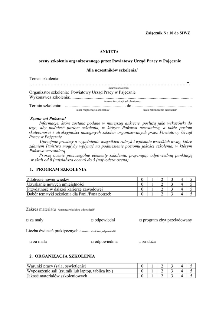 Załącznik Nr 10 do SIWZ ANKIETA oceny szkolenia organizowanego przez Powiatowy Urząd Pracy w Pajęcznie /dla uczestników szkolenia/ Temat szkolenia: „……………………………….……………………………………………………………”. /nazwa szkolenia/ Organizator szkolenia: Powiatowy Urząd Pracy w Pajęcznie Wykonawca szkolenia:............................................................................................................... /nazwa instytucji szkoleniowej/ Termin szkolenia: ....................................................... do ...................................................... /data rozpoczęcia szkolenia/ /data zakończenia szkolenia/ Szanowni Państwo! Informacje, które zostaną podane w niniejszej ankiecie, posłużą jako wskazówki do tego, aby podnieść poziom szkolenia, w którym Państwo uczestniczą, a także poziom skuteczności i atrakcyjności następnych szkoleń organizowanych przez Powiatowy Urząd Pracy w Pajęcznie. Uprzejmie prosimy o wypełnienie wszystkich rubryk i wpisanie wszelkich uwag, które zdaniem Państwa mogłyby wpłynąć na podniesienie poziomu jakości szkolenia, w którym Państwo uczestniczą. Proszę ocenić poszczególne elementy szkolenia, przyznając odpowiednią punktację w skali od 0 (najsłabsza ocena) do 5 (najwyższa ocena). 1. PROGRAM SZKOLENIA Zdobycie nowej wiedzy Uzyskanie nowych umiejętności Przydatność w dalszej karierze zawodowej Dobór tematyki szkolenia dla Pani /Pana potrzeb 0 0 0 0 1 1 1 1 2 2 2 2 3 3 3 3 4 4 4 4 5 5 5 5 Zakres materiału /zaznacz właściwą odpowiedź/ □ za mały □ odpowiedni □ program zbyt przeładowany Liczba ćwiczeń praktycznych /zaznacz właściwą odpowiedź/ □ za mała □ odpowiednia □ za duża 2. ORGANIZACJA SZKOLENIA Warunki pracy (sala, oświetlenie) Wyposażenie sali (rzutnik lub laptop, tablica itp.) Jakość materiałów szkoleniowych 0 0 0 1 1 1 2 2 2 3 3 3 4 4 4 5 5 5 Liczba i długość przerw /zaznacz właściwą odpowiedź/ □ za mała □ odpowiednia □ za duża 3. UCZESTNICY SZKOLENIA Jednorodność grupy (0 - bardzo zróżnicowana, 5 – jednolita) Oczekiwania wobec szkoleń (0 - zupełnie inne, 5 -takie same) 0 0 1 1 2 2 3 3 4 4 5 5 0 0 0 0 0 0 0 0 1 1 1 1 1 1 1 1 2 2 2 2 2 2 2 2 3 3 3 3 3 3 3 3 4 4 4 4 4 4 4 4 5 5 5 5 5 5 5 5 0 0 1 1 2 2 3 3 4 4 5 5 4. PROWADZĄCY SZKOLENIE Znajomość tematu, przygotowanie merytoryczne Sposób przekazywania informacji (przystępny, klarowny?) Umiejętność odpowiadania na pytania Umiejętność tłumaczenia szczególnie trudnych kwestii Tempo szkolenia Dbanie o dobrą atmosferę podczas szkolenia Stosunek do uczestników szkolenia (przyjazny?) Ogólna ocena prowadzących szkolenie 5. OGÓLNA OCENA SZKOLENIA Atmosfera podczas szkolenia Ogólna ocena szkolenia (0 – bardzo zła, 5 – bardzo dobra) 6. PROPOZYCJE ZMIAN Jakie inne uwagi ma Pani /Pan do przeprowadzonego szkolenia? ................................................................................................................................................................................. ................................................................................................................................................................................. ................................................................................................................................................................................. METRYCZKA Płeć: □ kobieta □ mężczyzna Wiek: □ 18-24 lata □ 35-44 lata □ 25-34 lata □ 45 lat i więcej Wykształcenie: □ podstawowe □ średnie ogólne □ gimnazjalne □ średnie zawodowe □ zasadnicze zawodowe □ pomaturalne □ wyższe zawodowe (licencjat) □ wyższe magisterskie Staż pracy: □ brak stażu pracy □ od 5 lat do 10 lat □ do 1 roku □ od 10 lat do 20 lat □ od 1 roku do 5 lat □ powyżej 20 lat Czas pozostawania bez pracy (licząc od ostatniej rejestracji w PUP): □ do 6 miesięcy □ od 6 do 12 miesięcy □ od 12 miesięcy do 24 miesięcy □ powyżej 24 miesięcy Dziękujemy za wypełnienie ankiety!