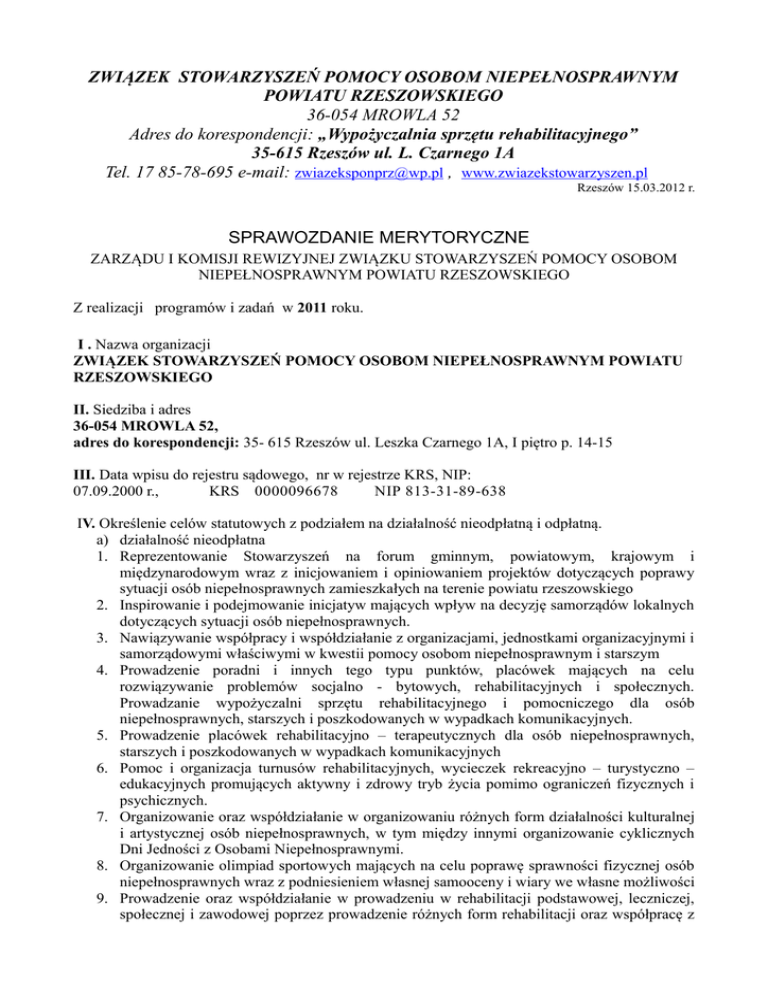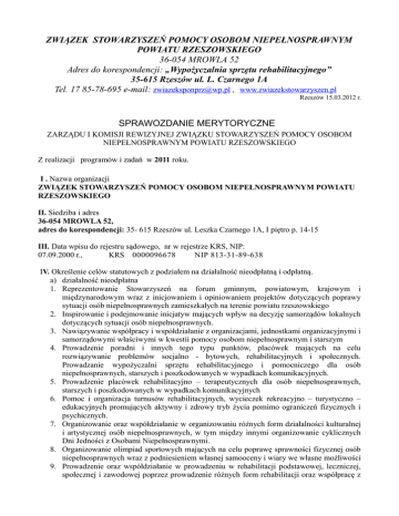 ZWIĄZEK STOWARZYSZEŃ POMOCY OSOBOM NIEPEŁNOSPRAWNYM POWIATU RZESZOWSKIEGO 36-054 MROWLA 52 Adres do korespondencji: „Wypożyczalnia sprzętu rehabilitacyjnego” 35-615 Rzeszów ul. L. Czarnego 1A Tel. 17 85-78-695 e-mail: [email protected] , www.zwiazekstowarzyszen.pl Rzeszów 15.03.2012 r. SPRAWOZDANIE MERYTORYCZNE ZARZĄDU I KOMISJI REWIZYJNEJ ZWIĄZKU STOWARZYSZEŃ POMOCY OSOBOM NIEPEŁNOSPRAWNYM POWIATU RZESZOWSKIEGO Z realizacji programów i zadań w 2011 roku. I . Nazwa organizacji ZWIĄZEK STOWARZYSZEŃ POMOCY OSOBOM NIEPEŁNOSPRAWNYM POWIATU RZESZOWSKIEGO II. Siedziba i adres 36-054 MROWLA 52, adres do korespondencji: 35- 615 Rzeszów ul. Leszka Czarnego 1A, I piętro p. 14-15 III. Data wpisu do rejestru sądowego, nr w rejestrze KRS, NIP: 07.09.2000 r., KRS 0000096678 NIP 813-31-89-638 IV. Określenie celów statutowych z podziałem na działalność nieodpłatną i odpłatną. a) działalność nieodpłatna 1. Reprezentowanie Stowarzyszeń na forum gminnym, powiatowym, krajowym i międzynarodowym wraz z inicjowaniem i opiniowaniem projektów dotyczących poprawy sytuacji osób niepełnosprawnych zamieszkałych na terenie powiatu rzeszowskiego 2. Inspirowanie i podejmowanie inicjatyw mających wpływ na decyzję samorządów lokalnych dotyczących sytuacji osób niepełnosprawnych. 3. Nawiązywanie współpracy i współdziałanie z organizacjami, jednostkami organizacyjnymi i samorządowymi właściwymi w kwestii pomocy osobom niepełnosprawnym i starszym 4. Prowadzenie poradni i innych tego typu punktów, placówek mających na celu rozwiązywanie problemów socjalno - bytowych, rehabilitacyjnych i społecznych. Prowadzanie wypożyczalni sprzętu rehabilitacyjnego i pomocniczego dla osób niepełnosprawnych, starszych i poszkodowanych w wypadkach komunikacyjnych. 5. Prowadzenie placówek rehabilitacyjno – terapeutycznych dla osób niepełnosprawnych, starszych i poszkodowanych w wypadkach komunikacyjnych 6. Pomoc i organizacja turnusów rehabilitacyjnych, wycieczek rekreacyjno – turystyczno – edukacyjnych promujących aktywny i zdrowy tryb życia pomimo ograniczeń fizycznych i psychicznych. 7. Organizowanie oraz współdziałanie w organizowaniu różnych form działalności kulturalnej i artystycznej osób niepełnosprawnych, w tym między innymi organizowanie cyklicznych Dni Jedności z Osobami Niepełnosprawnymi. 8. Organizowanie olimpiad sportowych mających na celu poprawę sprawności fizycznej osób niepełnosprawnych wraz z podniesieniem własnej samooceny i wiary we własne możliwości 9. Prowadzenie oraz współdziałanie w prowadzeniu w rehabilitacji podstawowej, leczniczej, społecznej i zawodowej poprzez prowadzenie różnych form rehabilitacji oraz współpracę z innymi tego typu placówkami 10. Prowadzenie szkoleń młodzieży przygotowującej ją do pracy wolontarystycznej na rzecz osób niepełnosprawnych, przygotowywanie wolontariuszy do pracy jako asystent osoby niepełnosprawnej b) działalność odpłatna Związek nie prowadzi działalności odpłatnej V. Informacja na temat prowadzenia działalności gospodarczej. Związek Stowarzyszeń nie prowadzi działalności gospodarczej. VI. Opis działalności prowadzonej w roku 2011 W roku 2011 Zarząd Związku realizował następujące zadania: 1. Prowadzenie wypożyczalni sprzętu rehabilitacyjnego. 2. Współudział w organizacji XII Powiatowego Dnia Jedności z Osobami Niepełnosprawnymi. 3. Realizacja programu „Razem łatwiej” 4. Związek Stowarzyszeń jako organizacji OPP, wpłaty i rozliczenia. 5. Udział Delegata Związku w Powiatowej Społecznej Komisji ds. Osób Niepełnosprawnych. 6. Kordynacja turnusu integracujnego. Realizacja planu przebiegała następująco: Ad. 1 W roku 2011 zadanie bezpłatnej wypożyczalni sprzętu rehabilitacyjnego realizowaliśmy pod hasłem: „Sposób na łatwiejsze życie”. Wypożyczalnia funkcjonowała od poniedziałku do piątku, w godzinach od 8.30 do 16.00 w poniedziałki i wtorki oraz w godz. 8.30.15.00 w środy, czwartki i piątki. Do obsługi wypożyczalni zatrudnialiśmy dwóch pracowników na umowy o pracę na łącznie 1 1/4 etatu: 1 osoba na 3/4 etatu- pracownik wypożyczalni wynagrodzenie brutto 1600 zł/miesięcznie, 1 osoba na 1/2 etatu – pracownik wypożyczalni, wynagrodzenie 900 zł brutto miesięcznie. Stawki wynagrodzeń nie podlegały zmianom w roku 2011, nie są również naliczane żadne premie, dodatki i nagrody. W ramach zadania zatrudnialiśmy również na umowy zlecenia: rehabilitanta za stawkę 35 zł/godz. udzielającego nieodpłatnych porad beneficjentom pomocy, członkom ich rodzin i opiekunom, bezpośrednio zaangażowanym w proces rehabilitacji zawodowej i społecznej beneficjentów pomocy, ze szczególnym uwzględnieniem zadań dotyczących: bezpiecznego poruszania się przy pomocy udostępnionego sprzętu rehabilitacyjnego, zwiększania aktywności życiowej, samodzielności i zaradności osobistej beneficjentów pomocy, podnoszenie umiejętności sprawowania opieki nad beneficjentem pomocy, ogólne usprawnianie zaburzonych funkcji organizmu itp. W ramach umowy o dzieło zatrudnialiśmy również osobę do naprawy i konserwacji sprzętu oraz informatyka prowadzącego i aktualizującego stronę www Związku Stowarzyszeń. Zgodnie z założeniami w ramach wypożyczalni dowoziliśmy na prośbę beneficjentów bezpłatnie sprzęt do domów i z powrotem. Z tej formy wsparcia korzystali w większości beneficjenci wypożyczający głównie sprzęt duży typu łóżka, których dowóz i montarz łączył się z odpowiednim doświadczeniem i umiejętnościami. Również ta forma pomocy cieszyła się dużym zainteresowaniem szczególnie dla osób w podeszłym wieku, samotnych ale również rodziców dzieci, którzy sprawują ciągłą opiekę nad beneficjentami. Pozyskanie dodatkowych środków na realizację zadania z Województwa Podkarpackiego pozwoliło nam na poszerzenie programu o zatrudnienie na 3 miesiące na umowę o d