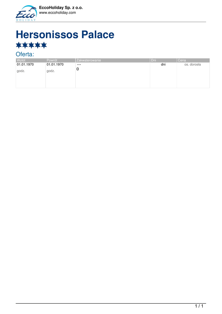 EccoHoliday Sp. z o.o. www.eccoholiday.com Hersonissos Palace Oferta: Wylot 01.01.1970 Powrót 01.01.1970 godz. godz. Zakwaterowanie -() Dni dni Cena os. dorosła 1/1 Powered by TCPDF (www.tcpdf.org)
