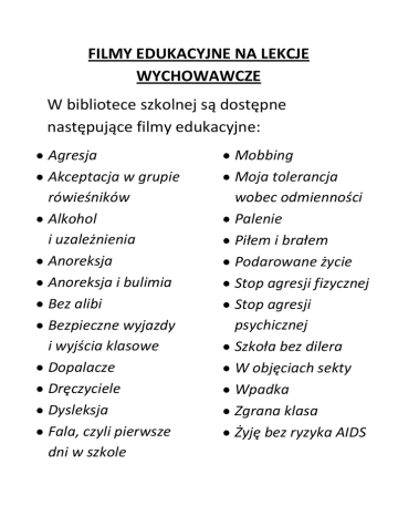 FILMY EDUKACYJNE NA LEKCJE WYCHOWAWCZE W bibliotece szkolnej są dostępne następujące filmy edukacyjne: Agresja Akceptacja w grupie rówieśników Alkohol i uzależnienia Anoreksja Anoreksja i bulimia Bez alibi Bezpieczne wyjazdy i wyjścia klasowe Dopalacze Dręczyciele Dysleksja Fala, czyli pierwsze dni w szkole Mobbing Moja tolerancja wobec odmienności Palenie Piłem i brałem Podarowane życie Stop agresji fizycznej Stop agresji psychicznej Szkoła bez dilera W objęciach sekty Wpadka Zgrana klasa Żyję bez ryzyka AIDS