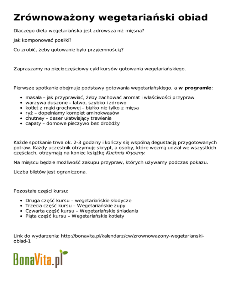 Zrównoważony wegetariański obiad Dlaczego dieta wegetariańska jest zdrowsza niż mięsna? Jak komponować posiłki? Co zrobić, żeby gotowanie było przyjemnością? Zapraszamy na pięcioczęściowy cykl kursów gotowania wegetariańskiego. Pierwsze spotkanie obejmuje podstawy gotowania wegetariańskiego, a w programie: masala – jak przyprawiać, żeby zachować aromat i właściwości przypraw warzywa duszone – łatwo, szybko i zdrowo kotlet z mąki grochowej – białko nie tylko z mięsa ryż – dopełniamy komplet aminokwasów chutney – deser ułatwiający trawienie capaty – domowe pieczywo bez drożdży Każde spotkanie trwa ok. 2-3 godziny i kończy się wspólną degustacją przygotowanych potraw. Każdy uczestnik otrzymuje skrypt, a osoby, które wezmą udział we wszystkich częściach, otrzymają na koniec książkę Kuchnia Kryszny. Na miejscu będzie możliwość zakupu przypraw, których używamy podczas pokazu. Liczba biletów jest ograniczona. Pozostałe części kursu: Druga część kursu – wegetariańskie słodycze Trzecia część kursu – Wegetariańskie zupy Czwarta część kursu – Wegetariańskie śniadania Piąta część kursu – Wegetariańskie kotlety Link do wydarzenia: http://bonavita.pl/kalendarz/cw/zrownowazony-wegetarianskiobiad-1