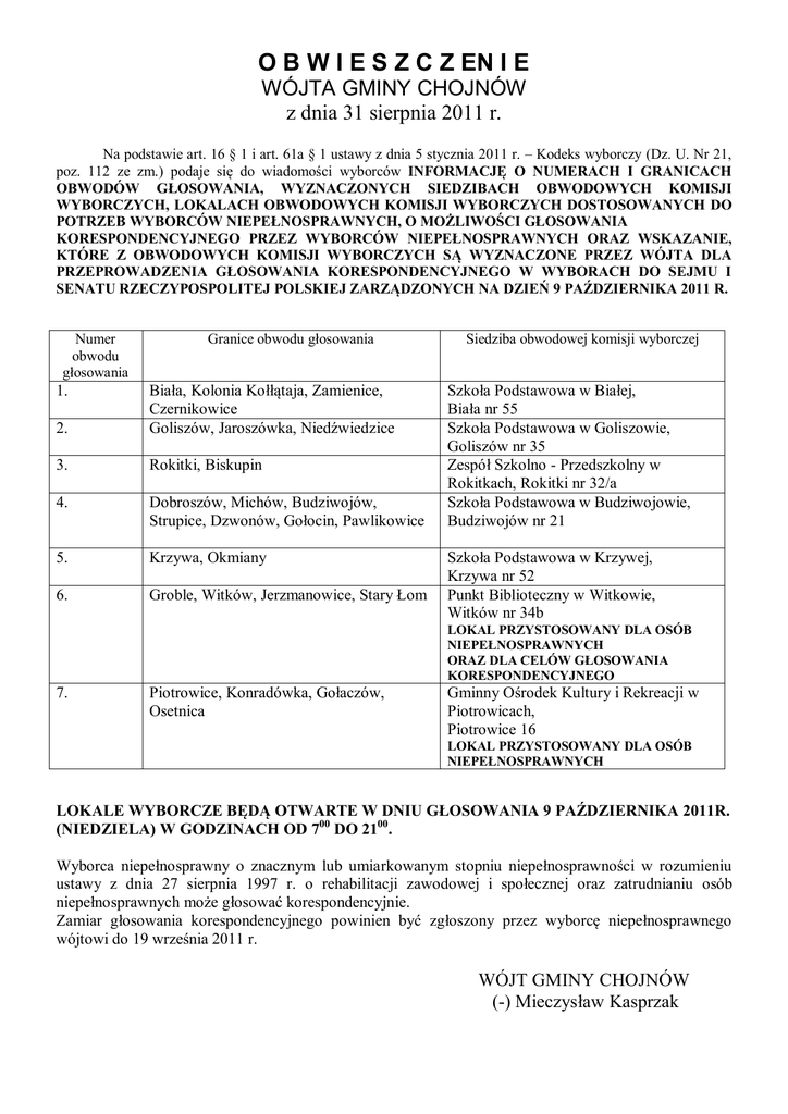 O B W I E S Z C Z EN I E WÓJTA GMINY CHOJNÓW z dnia 31 sierpnia 2011 r. Na podstawie art. 16 § 1 i art. 61a § 1 ustawy z dnia 5 stycznia 2011 r. – Kodeks wyborczy (Dz. U. Nr 21, poz. 112 ze zm.) podaje się do wiadomości wyborców INFORMACJĘ O NUMERACH I GRANICACH OBWODÓW GŁOSOWANIA, WYZNACZONYCH SIEDZIBACH OBWODOWYCH KOMISJI WYBORCZYCH, LOKALACH OBWODOWYCH KOMISJI WYBORCZYCH DOSTOSOWANYCH DO POTRZEB WYBORCÓW NIEPEŁNOSPRAWNYCH, O MOŻLIWOŚCI GŁOSOWANIA KORESPONDENCYJNEGO PRZEZ WYBORCÓW NIEPEŁNOSPRAWNYCH ORAZ WSKAZANIE, KTÓRE Z OBWODOWYCH KOMISJI WYBORCZYCH SĄ WYZNACZONE PRZEZ WÓJTA DLA PRZEPROWADZENIA GŁOSOWANIA KORESPONDENCYJNEGO W WYBORACH DO SEJMU I SENATU RZECZYPOSPOLITEJ POLSKIEJ ZARZĄDZONYCH NA DZIEŃ 9 PAŹDZIERNIKA 2011 R. Numer obwodu głosowania 1. Granice obwodu głosowania 2. Biała, Kolonia Kołłątaja, Zamienice, Czernikowice Goliszów, Jaroszówka, Niedźwiedzice 3. Rokitki, Biskupin 4. Dobroszów, Michów, Budziwojów, Strupice, Dzwonów, Gołocin, Pawlikowice 5. Krzywa, Okmiany 6. Groble, Witków, Jerzmanowice, Stary Łom Siedziba obwodowej komisji wyborczej Szkoła Podstawowa w Białej, Biała nr 55 Szkoła Podstawowa w Goliszowie, Goliszów nr 35 Zespół Szkolno - Przedszkolny w Rokitkach, Rokitki nr 32/a Szkoła Podstawowa w Budziwojowie, Budziwojów nr 21 Szkoła Podstawowa w Krzywej, Krzywa nr 52 Punkt Biblioteczny w Witkowie, Witków nr 34b LOKAL PRZYSTOSOWANY DLA OSÓB NIEPEŁNOSPRAWNYCH ORAZ DLA CELÓW GŁOSOWANIA KORESPONDENCYJNEGO 7. Piotrowice, Konradówka, Gołaczów, Osetnica Gminny Ośrodek Kultury i Rekreacji w Piotrowicach, Piotrowice 16 LOKAL PRZYSTOSOWANY DLA OSÓB NIEPEŁNOSPRAWNYCH LOKALE WYBORCZE BĘDĄ OTWARTE W DNIU GŁOSOWANIA 9 PAŹDZIERNIKA 2011R. (NIEDZIELA) W GODZINACH OD 700 DO 2100. Wyborca niepełnosprawny o znacznym lub umiarkowanym stopniu niepełnosprawności w rozumieniu ustawy z dnia 27 sierpnia 1997 r. o rehabilitacji zawodowej i społecznej oraz zatrudnianiu osób niepełnosprawnych może głosować korespondencyjnie. Zamiar głosowania korespondencyjnego powinien być zgłoszony przez wyborcę niepełnosprawnego wójtowi do 19 września 2011 r. WÓJT GMINY CHOJNÓW (-) Mieczysław Kasprzak