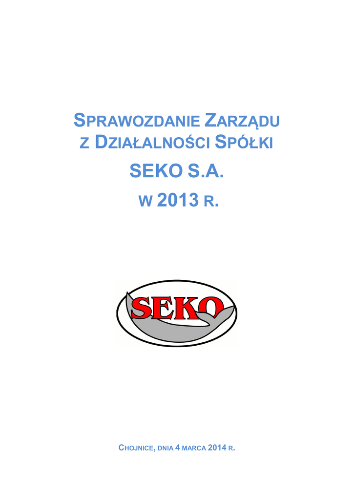 SPRAWOZDANIE ZARZĄDU Z DZIAŁALNOŚCI SPÓŁKI SEKO S.A. W 2013 R. CHOJNICE, DNIA 4 MARCA 2014 R. SPIS TREŚCI 1. ISTOTNE ZDARZENIE WPŁYWAJĄCE NA DZIAŁALNOŚĆ SPÓŁKI W 2013 ROKU ORAZ PO JEGO ZAKOŃCZENIU DO DNIA ZATWIERDZENIA SPRAWOZDANIA FINANSOWEGO ............... 4 2. OMÓWIENIE AKTUALNEJ I PRZEWIDYWANEJ SYTUACJI FINANSOWEJ ORAZ OMÓWIENIE PERSPEKTYW ROZWOJU DZIAŁALNOŚCI SPÓŁKI .................................................... 4 3. CHARAKTERYSTYKA CZYNNIKÓW RYZYKA I ZAGROŻEŃ ISTOTNYCH DLA ROZWOJU PRZEDSIĘBIORSTWA ................................................................................................................................... 5 4. DZIAŁALNOŚĆ BADAWCZO – ROZWOJOWA ................................................................................. 7 5. INFORMACJA O NABYCIU UDZIAŁÓW (AKCJI) WŁASNYCH..................................................... 7 6. INFORMACJA O POSIADANYCH ODDZIAŁACH ............................................................................ 8 7. INSTRUMENTY FINANSOWE .............................................................................................................. 8 8. ZATRUDNIENIE ...................................................................................................................................... 9 9. WSKAZANIE POSTĘPOWAŃ TOCZĄCYCH SIĘ PRZED SĄDEM, ORGANEM WŁAŚCIWYM DLA POSTĘPOWANIA ARBITRAŻOWEGO LUB ORGANEM ADMINISTRACJI PUBLICZNEJ ...... 9 10. INFORMACJE O PODSTAWOWYCH PRODUKTACH, TOWARACH I USŁUGACH............. 10 11. INFORMACJE O RYNKACH ZBYTU PRODUKTÓW I TOWARÓW SPÓŁKI ......................... 11 12. INFORMACJE O ZAWARTYCH ZNACZĄCYCH UMOWACH, W TYM UMOWACH ZAWARTYCH POMIĘDZY AKCJONARIUSZAMI .................................................................................. 14 13. POWIĄZANIA ORGANIZACYJNE I KAPITAŁOWE SEKO S.A. GŁÓWNE INWESTYCJE .. 14 14. TRANSAKCJE Z PODMIOTAMI POWIĄZANYMI ...................................................................... 14 15. ZACIĄGNIĘTE KREDYTY, UMOWY POŻYCZKI ....................................................................... 15 16. INFORMACJA O UDZIELONYCH POŻYCZKACH I PORĘCZENIACH Z UWZGLĘDNIENIEM TERMINU ICH WYMAGALNOŚCI ...................................................................... 16 17. EMISJA PAPIERÓW WARTOŚCIOWYCH W OKRESIE OBJĘTYM SPRAWOZDANIEM .... 16 18. RÓŻNICE POMIĘDZY WYNIKAMI FINANSOWYMI WYKAZANYMI W RAPORCIE ROCZNYM A WCZEŚNIEJ PUBLIKOWANYMI PROGNOZAMI ......................................................... 16 19. OCENA ZARZĄDZANIA ZASOBAMI FINANSOWYMI .............................................................. 16 20. OCENA MOŻLIWOŚCI REALIZACJI ZAMIERZEŃ INWESTYCYJNYCH ............................. 21 21. CZYNNIKI I NIETYPOWE ZDARZENIA MAJĄCE WPŁYW NA OSIĄGNIĘTY WYNIK ...... 21 22. CHARAKTERYSTYKA ZEWNĘTRZNYCH I WEWNĘTRZNYCH CZYNNIKÓW ISTOTNYCH DLA ROZWOJU PRZEDSIĘBIORSTWA EMITENTA ORAZ OPIS PERSPEKTYW ROZWOJU DZIAŁALNOŚCI ....................................................................................................................... 22 23. ZMIANY W PODSTAWOWYCH ZASADACH ZARZĄDZANIA PRZEDSIĘBIORSTWEM .... 22 24. UMOWY ZAWARTE POMIĘDZY EMITENTEM A OSOBAMI ZARZĄDZAJĄCYMI ............ 22 SPRAWOZDANIE ZARZĄDU Z DZIAŁALNOŚCI SPÓŁKI SEKO S.A. 2 25. WYNAGRODZENIA, NAGRODY LUB KORZYŚCI OSÓB ZARZĄDZAJĄCYCH I NADZORUJĄCYCH ...................................................................................................................................... 22 26. LICZBA I WARTOŚĆ NOMINALNA AKCJI SEKO S.A. BĘDĄCYCH W POSIADANIU OSÓB ZARZĄDZAJĄCYCH I NADZORUJĄCYCH ............................................................................................. 23 27. UMOWY, W WYNIKU KTÓRYCH MOGĄ W PRZYSZŁOŚCI NASTĄPIĆ ZMIANY W PROPORCJACH AKCJI POSIADANYCH PRZEZ GŁÓWNYCH AKCJONARIUSZY ........................ 24 28. SYSTEM KONTROLI PROGRAMÓW AKCJI PRACOWNICZYCH .......................................... 24 29. INFORMACJE DOTYCZĄCE PODMIOTU UPRAWNIONEGO DO BADANIA SPRAWOZDAŃ FINANSOWYCH ............................................................................................................................................ 24 30. SPRAWOZDANIE DOTYCZĄCE STOSOWANIA ZASAD ŁADU KORPORACYJNEGO PRZEZ SEKO S.A. (EMITENT LUB SPÓŁKA) W 2013 R......................................................................... 26 SPRAWOZDANIE ZARZĄDU Z DZIAŁALNOŚCI SPÓŁKI SEKO S.A. 3 1. Istotne zdarzenie wpływające na działalność Spółki w 2013 roku oraz po jego zakończeniu do dnia zatwierdzenia sprawozdania finansowego W dniu 6 marca 2013 r. Nadzwyczajne Walne Zgromadzenie Spółki podjęło uchwałę w sprawie zmiany Statutu Spółki poprzez zamianę akcji imiennych serii A na akcje na okaziciela oraz zniesienia uprzywilejowania akcji serii A. Uchwała została wpisana do KRS w dniu 15 kwietnia 2013 r. Następnie Spółka podjęła działania, których celem było wprowadzenie tych akcji do obrotu na rynku giełdowym. Prospekt emisyjny sporządzony w związku z ubieganiem się o dopuszczenie i wprowadzenie do obrotu na rynku regulowanym akcji serii A został zatwierdzony przez Komisję Nadzoru Finansowego w dniu 24 czerwca 2013 r., a same akcje zostały wprowadzone do obrotu na rynku regulowanym Giełdy Papierów Wartościowych w Warszawie z dniem 6 września 2013 r. W dniu 3 kwietnia 2013 r. Spółka zwarła z bankiem PKO BP S.A. umowę kredytu inwestycyjnego, na mocy której Spółce został udzielony kredyt w wysokości 14 mln zł z terminem spłaty przypadającym w dniu 3 kwietnia 2028 r. Pozyskane środki zostały przeznaczone m.in. na spłatę zadłużenia i zamknięcie umów kredytowych (kredytu inwestycyjnego i kredytów w rachunku bieżącym). Pozostała część środków z kredytu została przeznaczona na finansowanie bieżącej działalności Spółki. W ocenie Zarządu, zawarta umowa zapewni Spółce stabilne finansowanie w nad