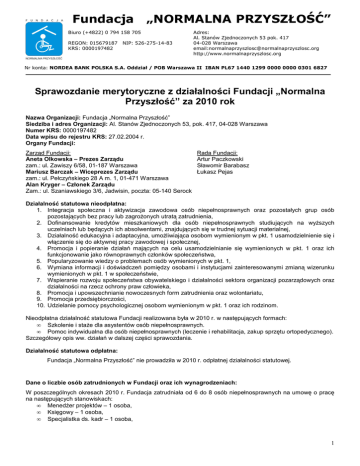 Fundacja „NORMALNA PRZYSZŁOŚĆ” Biuro (+4822) 0 794 158 705 REGON: 015679187 KRS: 0000197482 NIP: 526-275-14-83 Adres: Al. Stanów Zjednoczonych 53 pok. 417 04-028 Warszawa email:[email protected] http://www.normalnaprzyszlosc.org Nr konta: NORDEA BANK POLSKA S.A. Oddział / POB Warszawa II IBAN PL67 1440 1299 0000 0000 0301 6827 Sprawozdanie merytoryczne z działalności Fundacji „Normalna Przyszłość” za 2010 rok Nazwa Organizacji: Fundacja „Normalna Przyszłość” Siedziba i adres Organizacji: Al. Stanów Zjednoczonych 53, pok. 417, 04-028 Warszawa Numer KRS: 0000197482 Data wpisu do rejestru KRS: 27.02.2004 r. Organy Fundacji: Zarząd Fundacji: Aneta Olkowska – Prezes Zarządu zam.: ul. Zawiszy 6/58, 01-187 Warszawa Mariusz Barczak – Wiceprezes Zarządu zam.: ul. Pełczyńskiego 28 A m. 1, 01-471 Warszawa Alan Kryger – Członek Zarządu Zam.: ul. Szaniawskiego 3/6, Jadwisin, poczta: 05-140 Serock Rada Fundacji: Artur Paczkowski Sławomir Barabasz Łukasz Pejas Działalność statutowa nieodpłatna: 1. Integracja społeczna i aktywizacja zawodowa osób niepełnosprawnych oraz pozostałych grup osób pozostających bez pracy lub zagrożonych utratą zatrudnienia, 2. Dofinansowanie kredytów mieszkaniowych dla osób niepełnosprawnych studiujących na wyższych uczelniach lub będących ich absolwentami, znajdujących się w trudnej sytuacji materialnej, 3. Działalność edukacyjna i adaptacyjna, umożliwiająca osobom wymienionym w pkt. 1 usamodzielnienie się i włączenie się do aktywnej pracy zawodowej i społecznej, 4. Promocja i popieranie działań mających na celu usamodzielnianie się wymienionych w pkt. 1 oraz ich funkcjonowanie jako równoprawnych członków społeczeństwa, 5. Popularyzowanie wiedzy o problemach osób wymienionych w pkt. 1, 6. Wymiana informacji i doświadczeń pomiędzy osobami i instytucjami zainteresowanymi zmianą wizerunku wymienionych w pkt. 1 w społeczeństwie, 7. Wspieranie rozwoju społeczeństwa obywatelskiego i działalności sektora organizacji pozarządowych oraz działalności na rzecz ochrony praw człowieka, 8. Promocja i upowszechnianie nowoczesnych form zatrudnienia oraz wolontariatu, 9. Promocja przedsiębiorczości, 10. Udzielanie pomocy psychologicznej osobom wymienionym w pkt. 1 oraz ich rodzinom. Nieodpłatna działalność statutowa Fundacji realizowana była w 2010 r. w następujących formach: • Szkolenie i staże dla asystentów osób niepełnosprawnych. • Pomoc indywidualna dla osób niepełnosprawnych (leczenie i rehabilitacja, zakup sprzętu ortopedycznego). Szczegółowy opis ww. działań w dalszej części sprawozdania. Działalność statutowa odpłatna: Fundacja „Normalna Przyszłość” nie prowadziła w 2010 r. odpłatnej działalności statutowej. Dane o liczbie osób zatrudnionych w Fundacji oraz ich wynagrodzeniach: W poszczególnych okresach 2010 r. Fundacja zatrudniała od 6 do 8 osób niepełnosprawnych na umowę o pracę na następujących stanowiskach: • Menedżer projektów – 1 osoba, • Księgowy – 1 osoba, • Specjalistka ds. kadr – 1 osoba, 1 Fundacja „NORMALNA PRZYSZŁOŚĆ” Biuro (+4822) 0 794 158 705 REGON: 015679187 KRS: 0000197482 NIP: 526-275-14-83 Adres: Al. Stanów Zjednoczonych 53 pok. 417 04-028 Warszawa email:[email protected] http://www.normalnaprzyszlosc.org Nr konta: NORDEA BANK POLSKA S.A. Oddział / POB Warszawa II IBAN PL67 1440 1299 0000 0000 0301 6827 • • • • Specjalista do spraw aktywizacji zawodowej osób niepełnosprawnych – 1 osoba, Pracownice biurowe – 2 osoby, Webmaster – 1 osoba, Asystent Menedżera projektów - 1 osoba. Suma wynagrodzeń brutto etatowych pracowników Fundacji wyniosła w 2010 r. 127.054,00 złotych. Wynagrodzenia nie obejmowały nagród ani premii. Ponadto Fundacja zatrudniała pracowników na umowy zlecenie lub o dzieło przy realizacji poszczególnych projektów. Łączna kwota wypłaconych wynagrodzeń z tytułu umów zlecenia oraz o dzieło wyniosła w 2010 r. 118.180,00 złotych. Członkowie Zarządu i Rady Fundacji nie otrzymywali w 2010 r. wynagrodzenia z tytułu pełnionych funkcji. Informacja o wysokości otrzymanych przychodów z działalności statutowej z wyodrębnieniem ich źródeł: • • • Darowizny firm prywatnych (w tym fundacji) 8 500,00 zł Darowizny osób prywatnych 33 206,83 zł Wpłaty 1 % podatku na rzecz organizacji pożytku publicznego 32 548,63 zł Dotacje ze środków publicznych (Program Operacyjny Kapitał Ludzki) 269 356,91 zł Fundacja „Normalna Przyszłość” nie realizowała w 2010 r. odpłatnych świadczeń w ramach działalności statutowej. Informacje o działalności zleconej fundacji przez podmioty państwowe i samorządowe (usługi, państwowe zadania zlecone i zamówienia publiczne) oraz o wyniku finansowym tej działalności. Fundacja realizowała następujące zadania zlecone przez podmioty państwowe i samorządowe: • Projekt Łączymy ludzi – szkolenie dla asystentów osób niepełnosprawnych. Instytucja Wdrażająca: Mazowiecka Jednostka Wdrażania Programów Unijnych. Projekt finansowany ze środków Unii Europejskiej (Europejski Fundusz Społeczny) w ramach Programu Operacyjnego Kapitał Ludzki, Poddziałanie 7.2.1. Kwota dotacji: 269 456,00 zł. Kwota wykorzystana: 269 356,91 zł. Fundacja nie realizowała w 2010 r. usług dla podmiotów państwowych i samorządowych w trybie zamówień publicznych. Pozostałe informacje Wg stanu na dzień 31 grudnia 2010 r. Fundacja „Normalna Przyszłość” posiadała środki pieniężne na rachunkach bankowych w NORDEA BANK POLSKA w wysokości 52 844,05 złotych. Fundacja nie udzielała w 2010 r. żadnych pożyczek ani nie nabywała obligacji oraz udziałów i akcji w spółkach prawa handlowego. Fundacja nie otrzymała w 2010 r. żadnych darowizn rzeczowych. Fundacja na koniec 2010 r. posiadała następujące zobowiązania: • Z tytułu dostaw 108,51 zł • Z tytułu ubezpieczeń społecznych i podatku do