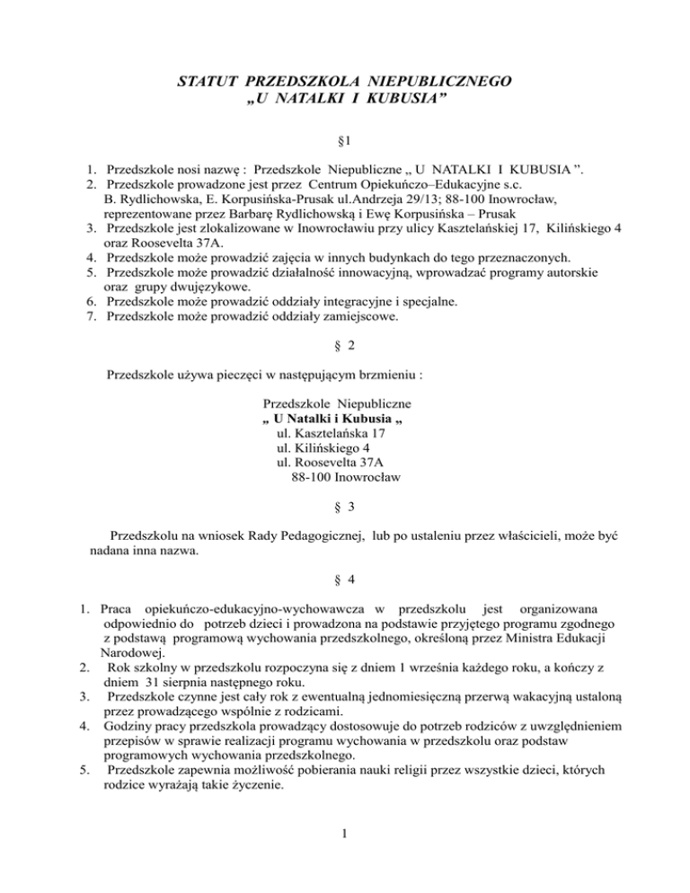 STATUT PRZEDSZKOLA NIEPUBLICZNEGO „U NATALKI I KUBUSIA”