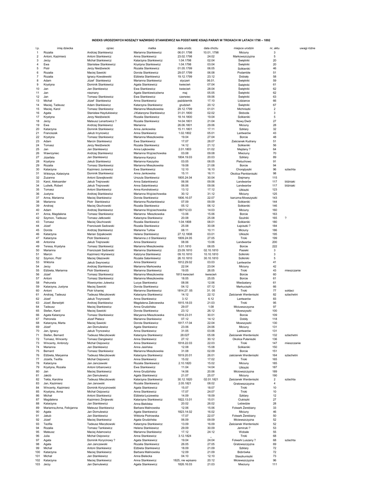 INDEKS URODZONYCH NOSZĄCY NAZWISKO STANKIEWICZ NA PODSTAWIE KSIĄG PARAFI W TROKACH W LATACH 1798 – 1892 l.p. 1 2 3 4 5 6 7 8 9 10 11 12 13 14 15 16 17 18 19 20 21 22 23 24 25 26 27 28 29 30 31 32 33 34 35 36 37 38 39 40 41 42 43 44 45 46 47 48 49 50 51 52 53 54 55 56 57 58 59 60 61 62 63 64 65 66 67 68 69 70 71 72 73 74 75 76 77 78 79 80 81 82 83 84 85 86 87 88 89 90 91 92 93 94 95 96 97 98 99 100 101 102 103 imię dziecka Rozalia Antoni, Kazimierz Jerzy Ewa Piotr Rozalia Rozalia Adam Krystyna Jan Jan Jan Michał Maciej, Tadeusz Maciej, Karol Agata Krystyna Jerzy Ewa Katarzyna Franciszek Krystyna Adam Tomasz Jan Wawrzyniec Józefata Krystyna Rozalia Katarzyna Wiktorya, Katarzyna Zuzanna Karol, Aleksander Ludwik, Robert Tomasz Justyna Anna, Marianna Marianna Andrzej Adam Anna, Magdalena Szymon, Tadeusz Tomasz Józef Dorota Katarzyna Katarzyna Antonina Teresa, Krystyna Marianna Marcin Szymon, Piotr Wiktoria Jerzy Elżbieta, Marianna Józef Antoni Petrunela Katarzyna, Justyna Antoni Andrzej, Tadeusz Józef Józef, Benedykt Tadeusz Stefan, Karol Agata Katarzyna Petronela Katarzyna, Marta Józef Jan, Ignacy Stefan, Bernard Tomasz, Wincenty Wincenty, Ambroży Marianna Bernard Elżbieta, Maryanna Józefa, Teofila Katarzyna Krystyna, Rozalia Jan Jakób Tekla, Karolina Jan, Kazimierz Wincenty, Kazimierz Krystyna, Anna Michał Magdalena Katarzyna Marianna,Anna, Felicjanna Agata Jakub Józef Teofila Rozalia Mateusz Julia Agata Agata Michał Katarzyna Michał Katarzyna Jerzy ojciec Andrzej Stankiewicz Antoni Stankiewicz Michał Stankiewicz Stanisław Stankiewicz Jerzy Niedźwiecki Maciej Sawicki Ignacy Kowalewski Józef Stankiewicz Dominik Stankiewicz Jan Stankiewicz nieznany Tomasz Stankiewicz Józef Stankiewicz Adam Stankiewicz Tomasz Stankiewicz Stanisław Haydukiewicz Jerzy Niedźwiecki Mateusz Lenartowicz ? Andrzej Stankiewicz Dominik Stankiewicz Jakub Ircynowicz Tomasz Stankiewicz Marcin Stankiewicz Jerzy Niedźwiecki Jan Stankiewicz Andrzej Stankiewicz Jan Stankiewicz Jakub Stankiewicz Tomasz Stankiewicz Kazimierz Juniewicz Dominik Stankiewicz Antoni Szwejkowski Jakub Trejnowski Jakub Trejnowski Antoni Stankiewicz Andrzej Stankiewicz Maciej Stankiewicz Piotr Stankiewicz Maciej Głuchowski Andrzej Stankiewicz Tomasz Stankiewicz Tomasz Jatkowski Maciej Głuchowski Franciszek Sadowski Andrzej Stankiewicz Marian Szpakowski Piotr Stankiewicz Jakub Trejnowski Tomasz Stankiewicz Franciszek Sadowski Kazimierz Hryniewicz Maciej Głazowski Jakub Swynowicz Andrzej Stankiewicz Piotr Stankiewicz Tomasz Stankiewicz Tomasz Stankiewicz Wawrzyniec Jutewicz Maciej Sawicki Piotr Ichaniej Tadeusz Mieczkowski Jakub Trzynowski Andrzej Stankiewicz Maciej Stankiewicz Maciej Sawicki Tomasz Stankiewicz Józef Płatacz Maciej Sawicki Jan Domulewicz Jakub Tryncewicz Tadeusz Mieczkowski Tomasz Dangiewicz Michał Osipowicz Jan Stankiewicz Tomasz Stankiewicz Tadeusz Mieczkowski Michał Osipowicz Jan Janczewski Antoni Urbanowicz Maciej Stankiewicz Jan Damulewicz Tadeusz Mieczkowski Jan Janowski Dominik Korycznowski Michał Osipowicz Antoni Stankiewicz Kazimierz Żmijewski Jan Stankiewicz Mateusz Stankiewicz Jan Domulewicz Jan Stankiewicz Maciej Stankiewicz Tadeusz Mieczkowski Tomasz Tankiewicz Maciej Adamowicz Michał Osipowicz Dominik Korycinowy ? Jan Janczewski Antoni Stankiewicz Maciej Stankiewicz Jan Stankiewicz Maciej Stankiewicz Jan Damulewicz matka Marianna Stankiewicz Anna Stankiewicz Katarzyna Stankiewicz Krystyna Stankiewicz Rozalia Stankiewicz Dorota Stankiewicz Elżbieta Stankiewicz Marianna Stankiewicz Agata Stankiewicz Ewa Stankiewicz Agata Stankiewiczówna Ewa Stankiewicz Anna Stankiewicz Katarzyna Stankiewicz Marianna Mieszkowska J\Katarzyna Stankiewicz Rozalia Stankiewicz Rozalia Stankiewicz Marianna Anna Jankowska Anna Stankiewicz Marianna Mieszkowska Ewa Stankiewicz Rozalia Stankiewicz Anna Lejkowska Marianna Wojciechowska Marianna Karpicz Marianna Kaszycka Marianna Mieszkowska Ewa Stankiewicz Anna Jankowska Urszula Stankiewicz Anna Satankiewicz Anna Satankiewicz Anna Kondratowicz Marianna Wojciechowska Dorota Stankiewicz Marianna Roztankiewicz Rozalia Stankiewicz Marianna Wojciechowska Marianna Mieszkowska Katarzyna Stankiewicz Rozalia Stankiewicz Rozalia Stankiewicz Marianna Turłow Helena Stankiewicz Marianna z d Stankiewicz Anna Stankiewicz Marianna Mieszkowska Marianna Stankiewicz Katzryna Stankiewicz Rozalia Satankiewicz Anna Stankiewicz Marianna Markowska Marianna Stankiewicz Marianna Mieszkowska Marianna Mieszkowska Lucya Stankiewicz Dorota Stankiewicz Marianna Stankiewicz Katarzyna Stankiewicz Anna Stankiewicz Magdalena Zakrzewska Anna Grudzińska Dorota Stankiewicz Maryanna Mieszkowska Marianna Stankiewicz Dorota Stankiewicz Agata Stankiewicz Anna Stankiewicz Katarzyna Stankiewicz Anna Stankiewicz Anna Stankiewicz Anna Jasińska Marianna Mieszkowska Katarzyna Stankiewicz Anna Stankiewicz Rozalia Stankiewicz Ewa Stankiewicz Anna Grudzińska Agata Stankiewicz Katarzyna Stankiewicz Rozalia Stankiewicz Agata Stankiewicz Anna Stankiewicz Elżbieta Łyczewska Katarzyna Stankiewicz Anna Biekilska Barbara Malinowska Agata Stankiewicz Wiktoria Piotrowska Agata Grudzińska Katarzyna Stankiewicz Helena Stankiewicz Marianna Stankiewicz Anna Stankiewicz Agata Stankiewicz Rozalia Stankiewicz Elżbieta Stankiewicz Barbara Malinowska Anna Bielecka Anna Stankiewicz Agata Stankiewicz data urodz. 06.01.1798 23.02.1798 1.04.1798 1.04.1798 01.05.1799 29.07.1799 19.12.1799 styczeń kwiecień kwiecień maj czerwiec październik grudzień 29.12.1799 31.01.1800 18.14.1800 14.04.1801 26.06.1801 15.11.1801 1.02.1802 19.04 17.07 14.12 2.01.1803 03.08 1804.19.03 03.05 19.08 12.10 15.11 1805.24.04 06.06 06.06 13.12 30.12 1806.16.07 07.09 05.12 180712.03 13.06 20.08 1.04.1808 25.08 08.11 27.12.1808 1809.24.05 08.06 5.01.1810 23.09.1810 09.10.1810 26.10.1810 1812.29.02 22.04 19.05 1813 kwiecień 18.05 08.06 04.12 1814.27. 05 14.12 3.12 1815.18.03 29.07 23.12 1816.23.01 07.12 1817.17.04 23.06 31.05 28.027 27.12 1818.22.03 1