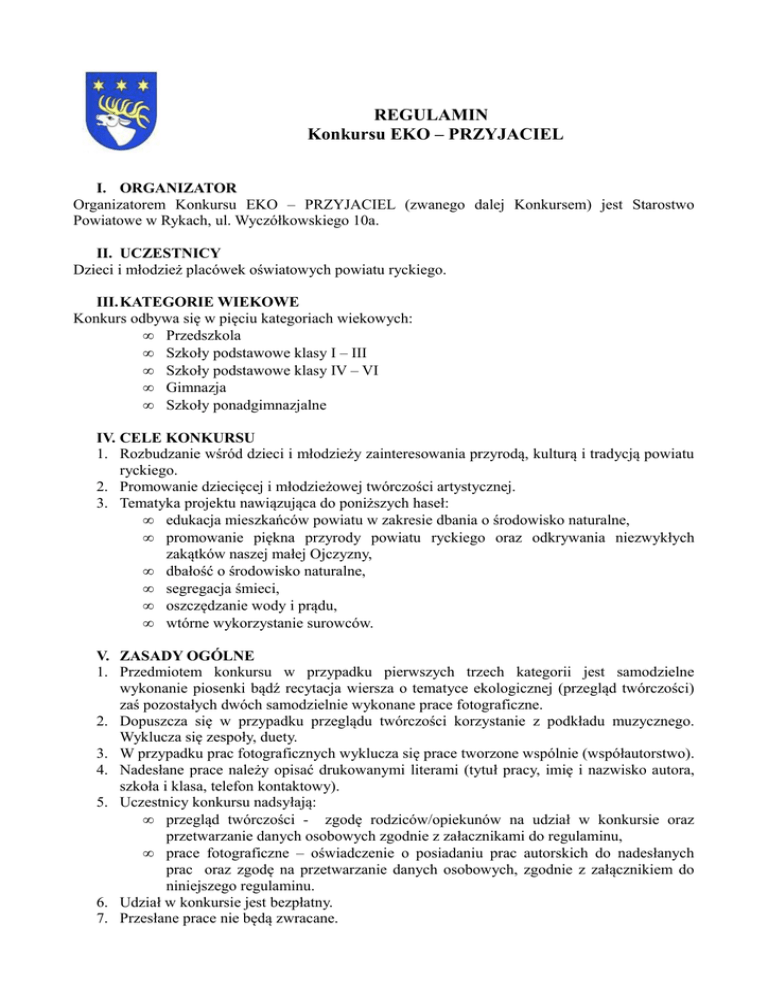 REGULAMIN Konkursu EKO – PRZYJACIEL I. ORGANIZATOR Organizatorem Konkursu EKO – PRZYJACIEL (zwanego dalej Konkursem) jest Starostwo Powiatowe w Rykach, ul. Wyczółkowskiego 10a. II. UCZESTNICY Dzieci i młodzież placówek oświatowych powiatu ryckiego. III.KATEGORIE WIEKOWE Konkurs odbywa się w pięciu kategoriach wiekowych: • Przedszkola • Szkoły podstawowe klasy I – III • Szkoły podstawowe klasy IV – VI • Gimnazja • Szkoły ponadgimnazjalne IV. CELE KONKURSU 1. Rozbudzanie wśród dzieci i młodzieży zainteresowania przyrodą, kulturą i tradycją powiatu ryckiego. 2. Promowanie dziecięcej i młodzieżowej twórczości artystycznej. 3. Tematyka projektu nawiązująca do poniższych haseł: • edukacja mieszkańców powiatu w zakresie dbania o środowisko naturalne, • promowanie piękna przyrody powiatu ryckiego oraz odkrywania niezwykłych zakątków naszej małej Ojczyzny, • dbałość o środowisko naturalne, • segregacja śmieci, • oszczędzanie wody i prądu, • wtórne wykorzystanie surowców. V. ZASADY OGÓLNE 1. Przedmiotem konkursu w przypadku pierwszych trzech kategorii jest samodzielne wykonanie piosenki bądź recytacja wiersza o tematyce ekologicznej (przegląd twórczości) zaś pozostałych dwóch samodzielnie wykonane prace fotograficzne. 2. Dopuszcza się w przypadku przeglądu twórczości korzystanie z podkładu muzycznego. Wyklucza się zespoły, duety. 3. W przypadku prac fotograficznych wyklucza się prace tworzone wspólnie (współautorstwo). 4. Nadesłane prace należy opisać drukowanymi literami (tytuł pracy, imię i nazwisko autora, szkoła i klasa, telefon kontaktowy). 5. Uczestnicy konkursu nadsyłają: • przegląd twórczości - zgodę rodziców/opiekunów na udział w konkursie oraz przetwarzanie danych osobowych zgodnie z załacznikami do regulaminu, • prace fotograficzne – oświadczenie o posiadaniu prac autorskich do nadesłanych prac oraz zgodę na przetwarzanie danych osobowych, zgodnie z załącznikiem do niniejszego regulaminu. 6. Udział w konkursie jest bezpłatny. 7. Przesłane prace nie będą zwracane. VI. ZASADY SZCZEGÓŁOWE 1. Przedmiot konkursu: • przegląd twórczości – samodzielne wykonanie jednej piosenki bądź recytacja jednego wiersza o tematyce ekologicznej zgodnej z celami konkursu; • prace fotograficzne - nadesłanie maksymalnie do trzech fotografii jednego uczestnika zgodnych z celami konkursu. 2. Podczas przeglądu twórczości jury w swojej ocenie kierować się będzie następującymi kryteriami: • wykonanie, • walory wychowawcze oraz przekaz ekologiczny, • ogólny wyraz artystyczny. 3. Każda z placówek w poszczególnych kategoriach przeglądu twórczości może zgłosić maksymalnie dwóch przedstawicieli. Miejsce i termin przeglądu będą uzależnione od liczby nadesłanych zgłoszeń. Placówki oświatowe o miejscu oraz terminie przeglądu będą poinformowane telefonicznie co najmniej na trzy dni przed przesłuchaniami, nie później jednak niż do 26 października 2015 roku. 4. Technika wykonania zdjęć jest dowolna, przy czym fotografie powstałe w rezultacie wyraźnej ingerencji graficznej będą odrzucone. Dopuszcza się: konwersję zdjęć kolorowych do czarno – białych lub sepii, nakładanie kolorowych filtrów itp., oraz korektę polepszającą jakość zdjęć (wyostrzanie, kontrast, nasycenie, rozjaśnienie). Nie będą akceptowane prace z których jakiekolwiek elementy zostały usunięte lub dodane w wyniku obróbki graficznej lub powstałe w wyniku połączenia różnych fotografii (kolaże i fotomontaże). Format wywołanej fotografii nie może być mniejszy niż 18x24 cm (bez żadnych znaków graficznych). Oryginalne fotografie należy zapisać na płycie CD lub DVD załączonej do pracy w formacie plików JPEG. Rozdzielczość zdjęcia potrzebna do wydruku musi być do 300 dpi, przystosowanego do wydruku w formacie 18x24 cm. 5. Organizator nie ogranicza liczby uczestników z danej placówki oświatowej w zakresie prac fotograficznych. VII. TERMINY 1. Zgłoszenia do przeglądu twórczości oraz prace fotograficzne należy przekazać osobiście lub przesłać drogą pocztową do dnia 21 października 2015 roku (ostateczny dzień wpływu) na adres: Starostwo Powiatowe w Rykach ul. Wyczółkowskiego 10a 08-500 Ryki z dopiskiem: Konkurs EKO – PRZYJACIEL 2. O terminie oraz miejscu przeglądu twórczości oraz wręczeniu nagród laureatom Organizator powiadomi telefonicznie placówki oświatowe na co najmniej trzy dni przed przesłuchaniem/wręczeniem nagród. VIII. OGŁOSZENIE WYNIKÓW I NAGRODY Oceny prac oraz przesłuchań twórczości dokonają Komisje Konkursowe, powołane przez Organizatora. Zwycięzcy otrzymają nagrody rzeczowe. Nagrody dofinansowane są przez Wojewódzki Fundusz Ochrony Środowiska i Gospodarki Wodnej w Lublinie. …........................................... Załącznik do Regulaminu pieczęć placówki oświatowej KARTA ZGŁOSZENIA prace fotograficzne „EKO PRZYJACIEL” Imię i nazwisko …........................................................................ (wypełnić obowiązkowo) Klasa …............................................ (wypełnić obowiązkowo) Nazwa i adres szkoły …........................................................................................ (wypełnić obowiązkowo) Telefon szkoły ….............................................. e-mail: …............................................................. (wypełnić obowiązkowo) Lp. (wypełnić obowiązkowo) Tytuł pracy 1. Oświadczam, że jestem autorem prac, które zgłaszam do konkursu oraz posiadam do nich pełne prawa autorskie. 2. Wyrażam zgodę na przetwarzanie moich danych osobowych przez Organizatora Konkursu EKO PRZYJACIEL w celach wynikających z regulaminu tego Konkursu, zgodnie z ustawą z dnia 29 sierpnia 1997 roku o ochronie danych osobowych (j.t. Dz. U. z 2014 r., poz. 1182 z późn. zm.). Poprzez wysłanie zdjęć na Ko