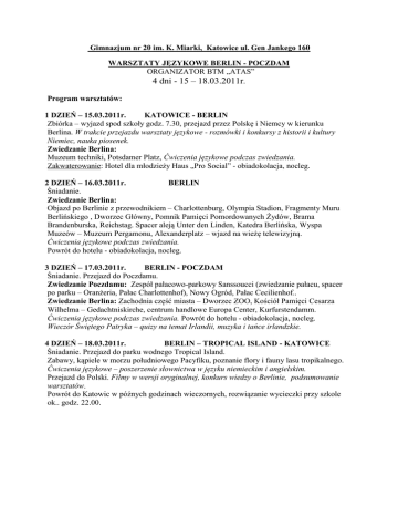 Gimnazjum nr 20 im. K. Miarki, Katowice ul. Gen Jankego 160 WARSZTATY JĘZYKOWE BERLIN - POCZDAM ORGANIZATOR BTM „ATAS” 4 dni - 15 – 18.03.2011r. Program warsztatów: 1 DZIEŃ – 15.03.2011r. KATOWICE - BERLIN Zbiórka – wyjazd spod szkoły godz. 7.30, przejazd przez Polskę i Niemcy w kierunku Berlina. W trakcie przejazdu warsztaty językowe - rozmówki i konkursy z historii i kultury Niemiec, nauka piosenek. Zwiedzanie Berlina: Muzeum techniki, Potsdamer Platz, Ćwiczenia językowe podczas zwiedzania. Zakwaterowanie: Hotel dla młodzieży Haus „Pro Social” - obiadokolacja, nocleg. 2 DZIEŃ – 16.03.2011r. BERLIN Śniadanie. Zwiedzanie Berlina: Objazd po Berlinie z przewodnikiem – Charlottenburg, Olympia Stadion, Fragmenty Muru Berlińskiego , Dworzec Główny, Pomnik Pamięci Pomordowanych Żydów, Brama Brandenburska, Reichstag. Spacer aleją Unter den Linden, Katedra Berlińska, Wyspa Muzeów – Muzeum Pergamonu, Alexanderplatz – wjazd na wieżę telewizyjną. Ćwiczenia językowe podczas zwiedzania. Powrót do hotelu - obiadokolacja, nocleg. 3 DZIEŃ – 17.03.2011r. BERLIN - POCZDAM Śniadanie. Przejazd do Poczdamu. Zwiedzanie Poczdamu: Zespół pałacowo-parkowy Sanssoucci (zwiedzanie pałacu, spacer po parku – Oranżeria, Pałac Charlottenhof), Nowy Ogród, Pałac Cecilienhof.. Zwiedzanie Berlina: Zachodnia część miasta – Dworzec ZOO, Kościół Pamięci Cesarza Wilhelma – Gedachtniskirche, centrum handlowe Europa Center, Kurfurstendamm. Ćwiczenia językowe podczas zwiedzania. Powrót do hotelu - obiadokolacja, nocleg. Wieczór Świętego Patryka – quizy na temat Irlandii, muzyka i tańce irlandzkie. 4 DZIEŃ – 18.03.2011r. BERLIN – TROPICAL ISLAND - KATOWICE Śniadanie. Przejazd do parku wodnego Tropical Island. Zabawy, kąpiele w morzu południowego Pacyfiku, poznanie flory i fauny lasu tropikalnego. Ćwiczenia językowe – poszerzenie słownictwa w języku niemieckim i angielskim. Przejazd do Polski. Filmy w wersji oryginalnej, konkurs wiedzy o Berlinie, podsumowanie warsztatów. Powrót do Katowic w późnych godzinach wieczornych, rozwiązanie wycieczki przy szkole ok.. godz. 22.00.