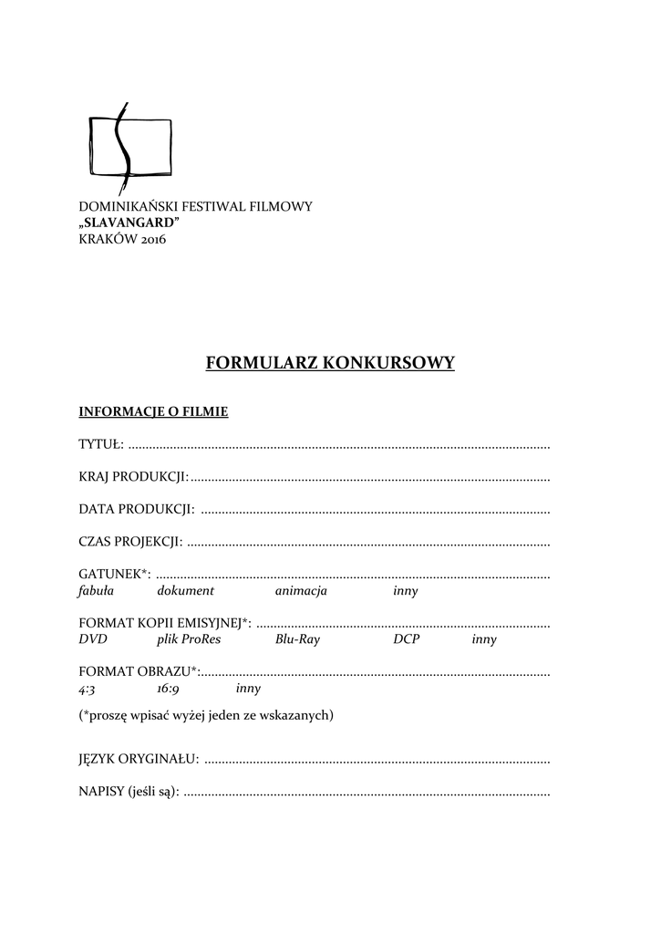 DOMINIKAŃSKI FESTIWAL FILMOWY „SLAVANGARD” KRAKÓW 2016 FORMULARZ KONKURSOWY INFORMACJE O FILMIE TYTUŁ: .......................................................................................................................... KRAJ PRODUKCJI: ........................................................................................................ DATA PRODUKCJI: ..................................................................................................... CZAS PROJEKCJI: ......................................................................................................... GATUNEK*: .................................................................................................................. fabuła dokument animacja inny FORMAT KOPII EMISYJNEJ*: ..................................................................................... DVD plik ProRes Blu-Ray DCP inny FORMAT OBRAZU*: ..................................................................................................... 4:3 16:9 inny (*proszę wpisać wyżej jeden ze wskazanych) JĘZYK ORYGINAŁU: .................................................................................................... NAPISY (jeśli są): .......................................................................................................... OPIS FILMU (do 450 znaków ze spacjami) INFORMACJE O REŻYSERZE: IMIĘ I NAZWISKO: ....................................................................................................... ROK URODZENIA: ...................................................................................................... TELEFON: ..................................................................................................................... ADRES E-MAIL: ............................................................................................................ ADRES KORESPONDENCYJNY: Ulica: Nr domu: Nr lokalu: Kod pocztowy: Miejscowość: Województwo: KILKA INFORMACJI Z ŻYCIA (do 350 znaków ze spacjami) INFORMACJE O WSPÓŁTWÓRCACH FILMU: SCENARIUSZ (imię i nazwisko, e-mail, telefon kontaktowy): ........................................................................................................................................ ZDJĘCIA (imię i nazwisko, e-mail, telefon kontaktowy): ........................................................................................................................................ MONTAŻ (imię i nazwisko, e-mail, telefon kontaktowy): ........................................................................................................................................ GŁÓWNA ROLA MĘSKA (imię i nazwisko, e-mail, telefon kontaktowy): ........................................................................................................................................ GŁÓWNA ROLA ŻEŃSKA (imię i nazwisko, e-mail, telefon kontaktowy): ........................................................................................................................................ OŚWIADCZENIE OSOBY ZGŁASZAJĄCEJ FILM Oświadczam, że zapoznałem się z regulaminem Dominikańskiego Festiwalu Filmowego „Slavangard” w Krakowie. Zgłaszany film jest oryginalnym wytworem mojej twórczości lub twórców, których mam prawo reprezentować. Wyrażam zgodę na przetwarzanie i publikację moich danych osobowych w celach związanych z organizacją Dominikańskiego Festiwalu Filmowego „Slavangard” oraz na publiczne emisje zgłoszonego filmu podczas projekcji festiwalowych i pokazów promujących Dominikański Festiwal Filmowy „Slavangard”. Zgłaszam film do udziału w Dominikańskim Festiwalu Filmowym „Slavangard” i akceptuję regulamin Dominikańskiego Festiwalu Filmowego „Slavangard”. Do zgłoszenia załączam kopię preselekcyjną filmu w formacie wymienionym powyżej. IMIĘ I NAZWISKO: ...................................................................................................... ROK URODZENIA: ...................................................................................................... TELEFON: ..................................................................................................................... ADRES E-MAIL: ............................................................................................................