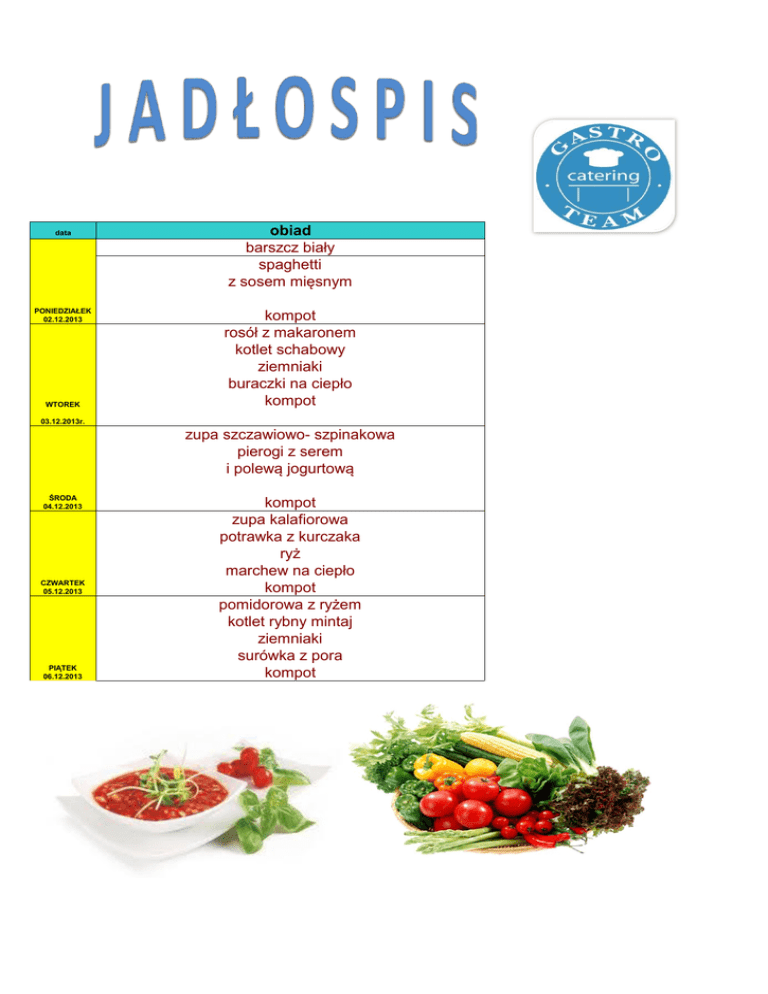 data PONIEDZIAŁEK 02.12.2013 WTOREK obiad barszcz biały spaghetti z sosem mięsnym kompot rosół z makaronem kotlet schabowy ziemniaki buraczki na ciepło kompot 03.12.2013r. zupa szczawiowo- szpinakowa pierogi z serem i polewą jogurtową ŚRODA 04.12.2013 CZWARTEK 05.12.2013 PIĄTEK 06.12.2013 kompot zupa kalafiorowa potrawka z kurczaka ryż marchew na ciepło kompot pomidorowa z ryżem kotlet rybny mintaj ziemniaki surówka z pora kompot zupa szczawiowo- szpinakowa pierogi z serem i polewą jogurtową kompot
