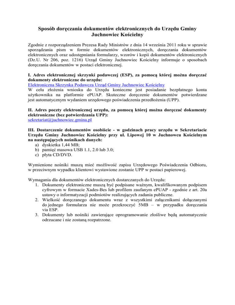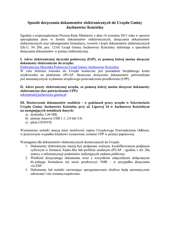 Sposób doręczania dokumentów elektronicznych do Urzędu Gminy