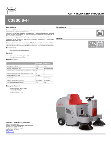 KARTA TECHNICZNA PRODUKTU CS800 B-H Opis produk tu Zas tos ow an ie Zamiatarki CS800 Comac są przystosowane do czyszczenia powierzchni handlowych o wielkości do 10 000 metrów kwadratowych. CS800 B-H to maszyny z napędem automatycznym, z miejscem dla operatora, dostępne w wersji zasilanej akumulatorem lub silnikiem benzynowym, o zasięgu roboczym od 70 do 80 cm (szczotka centralna). Większy model z tej gamy z dwiema bocznymi szczotkami ma zasięg roboczy 112 cm. Zamiatarki te są dostępne z pojemnikiem na odpady podnoszonym i opróżnianym automatycznie (CS800 B/H). Wersje z silnikiem o zapłonie iskrowym (CS800 H) posiadają kompletną instalację hydrauliczną i nie mają kart elektronicznych. Pozwala to na zwiększenie niezawodności i zapewnia maksymalną wydajność w przypadku czyszczenia silnie zabrudzonych posadzek. Zas tos ow an ie Maszyna do użytku przemysłowego Zas ilan ie Maszyna zasilana bateryjnie - 24 V Maszyna z silnikiem Diesla D an e te c h n ic zn e CS800 B CS800 H W ydajność (m 2/h) 6.800 6.800 Długość cyk lu pracy (h) 3-5 Nieograniczona Szerok ość czyszczenia szczotk ą centralną (cm ) 80 80 Szerok ość czyszczenia szczotk ą boczną (cm ) 95 95 Silnik elek tryczny (V/W ) 24/400 - Silnik (KM) - Honda (5,5) System opróżniania zbiornik a Elek tryczne Elek tryczne Poj. zbiornik a na odpady (l) 105 105 D os tę pn e ak c e s oria bateria kwasowa 24V / 210A h prostownik 24V / 40A szczotka boczna PPL szczotka centralna PPL I m porte r i dys trybutor ge n e raln y A GA PIT Sp. z. o.o. Sp. k. 10-302 O lsztyn, ul. Marii Zientary-Malewskiej 26 Tel. (89) 526 53 85, 526 74 41 Fax (89) 526 53 85 wew. 22,23 infolinia: 800 70 70 70 www.agapit.pl [email protected] Zas ilan ie
