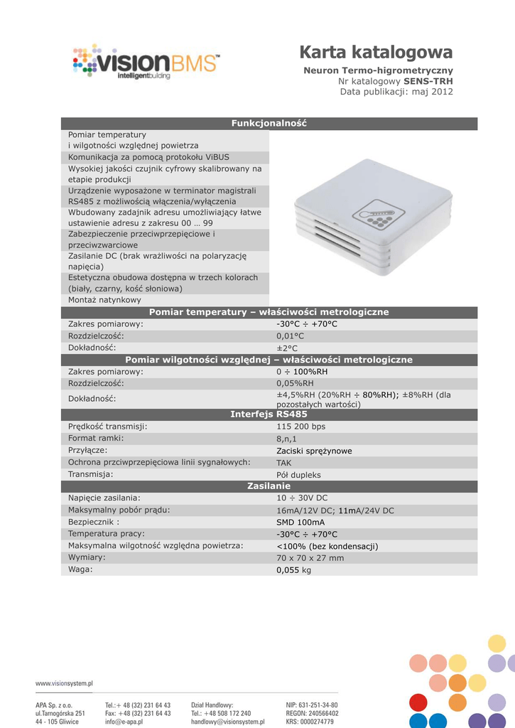 Karta katalogowa Neuron Termo-higrometryczny Nr katalogowy SENS-TRH Data publikacji: maj 2012 Funkcjonalność Pomiar temperatury i wilgotności względnej powietrza Komunikacja za pomocą protokołu ViBUS Wysokiej jakości czujnik cyfrowy skalibrowany na etapie produkcji Urządzenie wyposażone w terminator magistrali RS485 z możliwością włączenia/wyłączenia Wbudowany zadajnik adresu umożliwiający łatwe ustawienie adresu z zakresu 00 … 99 Zabezpieczenie przeciwprzepięciowe i przeciwzwarciowe Zasilanie DC (brak wrażliwości na polaryzację napięcia) Estetyczna obudowa dostępna w trzech kolorach (biały, czarny, kość słoniowa) Montaż natynkowy Pomiar temperatury – właściwości metrologiczne Zakres pomiarowy: -30°C ÷ +70°C Rozdzielczość: 0,01°C Dokładność: ±2°C Pomiar wilgotności względnej – właściwości metrologiczne Zakres pomiarowy: 0 ÷ 100%RH Rozdzielczość: 0,05%RH ±4,5%RH (20%RH ÷ 80%RH); ±8%RH (dla pozostałych wartości) Dokładność: Interfejs RS485 Prędkość transmisji: 115 200 bps Format ramki: 8,n,1 Przyłącze: Zaciski sprężynowe Ochrona przciwprzepięciowa linii sygnałowych: TAK Transmisja: Pół dupleks Zasilanie Napięcie zasilania: 10 ÷ 30V DC Maksymalny pobór prądu: 16mA/12V DC; 11mA/24V DC Bezpiecznik : SMD 100mA Temperatura pracy: -30°C ÷ +70°C Maksymalna wilgotność względna powietrza: <100% (bez kondensacji) Wymiary: 70 x 70 x 27 mm Waga: 0,055 kg