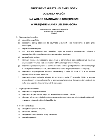 PREZYDENT MIASTA JELENIEJ GÓRY OGŁASZA NABÓR NA WOLNE STANOWISKO URZĘDNICZE W URZĘDZIE MIASTA JELENIA GÓRA stanowisko ds. rejestracji pojazdów w Wydziale Komunikacji (1 etat) 1. Wymagania niezbędne: a) obywatelstwo polskie, b) posiadanie pełnej zdolności do czynności prawnych oraz korzystanie z pełni praw publicznych, c) nieposzlakowana opinia, d) brak skazania prawomocnym wyrokiem sądu za umyślne przestępstwo ścigane z oskarżenia publicznego lub umyślne przestępstwo skarbowe, e) wykształcenie wyższe, f) minimum roczne doświadczenie zawodowe w administracji samorządowej lub rządowej (dopuszczalny również staż absolwencki z Powiatowego Urzędu Pracy), g) znajomość przepisów prawa z zakresu ustaw: kodeks postępowania administracyjnego w szczególności Dział I, II i VII, ustawa Prawo o ruchu drogowym Dział I i III Pojazdy, h) znajomość rozporządzenia Ministra Infrastruktury z dnia 22 lipca 2002 r. w sprawie rejestracji i oznaczania pojazdów, i) znajomość rozporządzenia Ministra Infrastruktury z dnia 27 września 2003r. w sprawie szczegółowych czynności organów w sprawach związanych z dopuszczeniem pojazdu do ruchu oraz wzorów dokumentów w tych sprawach. 2. Wymagania dodatkowe: a) znajomość obsługi komputera, b) znajomość języka niemieckiego lub angielskiego w mowie i piśmie, c) minimum półroczne doświadczenie na stanowisku urzędniczym w administracji publicznej związane z bezpośrednią obsługą klienta. 3. Cechy kandydata: a) umiejętność pracy w zespole, b) odporność na stres, c) umiejętność bezpośredniej pracy z klientem, d) komunikatywność. 1 4. Zakres wykonywanych zadań na stanowisku m.in.: Zakres wykonywanych zadań na stanowisku realizowany będzie w 2 etapach, tj.: I ETAP: Wykonuje zadania pomocnicze związane z rejestracją pojazdów z zachowaniem warunków określonych w ustawie Prawo o ruchu drogowym i przepisach wykonawczych do ustawy oraz przepisach odrębnych a w szczególności: a) przyjmowanie wniosków i właściwa weryfikacja dołączonych do nich dokumentów w sprawie rejestracji pojazdów zgodnie z obowiązującymi przepisami prawa tj. ustawą o ruchu drogowym i przepisami wykonawczymi do tej ustawy. b) pomoc przy wydawaniu dokumentów właścicielom pojazdów po zarejestrowaniu pojazdu, przed ich wydaniem prowadzi ich właściwą weryfikację w tym kontrolę w zakresie posiadania aktualnego dokumentu potwierdzającego zawarcie umowy obowiązkowego ubezpieczenia odpowiedzialności cywilnej uiszczenia opłaty (OC) posiadacza pojazdu mechanicznego. c) pomoc w zakresie czynności materialno – technicznych jak kserowanie dokumentów, przygotowanie i wysyłka korespondencji wydziałowej itp. II. ETAP - po spełnieniu określonych wymogów przez pracownika i uzyskaniu z PWPW S.A uprawnień do systemu „ POJAZD” pracownik będzie realizował następujące zadania: Wykonywanie zadań związanych z rejestracją i wyrejestrowaniem pojazdów oraz wykonywanie innych czynności związanych z dopuszczeniem pojazdów do ruchu, w systemie teleinformatycznym z zachowaniem warunków określonych w ustawie Prawo o ruchu drogowym i przepisach wykonawczych do ustawy oraz przepisach odrębnych, a w szczególności: a) dokonywaniem rejestracji i wyrejestrowania pojazdów samochodowych, przyczep i naczep oraz motocykli i motorowerów, po pozytywnej weryfikacji wniosku i załączonych do wniosku wymaganych przepisami prawa dokumentów, b) prowadzenie postępowań administracyjnych w sprawach dot. rejestracji pojazdów i innych czynności związanych z dopuszczeniem pojazdów do ruchu ( rejestracja pojazdów, odmowa rejestracji, uchylania rejestracji, zmiany decyzji w zakresie zarejestrowanych pojazdów itp.), c) wydawaniem skierowania na przeprowadzenie dodatkowych badań technicznych pojazdów w przypadkach określonych w przepisach, d) wydawanie wtórników: dowodów rejestracyjnych, pozwoleń czasowych, nalepek kontrolnych na szybę, nalepek na tablice tymczasowe, kart pojazdów, tablic rejestracyjnych oraz nowe znaki legalizacyjne w przypadkach ich zniszczenia lub utraty, e) wymienianie dowodów rejestracyjnych w przypadku ich zniszczenia lub wymiany z powodu braku miejsca na kolejne wpisy terminów badań technicznych, f) wydawanie tablic tymczasowych (na wniosek) zgodnie z obowiązującymi przepisami, g) dokonywanie zmian w przypadku zawiadomienia przez właściciela pojazdu o zmianie stanu faktycznego wymagającej zmiany danych zamieszczonych w dowodzie rejestracyjnym, h) tworzenie i archiwizowanie indywidualnych teczek tzw. „akt pojazdów” powstałych z dokumentów przedstawionych do rejestracji lub wyrejestrowania pojazdów a także przy 2 innych czynnościach związanych z dopuszczeniem pojazdu do ruchu, dbałość o dokumentację w tym zakresie - zgodnie z obowiązującymi przepisami, i) prowadzeniem w przypadku awarii systemu teleinformatycznego rejestracji i wyrejestrowania pojazdów oraz wykonywaniem innych czynności związanych z dopuszczeniem pojazdów do ruchu – zgodnie z obowiązującymi w tym zakresie przepisami, j) przyjmowaniem odpowiednich dowodów wpłat za określone przepisami opłaty stosownie do prowadzonego postępowania, 5. Informacja o warunkach pracy na danym stanowisku: a) praca na parterze budynku Urzędu Miasta przy ul. Sudeckiej 29. Ciągi komunikacyjne w budynku o odpowiedniej szerokości, w pomieszczeniu pracy odpowiednia szerokość dojść i przejść, budynek nie jest wyposażony w windę, b) stanowisko związane z pracą przy monitorze ekranowym, obsługą klientów, rozmowami telefonicznymi. 6. Wymagane dokumenty: a) życiorys (CV), b) list motywacyjny, c) oświadczenie o treści: ”Posiadam pełną zdolność do czynności prawnych oraz korzystam z pełni praw publicznych, nie byłam (byłem) skazana (y) prawomocnym wyrokiem sądu za umyślne przestępstwo ścigane z oskarżenia publicznego lub umyślne przestępstwo skarbowe”, d) kopia dokumentu tożsamości, e) kopi