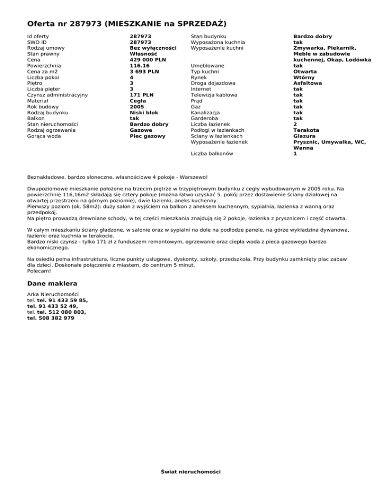 Oferta nr 287973 (MIESZKANIE na SPRZEDAŻ)