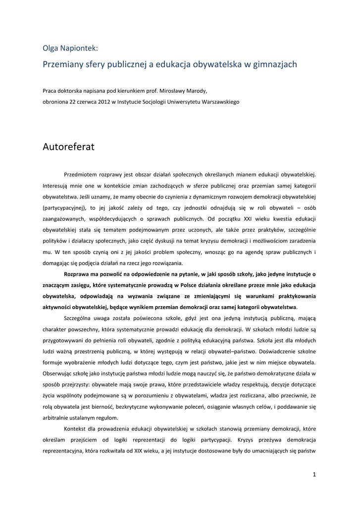 Olga Napiontek: Przemiany sfery publicznej a edukacja obywatelska w gimnazjach Praca doktorska napisana pod kierunkiem prof. Mirosławy Marody, obroniona 22 czerwca 2012 w Instytucie Socjologii Uniwersytetu Warszawskiego Autoreferat Przedmiotem rozprawy jest obszar działań społecznych określanych mianem edukacji obywatelskiej. Interesują mnie one w kontekście zmian zachodzących w sferze publicznej oraz przemian samej kategorii obywatelstwa. Jeśli uznamy, że mamy obecnie do czynienia z dynamicznym rozwojem demokracji obywatelskiej (partycypacyjnej), to jej jakość zależy od tego, czy jednostki odnajdują się w roli obywateli – osób zaangażowanych, współdecydujących o sprawach publicznych. Od początku XXI wieku kwestia edukacji obywatelskiej stała się tematem podejmowanym przez uczonych, ale także przez praktyków, szczególnie polityków i działaczy społecznych, jako część dyskusji na temat kryzysu demokracji i możliwościom zaradzenia mu. W ten sposób czynią oni z jej jakości problem społeczny, wnosząc go na agendę spraw publicznych i domagając się podjęcia działań na rzecz jego rozwiązania. Rozprawa ma pozwolić na odpowiedzenie na pytanie, w jaki sposób szkoły, jako jedyne instytucje o znaczącym zasięgu, które systematycznie prowadzą w Polsce działania określane przeze mnie jako edukacja obywatelska, odpowiadają na wyzwania związane ze zmieniającymi się warunkami praktykowania aktywności obywatelskiej, będące wynikiem przemian demokracji oraz samej kategorii obywatelstwa. Szczególna uwaga została poświecona szkole, gdyż jest ona jedyną instytucją publiczną, mającą charakter powszechny, która systematycznie prowadzi edukację dla demokracji. W szkołach młodzi ludzie są przygotowywani do pełnienia roli obywateli, zgodnie z polityką edukacyjną państwa. Szkoła jest dla młodych ludzi ważną przestrzenią publiczną, w której występują w relacji obywatel–państwo. Doświadczenie szkolne formuje wyobrażenie młodych ludzi dotyczące tego, czym jest państwo, jakie jest w nim miejsce obywatela. Obserwując szkołę jako instytucję państwa młodzi ludzie mogą nauczyć się, że państwo demokratyczne działa w sposób przejrzysty: obywatele mają swoje prawa, które przedstawiciele władzy respektują, decyzje dotyczące życia wspólnoty podejmowane są w porozumieniu z obywatelami, władza jest rozliczana, albo przeciwnie, że rolą obywatela jest bierność, bezkrytyczne wykonywanie poleceń, osiąganie własnych celów, i poddawanie się arbitralnie ustalanym regułom. Kontekst dla prowadzenia edukacji obywatelskiej w szkołach stanowią przemiany demokracji, które określam przejściem od logiki reprezentacji do logiki partycypacji. Kryzys przeżywa demokracja reprezentacyjna, która rozkwitała od XIX wieku, a jej instytucje dostosowane były do umacniających się państw 1 narodowych oraz zamkniętych w ich granicach społeczeństw, których struktura organizowana była poprzez istnienie klas społecznych. Tymczasem obecnie mamy do czynienia ze zmianą warunków, które pozwoliły rozkwitnąć oraz sprawnie funkcjonować demokracji przedstawicielskiej. Wyłanianie się porządku ponadnarodowego, dowartościowanie wspólnot lokalnych, zanikanie klas społecznych sprawia, że instytucje odwołujące się do logiki reprezentacyjnej zdają się nie przystawać do zachodzących zmian. Zmiany te wymuszają tworzenie nowego porządku, który w sferze publicznej określam jako logika partycypacji. Na poziomie normatywnym charakterystyczne jest dla niej podkreślanie wagi udziału obywateli w podejmowaniu decyzji publicznych, swoiste upodmiotowienie jednostek. Kluczowe znaczenie uczestnictwa obywatelskiego dla jakości demokracji podkreślają m.in. koncepcje demokracji partycypacyjnej (bezpośredniej), demokracji deliberatywnej, kapitału społecznego czy teorie komunitariańskie. Na poziomie procedur demokratycznych ma miejsce wypracowywanie nowych metod rządzenia, określanych jako public governance lub good governance, których częścią jest założenie, że decyzje publiczne mają być wypracowywane z udziałem obywateli. Z kolei na poziomie politycznych zachowań jednostek zmniejsza się gotowość do bycia częścią dużych, sformalizowanych, zhierarchizowanych struktur, wybierane są za to modele zaangażowania oddolnego, tematycznego, wewnętrznie zdemokratyzowanego. Opis zmieniających się warunków dla aktywności obywatelskiej pozwala zrozumieć, w jakiego typu otoczeniu przychodzi działać dzisiejszym obywatelom. Zmianom podlega również kategoria obywatelstwa. Które można obecnie scharakteryzować jako zjawisko różnorodne i wielopoziomowe. Różnorodność dotyczy wielości sfer, w jakich obywatelstwo się realizuje. Polityczny wymiar obywatelstwa jest uzupełniany poprzez gospodarczy, społeczny i kulturowy. Obywatelstwo zaczyna się również odnosić do wielu poziomów integracji społecznej – lokalnych, globalnych, regionalnych, chociaż wciąż najbardziej powiązane jest z poziomem narodowym. Opisane wyżej zmieniające się warunki dla praktykowania obywatelstwa stają się wyzwaniem dla polityki edukacyjnej, szczególnie tej związanej z edukacją obywatelską. Skoro zmienia sie demokracja, to jaki kształt ma mieć edukacja dla demokracji? Jakich zachowania obywatelskie są ważne i jakie z nimi wiążą się kompetencje? Instytucjami, które czują się wywołane i uprawnione do interwencji w tym obszarze, są ciała ponadnarodowe, takie jak Rada Europy czy Unia Europejska, których zadaniem jest definiowanie pewnych celów strategicznych, standardów, czy ogólnych polityk edukacyjnych na poziomie europejskim. W toku ich prac dokonana została operacjonalizacja samej kategorii obywatelstwa. W wyniku tego działania przyjmowana jest kategoria „aktywnego obywatelstwa”. W jaki sposób na te wyzwania odpowiadają polskie gimnazja? Szukając odpowiedzi na pytanie o rolę szk
