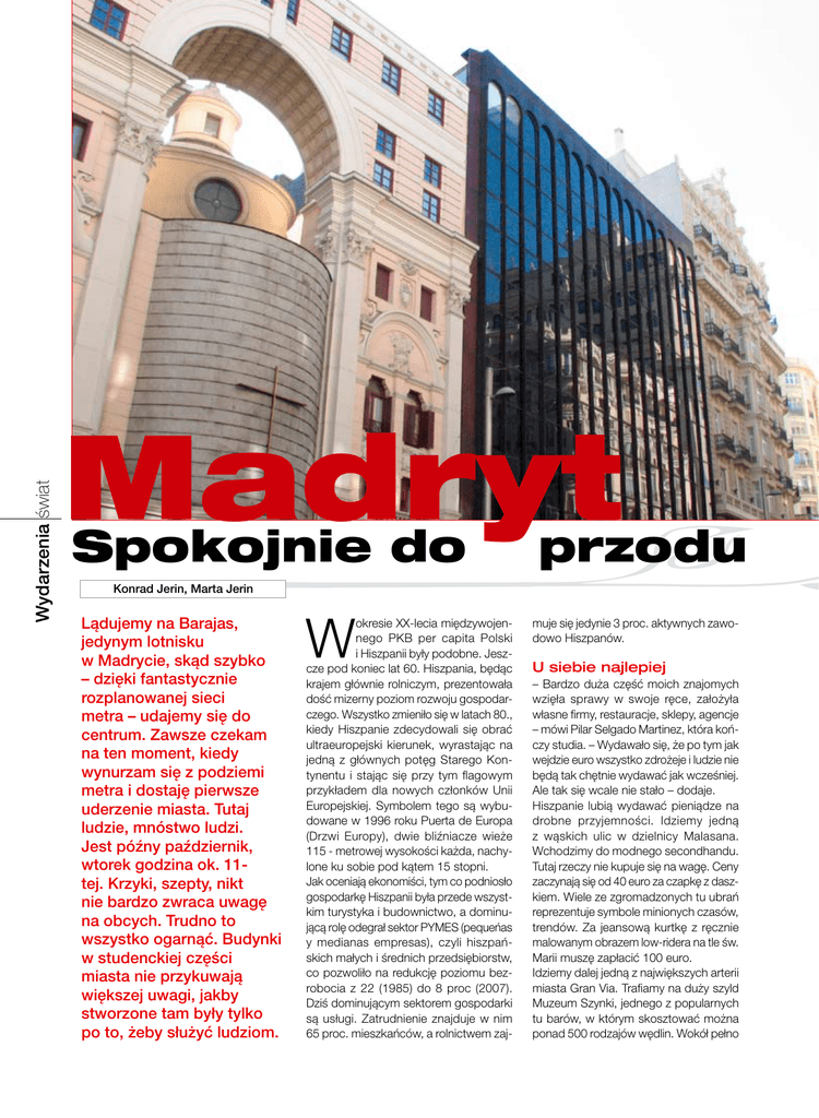 Wydarzenia świat Madryt Spokojnie do przodu Konrad Jerin, Marta Jerin Lądujemy na Barajas, jedynym lotnisku w Madrycie, skąd szybko – dzięki fantastycznie rozplanowanej sieci metra – udajemy się do centrum. Zawsze czekam na ten moment, kiedy wynurzam się z podziemi metra i dostaję pierwsze uderzenie miasta. Tutaj ludzie, mnóstwo ludzi. Jest późny październik, wtorek godzina ok. 11tej. Krzyki, szepty, nikt nie bardzo zwraca uwagę na obcych. Trudno to wszystko ogarnąć. Budynki w studenckiej części miasta nie przykuwają większej uwagi, jakby stworzone tam były tylko po to, żeby służyć ludziom. W okresie XX-lecia międzywojennego PKB per capita Polski i Hiszpanii były podobne. Jeszcze pod koniec lat 60. Hiszpania, będąc krajem głównie rolniczym, prezentowała dość mizerny poziom rozwoju gospodarczego. Wszystko zmieniło się w latach 80., kiedy Hiszpanie zdecydowali się obrać ultraeuropejski kierunek, wyrastając na jedną z głównych potęg Starego Kontynentu i stając się przy tym flagowym przykładem dla nowych członków Unii Europejskiej. Symbolem tego są wybudowane w 1996 roku Puerta de Europa (Drzwi Europy), dwie bliźniacze wieże 115 - metrowej wysokości każda, nachylone ku sobie pod kątem 15 stopni. Jak oceniają ekonomiści, tym co podniosło gospodarkę Hiszpanii była przede wszystkim turystyka i budownictwo, a dominującą rolę odegrał sektor PYMES (pequeńas y medianas empresas), czyli hiszpańskich małych i średnich przedsiębiorstw, co pozwoliło na redukcję poziomu bezrobocia z 22 (1985) do 8 proc (2007). Dziś dominującym sektorem gospodarki są usługi. Zatrudnienie znajduje w nim 65 proc. mieszkańców, a rolnictwem zaj- muje się jedynie 3 proc. aktywnych zawodowo Hiszpanów. U siebie najlepiej – Bardzo duża część moich znajomych wzięła sprawy w swoje ręce, założyła własne firmy, restauracje, sklepy, agencje – mówi Pilar Selgado Martinez, która kończy studia. – Wydawało się, że po tym jak wejdzie euro wszystko zdrożeje i ludzie nie będą tak chętnie wydawać jak wcześniej. Ale tak się wcale nie stało – dodaje. Hiszpanie lubią wydawać pieniądze na drobne przyjemności. Idziemy jedną z wąskich ulic w dzielnicy Malasana. Wchodzimy do modnego secondhandu. Tutaj rzeczy nie kupuje się na wagę. Ceny zaczynają się od 40 euro za czapkę z daszkiem. Wiele ze zgromadzonych tu ubrań reprezentuje symbole minionych czasów, trendów. Za jeansową kurtkę z ręcznie malowanym obrazem low-ridera na tle św. Marii muszę zapłacić 100 euro. Idziemy dalej jedną z największych arterii miasta Gran Via. Trafiamy na duży szyld Muzeum Szynki, jednego z popularnych tu barów, w którym skosztować można ponad 500 rodzajów wędlin. Wokół pełno ludzi, którzy do kieliszka wina zagryzają płaty suszonego mięsa. Przypomina to bardziej winnice i degustowanie win niż znany nam sklep mięsny. W restauracjach obsługiwani jesteśmy przyzwoicie, ale nie z taką atencją i profesjonalizmem jak choćby w Polsce. Tutaj nikt się za bardzo tobą nie przejmuje. Komunikacja utrudniona jest dodatkowo przez barierę językową. W Madrycie niewiele osób mówi w innym języku niż ojczysty. – Rzadko gdzieś wyjeżdżamy, bo nam jest dobrze tu u siebie. Przez to możemy wydawać się nieco zamknięci, wycofani – wyjaśnia Soledad. Kreowanie nowych potrzeb W rankingu najdroższych hiszpańskich marek Interbrands znajdziemy m.in. takie nazwy jak: Zara, Mango, bank La Caixa, rafineria Repsol, Telefonica (ma kupić brytyjską sieć O2), Seat czy klub piłkarski Real Madryt. Jak mówi dla „New York Times” Ana Palacio, minister spraw zagranicznych Hiszpanii, dzięki sukcesom marek hiszpańskich na arenach międzynarodowych zyskuje też marka „Hiszpanii”. Wyróżnienia dla produktów spod znaku byka szuka w takich przestrzeniach, jak: design i jakość, technologia, innowacja. Jedną z marek, która postawiła na te trzy elementy w swojej strategii jest Roca, producent wyposażenia łazienek, obecny na ponad pięćdziesięciu rynkach świata. Jak twierdzi jeden z twórców sukcesu tej marki, Salvador GabarrŰ Serra, firma minimum 5 proc. zysków inwestuje w dział badań i rozwoju oraz w design, bo rozumie, że są to kluczowe dla niej rejony. Podobną filozofię w swoim biznesie stosuje Zara, której pomysł opiera się na dwóch filarach. Pierwszym jest value for money, czyli oferowanie dobrych jakościowo i wzorniczo produktów za przystępną cenę. Drugim jest częste wprowadzanie nowych kolekcji. Firma potrzebuje jedynie dwóch tygodni, aby swój nowo zaprojektowany produkt wprowadzić do sklepów na całym świecie. To, co zaoferowała Zara, a także szwedzki H&M, było odpowiedzią na rodzący się trend „fast fashion”, czyli dostępnych na każdą kieszeń, szybko zmieniających się kolekcji, projektowanych przez znanych kreatorów mody. Kolejnym trendem, który hiszpańska przedsiębiorczość przebiła na sukces biznesowy jest Floridasation, czyli migracje pokolenia baby-boomu do ciepłych zakątków Europy. Pięćdziesięciolatkowie ze Szwecji, Niemiec czy Wielkiej Brytanii upodobali sobie południowe rejony Hiszpanii jako miejsca spokojnej starości. Wykupują tam działki domy, apartamenty, i to właśnie dla nich linie lotnicze EasyJet i Ryanair uruchomiły ogromną liczbę połączeń do takich miast, jak Valencia, Alicante czy Malaga. Wprowadzone w 2005 roku przez parlament prawo zezwalające na śluby gejów i lesbijek niemal od razu doczekało się nowych tworów biznesowych, odpowiadających na nowe potrzeby rynku. BY jest pierwszym w Hiszpanii sklepem, który oferuje kreacje ślubne dla związków gejowskich. Projekty można wybierać z palet takich rodzimych kreatorów, jak: Delgado Buil, Ion Fix, Juanjo Oliva, Locking Shocking and Helena Rohner. Mañana i marketingowa ściema Wszystko to każe sądzić, że Hiszpania, mimo swojej „maňany”, jest czujna, na Wydarzenia świat to