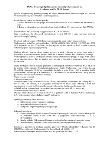 PGNiG Technologie Spółka Akcyjna z siedzibą w Krośnie przy ul. I. Łukasiewicza 89, 38-400 Krosno ogłasza nieograniczony przetarg pisemny na zbycie nieruchomości zlokalizowanych w Ostrowie Wielkopolskim przy ulicy Przeskok i Staroprzygodzkiej. Przedmiotem przetargu jest łączna sprzedaŜ: 1. Prawa uŜytkowania wieczystego niezabudowanej działki nr 6/20 o powierzchni ha 0,8654 ha, oraz 2. Prawa uŜytkowania wieczystego niezabudowanej działki nr 6/21 o powierzchni ha 0,7766 ha. Nieruchomości mają urządzoną księgę wieczystą KZ1W/00059761/8. Cena wywoławcza dla zbywanych nieruchomości wynosi 685 000 zł netto (słownie: sześćset osiemdziesiąt pięć tysięcy). Wysokość wadium wynosi 68 500 zł (słownie: sześćdziesiąt osiem tysięcy pięćset złotych). Wadium naleŜy wpłacić na rachunek bankowy: BANK MILLENNIUM 35 1160 2202 0000 0002 2059 1851, najpóźniej do dnia 22.04.2014r. Za datę wpływu wadium uwaŜa się dzień uznania rachunku wskazanego przez ogłaszającego przetarg. Wadium oferenta, którego oferta zostanie przyjęta, zostanie zaliczone na poczet ceny nabycia. Pozostałym uczestnikom wadium zostanie zwrócone w terminie 7 dni od dnia zakończenia przetargu. Wadium przepada na rzecz Spółki jeŜeli oferent, którego oferta zostanie przyjęta w ciągu 30 dni uchyli się od zawarcia umowy lub nie zapłaci ceny nabycia w terminie wyznaczonym przez komisję przetargową. Oferty przetargowe naleŜy składać (przesyłać) w zamkniętych kopertach w terminie do 25.04.2014r do godziny 12:00 z napisem: "SprzedaŜ nieruchomości - Ostrów Wielkopolski – nie otwierać do dnia 25.04.2014r. do godziny 12:00" od poniedziałku do piątku w godz. 8:00 - 15:00 w siedzibie Spółki (adres) PGNiG Technologie S.A. Sekretariat, ul. I. Łukasiewicza 89, 38-400 Krosno. Oferty złoŜone po terminie nie będą dopuszczone do przetargu. Oferta powinna zawierać: - oferowaną cenę netto, - dane oferenta tj. imię i nazwisko lub nazwę (firmę), adres miejsca zamieszkania lub siedziby, PESEL lub nr KRS, nr telefonu, a w przypadku przedsiębiorców takŜe: odpis aktualny z KRS lub zaświadczenie o wpisie do Centralnej Ewidencji i Informacji o Działalności Gospodarczej, - oświadczenie o zapoznaniu się z warunkami przetargu oraz przyjęciu ich bez zastrzeŜeń, Termin związania ofertą wynosi 90 dni. Otwarcie ofert odbędzie się w dniu 25.04.2014r. o godzinie 12:15 w budynku PGNiG Technologie S.A. w Krośnie przy ulicy I. Łukasiewicza 89 pok. nr 13. Sprzedający zastrzega sobie prawo do: • jednostronnej zmiany warunków przetargu, • odwołania niniejszego ogłoszenia, • odstąpienia od przetargu bez podania przyczyn. Informacje dodatkowe: a. Prawo pierwokupu działek numer 6/20 oraz 6/21 przysługuje Gminie M. Ostrów Wielkopolski na podstawie ustawy z dnia 21.08.1997r. o gospodarce nieruchomościami – Dz. U. 2010.102.651) b. Stawka podatku VAT zostanie obliczona na podstawie obowiązujących przepisów prawa. c. Wszelkie koszty związane z nabyciem przedmiotu przetargu ponosi kupujący. Informacji o przedmiocie przetargu udzielają pracownicy Działu Infrastruktury w Krośnie tel: 13 4374550 lub w Ostrowie Wielkopolskim Pan Zenon Kurek tel: 663 224 127. Informacje udzielane są od poniedziałku do piątku w godzinach od 7:00 do 15:00.