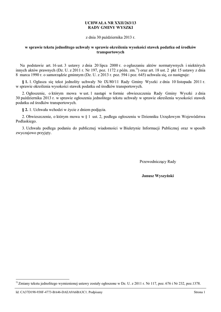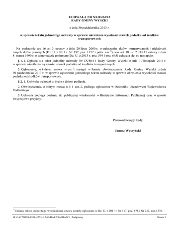 UCHWAŁA NR XXII/263/13 RADY GMINY WYSZKI z dnia 30 października 2013 r. w sprawie tekstu jednolitego uchwały w sprawie określenia wysokości stawek podatku od środków transportowych Na podstawie art. 16 ust. 3 ustawy z dnia 20 lipca 2000 r. o ogłaszaniu aktów normatywnych i niektórych innych aktów prawnych (Dz. U. z 2011 r. Nr 197, poz. 1172 z późn. zm.1)) oraz art. 18 ust. 2 pkt 15 ustawy z dnia 8 marca 1990 r. o samorządzie gminnym (Dz. U. z 2013 r. poz. 594 i poz. 645) uchwala się, co następuje: § 1. 1. Ogłasza się tekst jednolity uchwały Nr IX/80/11 Rady Gminy Wyszki z dnia 10 listopada 2011 r. w sprawie określenia wysokości stawek podatku od środków transportowych. 2. Ogłoszenie, o którym mowa w ust. 1 nastąpi w formie obwieszczenia Rady Gminy Wyszki z dnia 30 października 2013 r. w sprawie ogłoszenia jednolitego tekstu uchwały w sprawie określenia wysokości stawek podatku od środków transportowych. § 2. 1. Uchwała wchodzi w życie z dniem podjęcia. 2. Obwieszczenie, o którym mowa w § 1 ust. 2, podlega ogłoszeniu w Dzienniku Urzędowym Województwa Podlaskiego. 3. Uchwała podlega podaniu do publicznej wiadomości w Biuletynie Informacji Publicznej oraz w sposób zwyczajowo przyjęty. Przewodniczący Rady Janusz Wyszyński 1) Zmiany tekstu jednolitego wymienionej ustawy zostały ogłoszone w Dz. U. z 2011 r. Nr 117, poz. 676 i Nr 232, poz.1378. Id: CA37D198-938F-4773-BA46-DAEA9A6BA3C1. Podpisany Strona 1 Załącznik do uchwały Nr XXII/263/13 Rady Gminy Wyszki z dnia 30 października 2013 r. OBWIESZCZENIE RADY GMINY WYSZKI z dnia 30 października 2013 r. w sprawie tekstu jednolitego uchwały w sprawie określenia wysokości stawek podatku od środków transportowych 1. Na podstawie art. 16 ust. 3 ustawy z dnia 20 lipca 2000 r. o ogłaszaniu aktów normatywnych i niektórych innych aktów prawnych (Dz. U. z 2011 r. Nr 197, poz. 1172 z późn. zm.2)) ogłasza się w załączniku do niniejszego obwieszczenia jednolity tekst uchwały Nr IX/80/11 Rady Gminy Wyszki z dnia 10 listopada 2011 r. w sprawie określenia wysokości stawek podatku od środków transportowych (Dz. Urz. Woj. Podl. z 2011 r. Nr 282, poz. 3448) z uwzględnieniem zmian wprowadzonych uchwałą Nr X/88/11 Rady Gminy Wyszki z dnia 30 grudnia 2011 r. zmieniającą uchwałę w sprawie określenia wysokości stawek od środków transportowych (Dz. Urz. Woj. Podl. z 2012 r. poz. 838). 2. Podany w załączniku do niniejszego obwieszczenia tekst jednolity nie obejmuje § 2 i § 3 uchwały Nr X/88/11 Rady Gminy Wyszki z dnia 30 grudnia 2011 r. zmieniającą uchwałę w sprawie określenia wysokości stawek od środków transportowych, które stanowią: „§ 2. Wykonanie uchwały powierza się Wójtowi Gminy Wyszki.; § 3. Uchwała wchodzi w życie po upływie 14 dni od ogłoszenia w Dzienniku Urzędowym Województwa Podlaskiego.”. 3. Obwieszczenie podlega ogłoszeniu w Dzienniku Urzędowym Województwa Podlaskiego. Przewodniczący Rady Janusz Wyszyński 2) Zmiany tekstu jednolitego wymienionej ustawy zostały ogłoszone w Dz. U. z 2011 r. Nr 117, poz. 676 i Nr 232, poz.1378. Id: CA37D198-938F-4773-BA46-DAEA9A6BA3C1. Podpisany Strona 2 Załącznik do Obwieszczenia Rady Gminy Wyszki z dnia 30 października 2013 r. Uchwała Nr IX/80/11 Rady Gminy Wyszki z dnia 10 listopada 2011 r. w sprawie określenia wysokości stawek podatku od środków transportowych Na podstawie art. 18 ust. 2 pkt 8 ustawy z dnia 8 marca 1990 r. o samorządzie gminnym (Dz. U. z 2013 r. poz. 594 i poz. 645) i art. 10 ust. 1 i 2 ustawy z dnia 12 stycznia 1991 r. o podatkach i opłatach lokalnych (Dz. U. z 2010 r. Nr 95, poz. 613 z późn. zm.1)) uchwala się co następuje: § 1. 1. Określa się następujące stawki podatku od środków transportowych obowiązujące na terenie Gminy Wyszki: 1) od samochodów ciężarowych, o których mowa w art. 8 pkt 1 ustawy o podatkach i opłatach lokalnych, o dopuszczalnej masie całkowitej: a) powyżej 3,5 tony do 5,5 tony włącznie – 564,00 zł.; b) powyżej 5,5 ton do 9 ton włącznie – 940,00 zł.; c) powyżej 9 ton do poniżej 12 ton – 1130,00 zł.; 2) od samochodów ciężarowych, o których mowa w art. 8 pkt 2 ustawy o podatkach i opłatach lokalnych, o dopuszczalnej masie całkowitej równej i wyższej niż 12 ton w zależności od liczby osi, dopuszczalnej masy całkowitej pojazdu i rodzaju zawieszenia według stawek określonych w załączniku Nr 1 do niniejszej uchwały; 3) od ciągników siodłowych i balastowych, o których mowa w art. 8 pkt 3 ustawy o podatkach i opłatach lokalnych, o dopuszczalnej masie całkowitej zespołu pojazdów: a) 3,5 ton do 5,5 ton włącznie – 1236,00 zł.; b) powyżej 5,5 ton do 9 ton włącznie – 1276,00 zł.; c) powyżej 9 ton do poniżej 12 ton – 1316,00 zł.; 4) od ciągników siodłowych i balastowych, o których mowa w art. 8 pkt 4 ustawy o podatkach i opłatach lokalnych, o dopuszczalnej masie całkowitej zespołu pojazdów równej lub wyższej niż 12 ton w zależności od liczby osi, dopuszczalnej masy całkowitej pojazdu zawieszenia według stawek określonych w załączniku Nr 2 do niniejszej uchwały; 5) od przyczep i naczep, o których mowa w art. 8 pkt 5 ustawy o podatkach i opłatach lokalnych, które łącznie z pojazdem silnikowym posiadają dopuszczalną masę całkowitą od 7 ton i poniżej 12 ton (z wyjątkiem związanych wyłącznie z działalnością rolniczą prowadzoną przez podatnika podatku rolnego) – 1128,00 zł.; 6) od przyczep i naczep, o których mowa w art. 8 pkt 6 ustawy o podatkach i opłatach lokalnych (z wyjątkiem związanych wyłącznie z działalnością rolniczą prowadzoną przez podatnika podatku rolnego), które łącznie z pojazdem silnikowym posiadają dopuszczalną masę całkowitą równą lub wyższą niż 12 ton według stawek określonych w załączniku Nr 3 do niniejszej uchwały; 7) autobusów, o których mowa w art. 8 pkt 7 ustawy o podatkach i opłatach lokalnych, o iloś