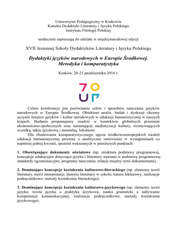 Uniwersytet Pedagogiczny w Krakowie Katedra Dydaktyki Literatury i Języka Polskiego Instytutu Filologii Polskiej serdecznie zapraszają do udziału w międzynarodowej edycji XVII Jesiennej Szkoły Dydaktyków Literatury i Języka Polskiego Dydaktyki języków narodowych w Europie Środkowej. Metodyka i komparatystyka Kraków, 20-21 października 2016 r. Celem konferencji jest porównanie celów i sposobów nauczania języków narodowych w Europie Środkowej. Obiektem analiz, badań i dyskusji chcemy uczynić miejsce języków i kultur narodowych w edukacji humanistycznej w naszych krajach. Badania proponujemy osadzić w kontekście globalnych przemian ekonomiczno-społecznych oraz narastającej mediatyzacji kultury, rozmywających wszelką, także językową i mentalną, lokalność. Dla zbudowania komparatystycznego ujęcia środkowoeuropejskich modeli edukacji humanistycznej prosimy o analityczne omówienie w wystąpieniach co najmniej jednej kwestii, spośród wskazanych w poniższych punktach: 1. Obowiązujące dokumenty oświatowe (np. struktura podstawy programowej, koncepcje edukacyjne dotyczące języka i literatury wpisane w podstawę programową; standardy egzaminacyjne; programy nauczania; relacje między tymi dokumentami). 2. Dominujące koncepcje kształcenia kulturowo-literackiego (np. elementy teorii literatury, teorii interpretacji; historia literatury w szkole; kanon lekturowy; realizacje podręcznikowe; metody kształcenia literackiego). 3. Dominujące koncepcje kształcenia kulturowo-językowego (np. elementy teorii języka; teoria języka a praktyka językowa; nauka gramatyki a nabywanie kompetencji komunikacyjnej; realizacje podręcznikowe; metody kształcenia językowego). 4. Tożsamość narodowa i „małe ojczyzny” w kształceniu humanistycznym (np. obecność kultury i języka regionu w curriculum; literackie mapowanie obszarów małych ojczyzn; mniejszości językowe i kulturowe). 5. Ranga języka narodowego wobec narastającej dominacji angielszczyzny (np. pozycja języków narodowych w testach kompetencyjnych i egzaminach maturalnych; wymagania rekrutacyjne uczelni wyższych w zakresie języka narodowego; polityka edukacyjna państwa wobec języka narodowego). 6. Struktura egzaminów końcowych (np. założenia, cele, typy egzaminów z języka państwowego/narodowego; polityczne lub kulturowo-społeczne konteksty zmian egzaminów; egzaminy zewnętrzne jako element systemu edukacji; rodzaj i skala zjawiska „uczenia pod egzamin”). 7. Współczesne problemy i dyskusje nad kształtem edukacji w języku narodowym (np. kwestia listy lektur; urynkowienie wiedzy humanistycznej; odpodmiotowienie kontaktu z literaturą i sztuką; zmiany w systemie edukacji po wejściu do EU; krytyka lub akceptacja wdrażanych modeli). Języki konferencji: polski, angielski. Harmonogram konferencji i podziały sekcji będą odpowiednio grupować tematykę wystąpień, umożliwiając uczestnikom porównanie ujęć wybranych problemów analizowanych w kontekście dydaktyk poszczególnych krajów. Na czas konferencji w październiku 2016 roku zostanie wydany zestaw streszczeń wystąpień, a pełne teksty konferencyjne ukażą się w czasopiśmie „Annales Universitatis Paedagogicae Cracoviensis. Studia ad Didacticam Litterarum Polonarum et Linguae Polonae” w wersji polskiej oraz angielskiej. Kolegium Organizacyjne: dr hab. prof. UP Marek Pieniążek dr hab. prof. UP Zofia Budrewicz dr Marta Szymańska