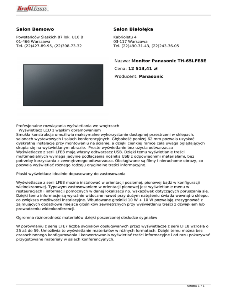 Salon Bemowo Salon Białołęka Powstańców Śląskich 87 lok. U10 B 01-466 Warszawa Tel. (22)427-89-95, (22)398-73-32 Kabrioletu 4 03-117 Warszawa Tel. (22)490-31-43, (22)243-36-05 Nazwa: Monitor Panasonic TH-65LFE8E Cena: 12 513,41 zł Producent: Panasonic Profesjonalne rozwiązania wyświetlania we wnętrzach Wyświetlacz LCD z wąskim obramowaniem Smukła konstrukcja umożliwia maksymalne wykorzystanie dostępnej przestrzeni w sklepach, salonach wystawowych i salach konferencyjnych. Głębokość poniżej 62 mm pozwala uzyskać dyskretną instalację przy montowaniu na ścianie, a dzięki cienkiej ramce cała uwaga oglądających skupia się na wyświetlanym obrazie. Proste wyświetlanie bez użycia odtwarzacza Wyświetlacze z serii LFE8 mają własny odtwarzacz USB. Dzięki temu wyświetlanie treści multimedialnych wymaga jedynie podłączenia nośnika USB z odpowiednimi materiałami, bez potrzeby korzystania z zewnętrznego odtwarzacza. Obsługiwane są filmy i nieruchome obrazy, co pozwala wyświetlać różnego rodzaju oryginalne treści informacyjne. Płaski wyświetlacz idealnie dopasowany do zastosowania Wyświetlacze z serii LFE8 można instalować w orientacji poziomej, pionowej bądź w konfiguracji wieloekranowej. Typowym zastosowaniem w orientacji pionowej jest wyświetlanie menu w restauracjach i informacji pomocnych w danej lokalizacji np. wskazówek dotyczących poruszania się. Dzięki temu informacje są wyraźnie widoczne nawet przy dużym natężeniu światła wewnątrz sklepu, co zwiększa możliwości instalacyjne. Wbudowane głośniki 10 W + 10 W pozwalają zrezygnować z zajmujących dodatkowe miejsce głośników zewnętrznych przy wyświetlaniu treści z dźwiękiem lub prowadzeniu wideokonferencji. Ogromna różnorodność materiałów dzięki poszerzonej obsłudze sygnałów W porównaniu z serią LFE7 liczba sygnałów obsługiwanych przez wyświetlacze z serii LFE8 wzrosła o 25 aż do 59. Umożliwia to wyświetlanie materiałów w różnych formatach. Dzięki temu można bez czasochłonnego konfigurowania i konwertowania wyświetlać treści informacyjne i od razu pokazywać przygotowane materiały w salach konferencyjnych. strona 1 / 1 Powered by TCPDF (www.tcpdf.org)
