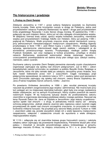 Polska Warmia Polnisches Ermland Tło historyczne i pradzieje 1. Prolog na Ziemi Świętej Zdobycie Jerozolimy w 1187 r. przez sułtana Saladyna wywołało na Zachodzie trzecią krucjatę. Dwie armie krzyŜackie ruszyły w drogę do Palestyny, jedna pod przywództwem cesarza Fryderyka Barbarossa na lądzie i druga pod przywództwem króla angielskiego Ryszarda I (Lwie Serce) drogą morską. W październiku 1190 r. połączyły się pod miastem Akkon, które juŜ od roku oblegały chrześcijańskie wojska. W oblęŜeniu równieŜ brały udział, oprócz wojska królestwa Jerozolimy, niemieckie wojska pod przywództwem hrabiego Adolfa von Holstein, który juŜ jesienią 1189 r. popłynął do Palestyny. Walki przyniosły znaczne straty wśród niemieckich rycerzy, przy jednoczesnym niewystarczającym medycznym zaopatrzeniu. Według legendy przybywający w lecie 1190 r. pod Akkon kupcy z Lubeki i Bremy, przejęci cięŜką sytuacją, spontanicznie zdemontowali Ŝagle swoich statków i udostępnili je do wzniesienia prowizorycznego lazaretu. Przybywający niedługo potem ksiąŜę Fryderyk Szwabski, syn oraz następca w funkcji przywódcy, umarłego w drodze cesarza Barbarossa, postanowił wykorzystać okazję zastanego lazaretu i urzeczywistnić prawdopodobnie od dawna snuty plan swego ojca: załoŜyć osobny, niemiecki, zakon rycerski. Duchowne zakony rycerskie Ziemi Świętej pierwotnie stanowiły czysto charytatywne organizacje zajmujące się opieką nad chorymi pielgrzymami. JuŜ w 603 r. zakon benedyktyński załoŜył schronisko ze szpitalem w pobliŜu Bazyliki Grobu Świętego w Jerozolimie, które nie tylko istniało dalej po zdobyciu Jerozolimy przez Arabów, lecz było nawet traktowane przez nich z szacunkiem. Ciągle narastający prąd pielgrzymów spowodował, Ŝe załoŜono tutaj w 1071 r. osobny zakon pod wezwaniem Jana Chrzciciela zajmujący się opieką nad chorymi, zwany Bracia Szpitalnicy św. Jana (Fratres hospitales Sancti Johanni), krótko - Joannici. Po powstaniu Królestwa Jerozolimy w 1099 r. jako rezultat pierwszej krucjaty nasuwał się problem zorganizowania jego wojska i administracji. Nie moŜna było przy tym polegać ani na miejscowej islamskiej ludności, gdyŜ była ona wrogo nastawiona wobec zdobywców, ani na samych KrzyŜowcach, którzy szybko powrócili do swoich rodzinnych krajów. W tej krytycznej sytuacji doszło do przekształcenia zakonu Joannitów w organizację stanowiącą podstawę władzy nowego państwa. Nazywał się teraz Rycerski Zakon św. Jana ze Szpitala w Jerozolimie i jego statuty uzupełniono oprócz opieki nad chorymi – o drugi, w jednakowej mierze waŜny cel - zbrojną ochronę pielgrzymów. Jednak właśnie Joannici jako najstarszy zakon rycerski ciągle przywiązywali do opieki nad chorymi szczególne znaczenie, co przynosiło im nawet konkretne militarne korzyści. Na przykład przy obronie Malty przeciw Turkom w 1595 r. Joannitom udało się, przede wszystkim dzięki ich o wiele lepszemu medycznemu zaopatrzeniu, odeprzeć i ostatecznie zmusić do wycofania o wiele silniejsze, nieprzyjacielskie wojsko. W 1119 r. odłączyła się od Joannitów bojowa grupa francuskich rycerzy i załoŜyła odrębny zakon zajmujący się przewaŜnie wojskowością. Pierwotnie słuŜyli jako straŜ pałacu i mieszkali w skrzydle jerozolimskiego pałacu królewskiego w gmachu dawnego meczetu El-Aksa, na miejscu zniszczonej w 70 r. n. e. przez Rzymian 1. Prolog na Ziemi Świętej / strona 1 z 3 Polska Warmia Polnisches Ermland świątyni (łac. templum) króla Salomona. Od miejsca zamieszkania wywodziła się ich nazwa: Zakon Rycerzy Chrystusa i Świątyni Salomona czyli Templariusze. Dwa zakony zostały uzupełnione o trzeci zakon rycerski, kiedy w październiku 1190 r. Fryderyk Szwabski przyjął szpital polowy pod Akkonem, jednocześnie wypraszając od króla Jerozolimy Guido w zdobywanym mieście działkę pod budowę stałego szpitala. Kiedy Akkon w następnym roku nareszcie upadł, nowy zakon został zaraz za pośrednictwem cesarza Henryka VI (brata Fryderyka) wstępnie uznany przez papieŜa. Otrzymał nazwę „Zakon Braci Domu Niemieckiego św. Maryi w Jerozolimie”. Odniesienie do Jerozolimy było przy tym głównie zabiegiem propagandowym - nazwa świętego miasta miała nadać prestiŜ i zwiększyć powaŜanie zakonu. Uzasadniono ją niemieckim szpitalem, który istniał w XII wieku w Jerozolimie, którego powstanie w przeciwieństwie do początków szpitala Joannitów nie jest jednak udokumentowane. Według legendy mieszkające w czasach pierwszej krucjaty w Jerozolimie bogate, bezdzietne, niemieckie starsze małŜeństwo przyjęło i pielęgnowało spotkanego na ulicy rannego rycerza. Opieka ta, tak spodobała się staruszkom, Ŝe postanowili sfinansować załoŜenie formalnie podlegającego Joannitom szpitala z poświęconą Maryi Pannie kaplicą. Szpital upadł juŜ w 1187 r. wskutek zdobycia Jerozolimy przez Saladina i nie miał Ŝadnego czasowego ani organizacyjnego związku z załoŜonym 4 lata później szpitalem w Akkonie. Pozostało tylko odniesienie do Matki Boskiej, którą jako uzasadnienie nazwy wybrano za patronkę nowego zakonu. Jego dość długą nazwą skrócono później do „Zakon Niemiecki”, w polskim piśmiennictwie zaś do „Zakon KrzyŜacki” albo po prostu „KrzyŜacy”. Pierwotny byt jako czysto charytatywna organizacja na wzór Joannitów nie trwał za długo. JuŜ w 1198 r. nastąpiło przekształcenie w zakon rycerski, który w ten sam sposób jak Joannici i Templariusze pod ideologicznym pretekstem krucjaty przeciw poganom, prowadził wojenną politykę skierowaną na rozszerzanie wpływów. Materialne zasoby zapewniały mu liczne darowizny pienięŜne i w postaci nieruchomości, co wynikało z faktu, Ŝe idea krucjaty odpowiadała duchowi czasu średniowiecza. Poza tym wstępujący do zakonu rycerze i zwykli bracia wnosili z reguły znaczną część swojego majątku do organizacji. Na jej czele s