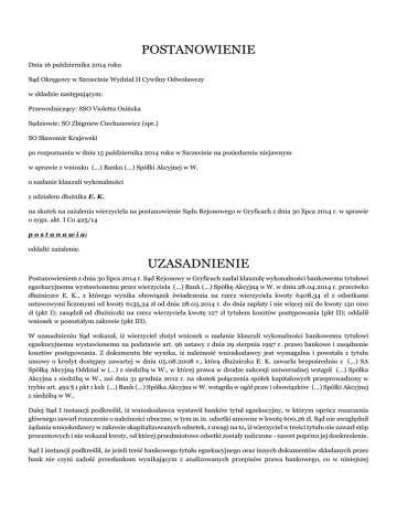 POSTANOWIENIE Dnia 16 października 2014 roku Sąd Okręgowy w Szczecinie Wydział II Cywilny Odwoławczy w składzie następującym: Przewodniczący: SSO Violetta Osińska Sędziowie: SO Zbigniew Ciechanowicz (spr.) SO Sławomir Krajewski po rozpoznaniu w dniu 15 października 2014 roku w Szczecinie na posiedzeniu niejawnym w sprawie z wniosku (...) Banku (...) Spółki Akcyjnej w W. o nadanie klauzuli wykonalności z udziałem dłużnika E. K. na skutek na zażalenia wierzyciela na postanowienie Sądu Rejonowego w Gryficach z dnia 30 lipca 2014 r. w sprawie o sygn. akt. I Co 425/14 p o s t a n a w i a: oddalić zażalenie. UZASADNIENIE Postanowieniem z dnia 30 lipca 2014 r. Sąd Rejonowy w Gryficach nadał klauzulę wykonalności bankowemu tytułowi egzekucyjnemu wystawionemu przez wierzyciela (...) Bank (...) Spółkę Akcyjną w W. w dniu 28.04.2014 r. przeciwko dłużniczce E. K., z którego wynika obowiązek świadczenia na rzecz wierzyciela kwoty 6408,34 zł z odsetkami ustawowymi liczonymi od kwoty 6135,34 zł od dnia 28.03.2014 r. do dnia zapłaty i nie więcej niż do kwoty 150 000 zł (pkt I); zasądził od dłużniczki na rzecz wierzyciela kwotę 127 zł tytułem kosztów postępowania (pkt II); oddalił wniosek w pozostałym zakresie (pkt III). W uzasadnieniu Sąd wskazał, iż wierzyciel złożył wniosek o nadanie klauzuli wykonalności bankowemu tytułowi egzekucyjnemu wystawionemu na podstawie art. 96 ustawy z dnia 29 sierpnia 1997 r. prawo bankowe i zasądzenie kosztów postępowania. Z dokumentu bte wynika, iż należność wnioskodawcy jest wymagalna i powstała z tytułu umowy o kredyt dostępny zawartej w dniu 05.08.2008 r., którą dłużniczka E. K. zawarła bezpośrednio z (...) SA Spółką Akcyjną Oddział w (...) z siedzibą w W., w której prawa w drodze sukcesji uniwersalnej wstąpił (...) Spółka Akcyjna z siedzibą w W., zaś dnia 31 grudnia 2012 r. na skutek połączenia spółek kapitałowych przeprowadzony w trybie art. 492 § 1 pkt 1 ksh (...) Bank (...) Spółka Akcyjna w W. wstąpiła w ogół praw i obowiązków (...) Spółki Akcyjnej z siedzibą w W.. Dalej Sąd I instancji podkreślił, iż wnioskodawca wystawił banków tytuł egzekucyjny, w którym oprócz roszczenia głównego zawarł roszczenie o należności uboczne, w tym m.in. odsetki umowne w kwotę 600,26 zł. Sąd nie uwzględnił żądania wnioskodawcy w zakresie skapitalizowanych odsetek, z uwagi na to, iż wierzyciel w treści tytułu nie zawarł stóp procentowych i nie wskazał kwoty, od której przedmiotowe odsetki zostały naliczone - nawet poprzez jej dookreslenie. Sąd I instancji podkreślił, że jeżeli treść bankowego tytułu egzekucyjnego oraz innych dokumentów składanych przez bank nie czyni zadość przesłankom wynikającym z analizowanych przepisów prawa bankowego, co w niniejszej sprawie zostało wykazane, to brak jest podstaw do uwzględnienia wniosku w całości, czemu Sąd dał wyraz w punkcie III postanowienia Zażalenie na powyższe postanowienie wywiódł wierzyciel zaskarżając je w całości i zarzucając: - naruszenie prawa procesowego, a to art. 786 2 k.p.c. poprzez przekroczenie przez Sąd kognicji w postępowaniu klauzulowym wyrażające się w dokonaniu merytorycznej oceny roszczeń poprzez badanie wysokości roszczeń dochodzonych przez Wierzyciela, - naruszenie prawa materialnego, a to art. 96 § 2 ustawy z dnia 29 sierpnia 1997 roku Prawo bankowe poprzez błędną interpretację powyższego przepisu wyrażającą się w uznaniu, że złożony w niniejszej sprawie bankowy tytuł egzekucyjny nie spełnia wszystkich wymogów formalnych przewidzianych przez w/w przepis, - prawa procesowego, a to art. 786 2 § 1 k.p.c. poprzez jego niezastosowanie i oddalenie wniosku o nadanie klauzuli wykonalności bankowemu tytułowi egzekucyjnemu podczas gdy w sprawie zachodziły wszelkie niezbędne przesłanek do jego uwzględnienia wynikające z przepisów Prawa bankowego. Na podstawie art. 39822 § 1 k.p.c., wskazując na powyższe zarzuty wniosła o zmianę zaskarżonego postanowienia i nadanie klauzuli wykonalności bankowemu tytułowi egzekucyjnemu w całości; uwzględnienie kosztów postępowania, w tym zastępstwa procesowego według norm przepisanych jako kosztów procesu. W uzasadnieniu skarżący podkreślił, iż w postępowaniu klauzulowym o nadanie klauzuli wykonalności bankowemu tytułowi egzekucyjnemu sąd nie jest uprawniony do merytorycznego badania treści bankowego tytułu egzekucyjnego, a tym samym do weryfikowania poprawności obliczeń dokonanych przez wierzyciela. Postępowanie to jest postępowaniem formalnym, w którym sąd bada tylko istnienie przesłanek formalnych wskazane w art. 96 prawa bankowego oraz w art. 786 2 § 1 k.p.c. i w tym zakresie orzeka o nadaniu lub odmowie nadania klauzuli wykonalności bankowemu tytułowi egzekucyjnemu. Sąd w postępowaniu klauzulowym nie powinien badać zasadność wymagalność roszczenia objętego bankowym tytułem egzekucyjnym. Sąd w postępowaniu klauzulowym nie jest uprawniony do merytorycznego badania podstaw wystawienia i wysokości roszczeń wskazanych w bankowym tytule egzekucyjnym. Badając czy bankowy tytuł egzekucyjny odpowiada wymaganiom formalnym ustawy Sąd nie dokonuje merytorycznej oceny roszczeń, tymczasem w niniejszej sprawie zdaniem wierzyciela miało to miejsce. Nadto oczywiste jest, że dłużnikowi przysługują środki zaskarżenia wydanego postanowienia przewidziane przez kodeks postępowania cywilnego i dopiero wtedy możliwe jest merytoryczne rozpoznawanie sprawy. Skarżący podkreślił, iż nie ulega wątpliwości że kwota należności głównej wraz z prawidłowo wskazanymi odsetkami określa wysokość zobowiązań dłużnika. W tym zakresie wskazanie wysokości zobowiązania dłużnika w bankowym tytule egzekucyjnym spełnia wymogi art. 96 ust 2 Prawa bankowego. Na kwotę 7 008,60 zł składa się kwota kapitału oraz skapitalizowane odsetki umowne automatyczn