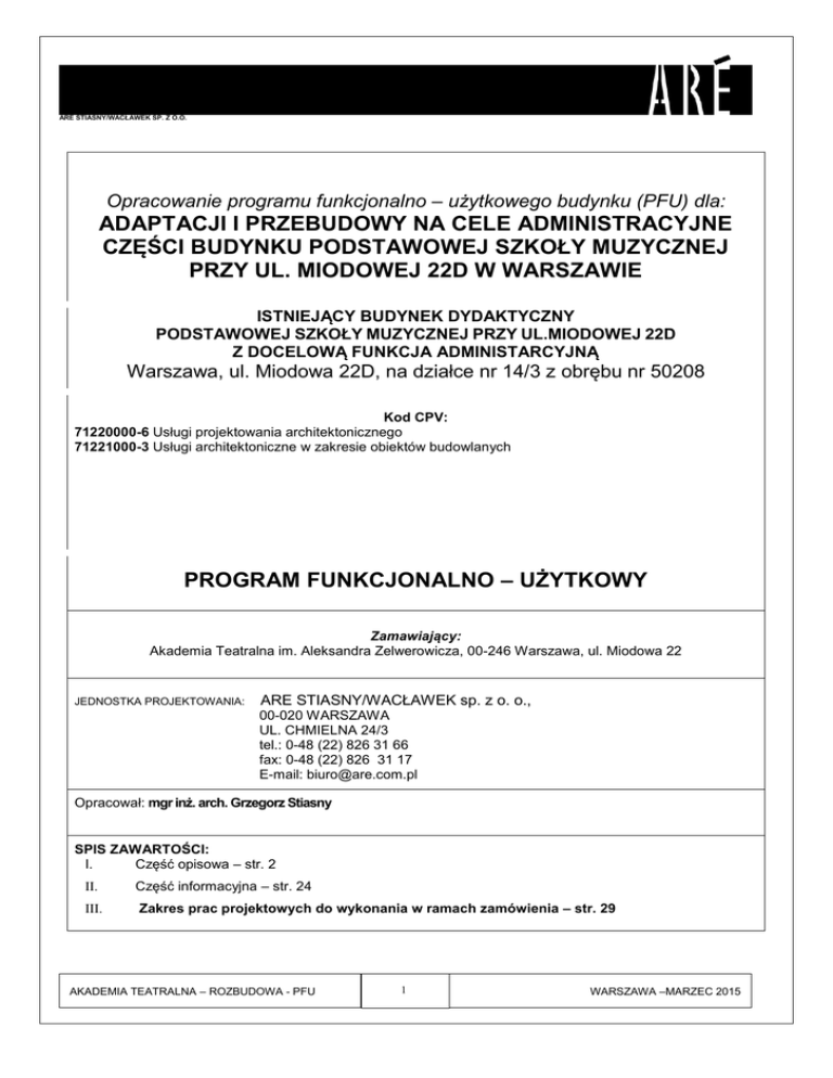 ARE STIASNY/WACŁAWEK SP. Z O.O. Opracowanie programu funkcjonalno – użytkowego budynku (PFU) dla: ADAPTACJI I PRZEBUDOWY NA CELE ADMINISTRACYJNE CZĘŚCI BUDYNKU PODSTAWOWEJ SZKOŁY MUZYCZNEJ PRZY UL. MIODOWEJ 22D W WARSZAWIE ISTNIEJĄCY BUDYNEK DYDAKTYCZNY PODSTAWOWEJ SZKOŁY MUZYCZNEJ PRZY UL.MIODOWEJ 22D Z DOCELOWĄ FUNKCJA ADMINISTARCYJNĄ Warszawa, ul. Miodowa 22D, na działce nr 14/3 z obrębu nr 50208 Kod CPV: 71220000-6 Usługi projektowania architektonicznego 71221000-3 Usługi architektoniczne w zakresie obiektów budowlanych PROGRAM FUNKCJONALNO – UŻYTKOWY Zamawiający: Akademia Teatralna im. Aleksandra Zelwerowicza, 00-246 Warszawa, ul. Miodowa 22 JEDNOSTKA PROJEKTOWANIA: ARE STIASNY/WACŁAWEK sp. z o. o., 00-020 WARSZAWA UL. CHMIELNA 24/3 tel.: 0-48 (22) 826 31 66 fax: 0-48 (22) 826 31 17 E-mail: [email protected] Opracował: mgr inż. arch. Grzegorz Stiasny SPIS ZAWARTOŚCI: I. Część opisowa – str. 2 II. Część informacyjna – str. 24 III. Zakres prac projektowych do wykonania w ramach zamówienia – str. 29 AKADEMIA TEATRALNA – ROZBUDOWA - PFU 1 WARSZAWA –MARZEC 2015 ARE STIASNY/WACŁAWEK SP. Z O.O. CZĘŚĆ OPISOWA: 1. opis ogólny przedmiotu zamówienia 1)charakterystyczne parametry określające wielkość obiektu lub zakres robót budowlanych; 2)aktualne uwarunkowania wykonania przedmiotu zamówienia; 3)szczegółowe właściwości funkcjonalno-użytkowe wyrażone we wskaźnikach powierzchniowo-kubaturowych ustalone zgodnie z Polską Normą PN-ISO 9836:1997 "Właściwości użytkowe w budownictwie”. 2. opis wymagań zamawiającego w stosunku do przedmiotu zamówienia 1)przygotowania terenu budowy; 2)architektury; 3)konstrukcji; 4)instalacji; 5)wykończenia; 6)zagospodarowania terenu. 3. aktualne uwarunkowania wykonania przedmiotu zamówienia 4. szczegółowe właściwości funkcjonalno-użytkowe 1/ opis ogólny Przebudowa i adaptacja budynku Podstawowej Szkoły Muzycznej przy ul. Miodowej 22d w Warszawie na cele administracyjne, jako cześć inwestycji – rozbudowy bazy lokalowej Akademii Teatralnej im. Aleksandra Zelwerowicza w Warszawie. Planowana inwestycja przewiduje przebudowę i adaptację istniejącego budynku dydaktycznego szkoły muzycznej dla celów administracyjnych organu nadrzędnego Akademii Teatralnej im. Aleksandra Zelwerowicza w Warszawie tj. Ministerstwa Kultury i Dziedzictwa Narodowego. Zakłada się ,że w wyniku przebudowy i adaptacji zostanie stworzone efektywne i elastyczne środowisko pracy administracyjnej o wysokim standardzie jakościowym i najwyższych walorach architektonicznych. Budynek będzie przeznaczony zgodnie z zamierzeniem inwestora jako budynek biurowy, w którym główne przestrzenie użytkowe będą zajmowane przez: -pomieszczenia pracy administracyjnej; -zespół sali prób orkiestry; W budynku znajdą się poza tym funkcje uzupełniające takie jak: pomieszczenia zaplecza wspierającego główne przeznaczenie takie jak: pomieszczenia higieniczno - sanitarne oraz przyłącza energetyczne, sanitarne miejskiej sieci cieplnej i inne niezbędne do prawidłowego funkcjonowania instytucji. Adaptowany budynek jest jednym z dwóch okalających dziedziniec szkolny, powstałych w latach 1950-1956. Pierwotnie miał być przeznaczony dla Liceum Techniki Teatralnej (proj.: Wojciech Nitsch, Marian Sulikowski, Andrzej Uniejowski). Obecnie budynek jest użytkowany przez Zespół Państwowych Szkół Muzycznych nr 1 w Warszawie. Budynki te są w świetle dokumentów objęte ochrona konserwatorską poprzez wpis do Gminnej Ewidencji Zabytków m. st. Warszawy. Na program użytkowy budynku składają się: Przestrzenie ogólnodostępne, którymi są hall wejściowy oraz układ komunikacyjny wykończone docelowo wg. indywidualnych projektów wnętrz. Przestrzenie pracy administracyjnej na wszystkich kondygnacjach adaptowanego budynku. Przestrzenie te będą wykończone docelowo według projektu podstawowego, Przestrzenie techniczne, którymi są pomieszczenia zawierające wszelkie urządzenia techniczne, związane z dostawą energii elektrycznej, cieplnej, wody, świeżego powietrza zlokalizowanych głównie na kondygnacjach–1, AKADEMIA TEATRALNA – ROZBUDOWA - PFU 2 WARSZAWA –MARZEC 2015 ARE STIASNY/WACŁAWEK SP. Z O.O. oraz w przestrzeni poddasza budynku. Przestrzenie te objęte są wykończeniem docelowym i zainstalowaniem pełnego wyposażenia instalacyjnego w momencie odbioru budynku. Przestrzenie pomocnicze pomieszczenia magazynowe, archiwa, zespoły sanitarne i inne, które są zaklasyfikowane jako użytkowane wspólnie lub indywidualnie przez użytkowników i pracowników obiektu. Przestrzenie te objęte są wykończeniem docelowym i zainstalowaniem pełnego wyposażenia instalacyjnego w momencie odbioru budynku Wszystkie kondygnacje adaptowanego budynku połączone są przestrzennie układem komunikacji wewnętrznej składającej się z dwóch klatek schodowych i systemu wewnętrznych korytarzy. Budynek częściowo rozwiązany jest na półpoziomach tzn. z dwóch sąsiadujących spoczników klatek schodowych jest dostęp do poszczególnych przesuniętych względem siebie o pół pietra kondygnacji. Przewiduje się w związku z tym zainstalowanie dwóch dźwigów osobowych przelotowych zapewniających dostęp do wszystkich poziomów adaptowanego budynku. W budynku adaptowanym planuje się wykorzystanie istniejących klatek schodowych, po przystosowaniu ich do obowiązujących przepisów ochrony przeciwpożarowej. Do adaptowanej części budynku od strony południowo-zachodniej przylega nowoprojektowany przejazd bramowy i dojazd do garaży podziemnych dla Akademii Teatralnej oraz pomieszczenia uzytkowane przez Akademie Teatralną Na poziomie podziemnym zlokalizowano: -pomieszczenia techniczne i magazynowe; Istniejący stan izolacji przeciw wodnych i przeciwwilgociowych wymusza konieczność osuszenia istniejących ścian fundamentowych i wykonania nowej izolacji przeciwwodnej pionowej i poziomej. Konieczne jest wyko