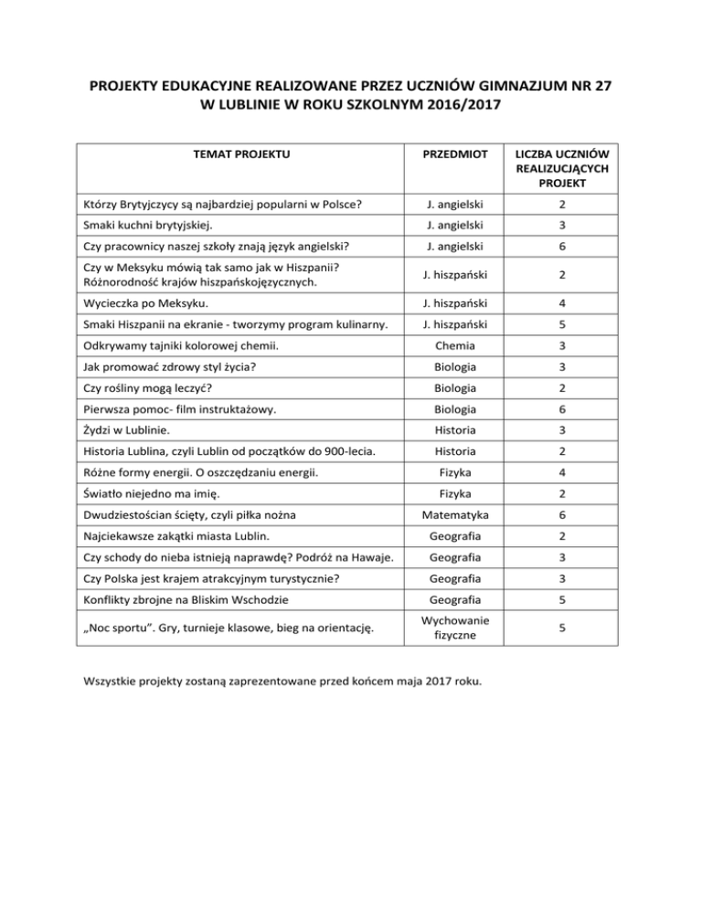 PROJEKTY EDUKACYJNE REALIZOWANE PRZEZ UCZNIÓW GIMNAZJUM NR 27 W LUBLINIE W ROKU SZKOLNYM 2016/2017 TEMAT PROJEKTU PRZEDMIOT LICZBA UCZNIÓW REALIZUCJĄCYCH PROJEKT Którzy Brytyjczycy są najbardziej popularni w Polsce? J. angielski 2 Smaki kuchni brytyjskiej. J. angielski 3 Czy pracownicy naszej szkoły znają język angielski? J. angielski 6 Czy w Meksyku mówią tak samo jak w Hiszpanii? Różnorodność krajów hiszpańskojęzycznych. J. hiszpański 2 Wycieczka po Meksyku. J. hiszpański 4 Smaki Hiszpanii na ekranie - tworzymy program kulinarny. J. hiszpański 5 Odkrywamy tajniki kolorowej chemii. Chemia 3 Jak promować zdrowy styl życia? Biologia 3 Czy rośliny mogą leczyć? Biologia 2 Pierwsza pomoc- film instruktażowy. Biologia 6 Żydzi w Lublinie. Historia 3 Historia Lublina, czyli Lublin od początków do 900-lecia. Historia 2 Różne formy energii. O oszczędzaniu energii. Fizyka 4 Światło niejedno ma imię. Fizyka 2 Matematyka 6 Najciekawsze zakątki miasta Lublin. Geografia 2 Czy schody do nieba istnieją naprawdę? Podróż na Hawaje. Geografia 3 Czy Polska jest krajem atrakcyjnym turystycznie? Geografia 3 Konflikty zbrojne na Bliskim Wschodzie Geografia 5 Wychowanie fizyczne 5 Dwudziestościan ścięty, czyli piłka nożna „Noc sportu”. Gry, turnieje klasowe, bieg na orientację. Wszystkie projekty zostaną zaprezentowane przed końcem maja 2017 roku.